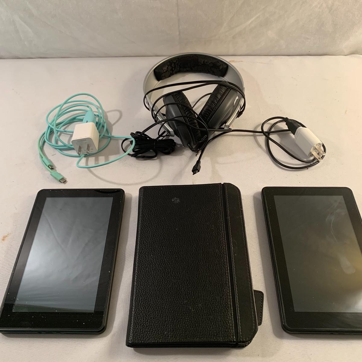 Load these Kindles up with your favorite reading material! Available are three kindles and a pair of Sennheiser headphones. The two black and case-less kindles are D01400 models. This lot includes charging cables as well. These kindles were plugged into charge, only the black charger appears to work due to the fact that only the kindle using the black charger was charged and powered on after a period of time.