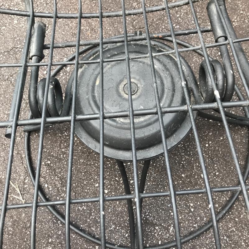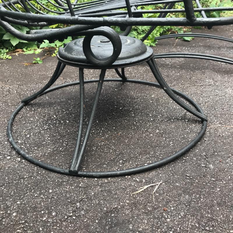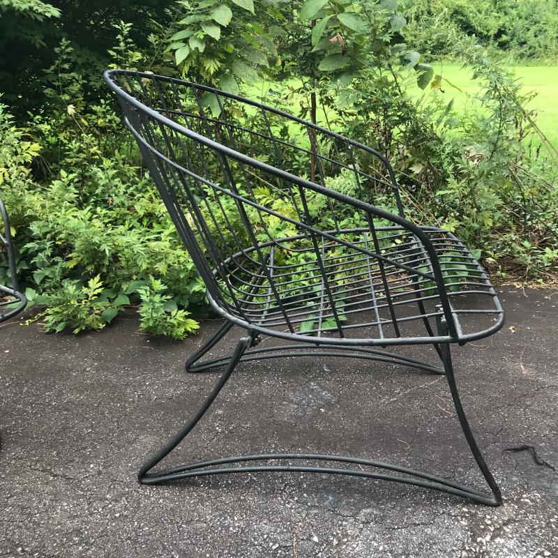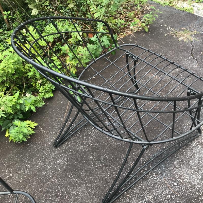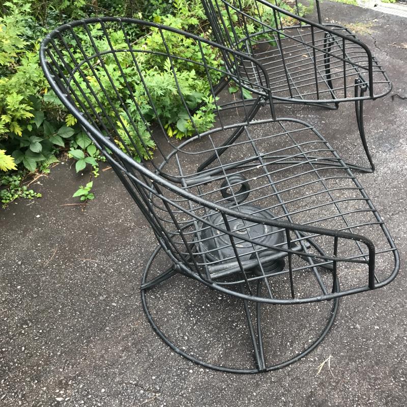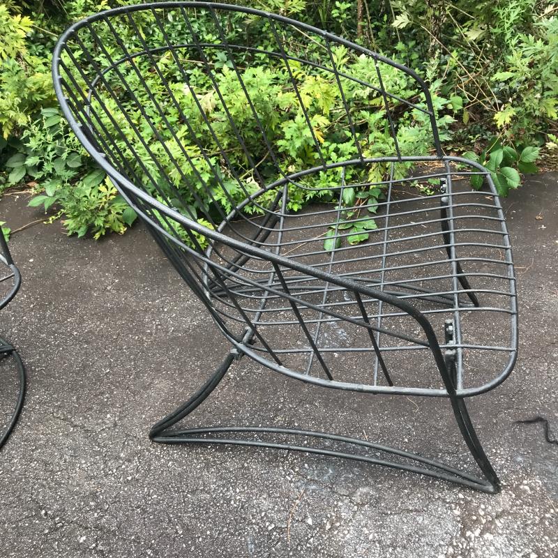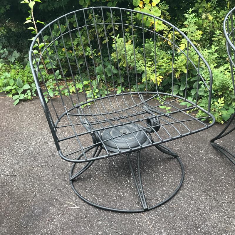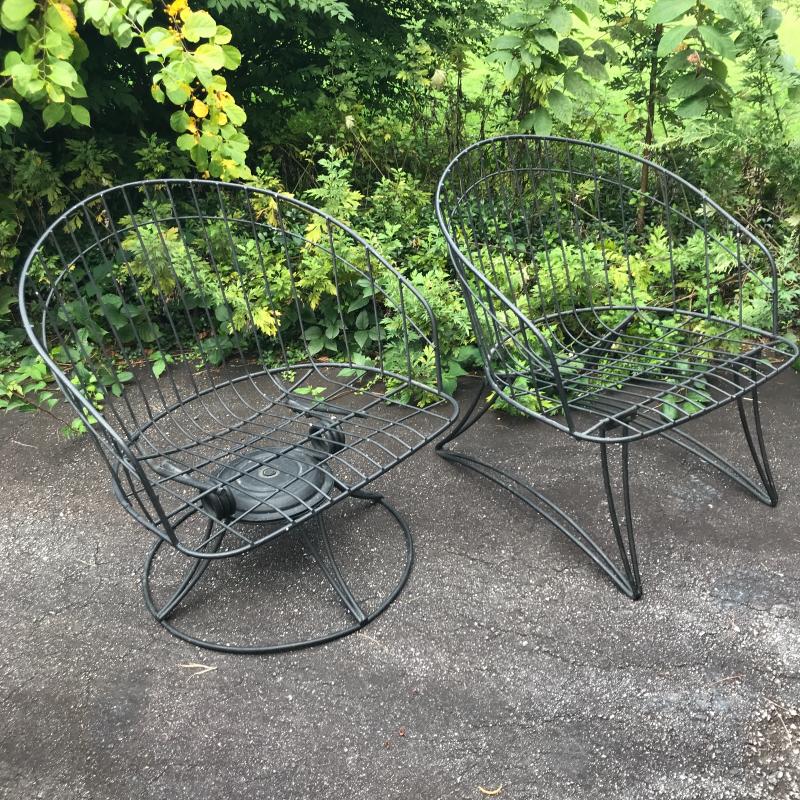 Two black Metal mid century modern chairs by Homecrest. Likely 1960s. Do not include cushions. One chair is a bouncy swivel (26” x 24” x 28”) and the other is static (26” x 25” x 28”) Great condition! No shipping. Local Pick Up Only.