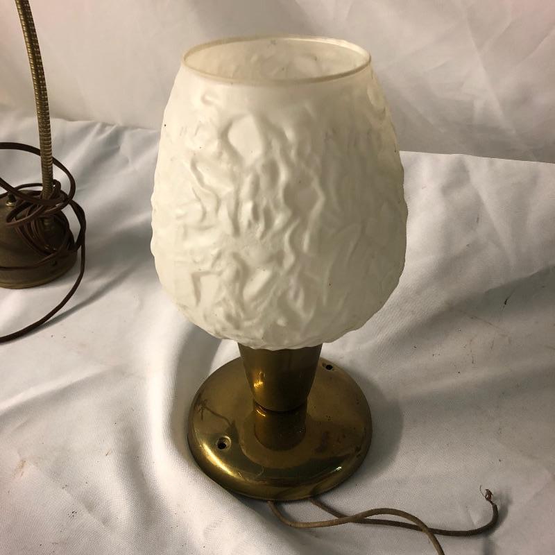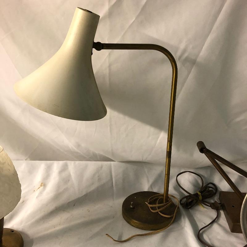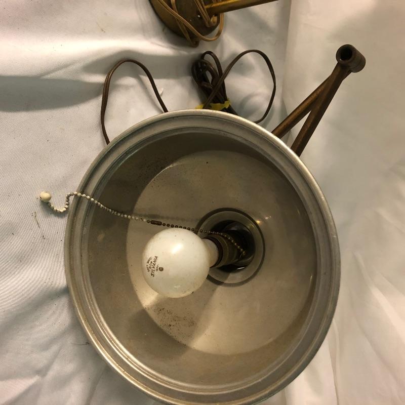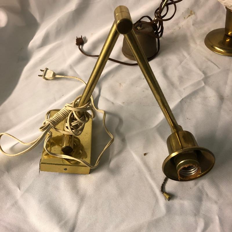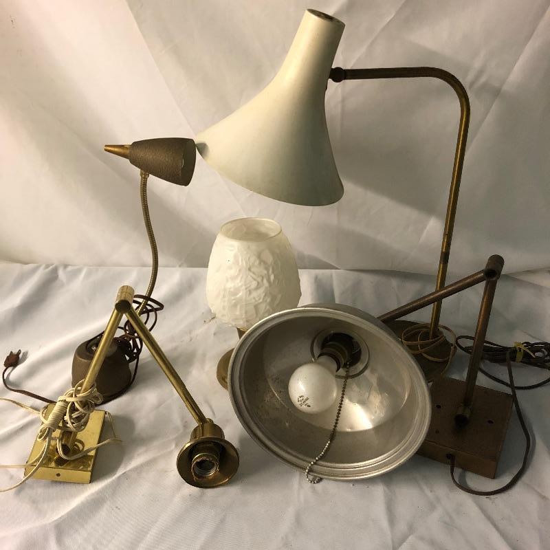We have a really cool assortment of vintage lights for you here. A total of five lights that includes a brass wall mount light, a small retro desk lamp, a vintage aluminum shop type wall mount light and more. Look closely at our images as the two lamps with white shades do not have plugs wired. All the lights were tested and didn’t work, this could be that they just need new bulbs?