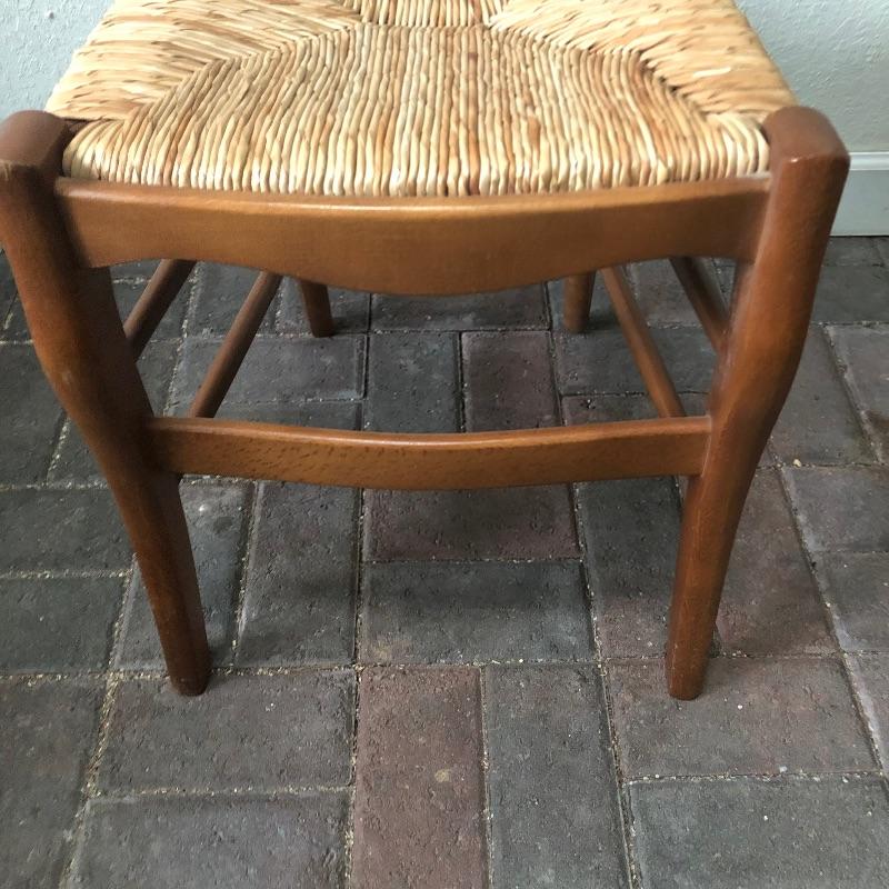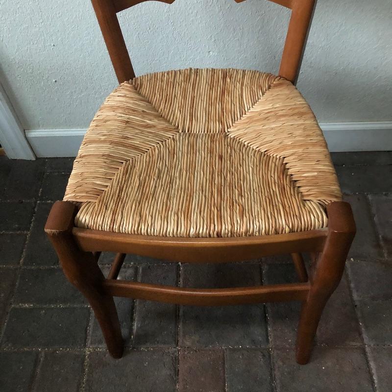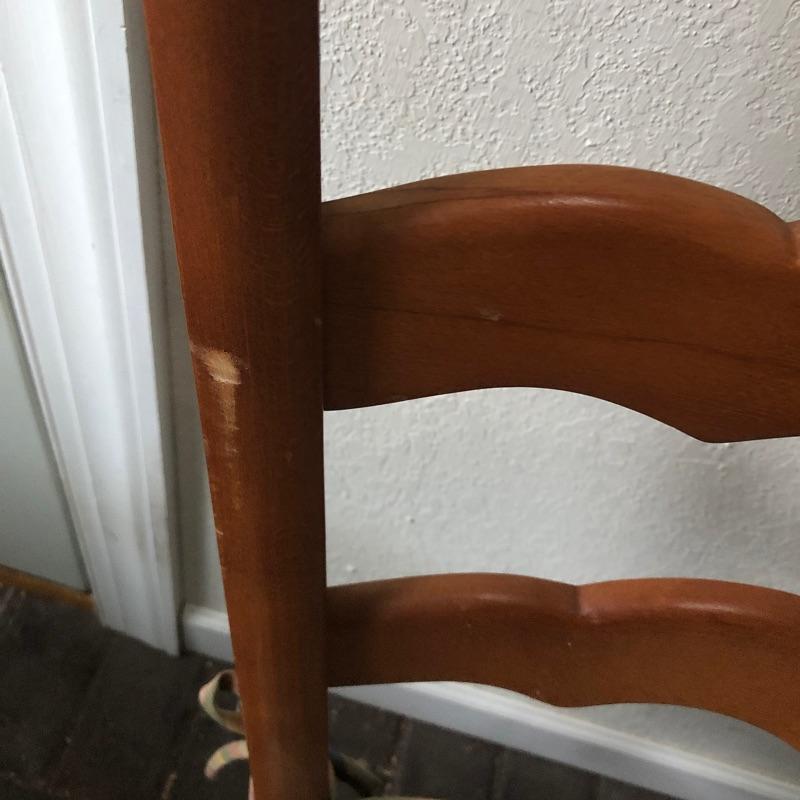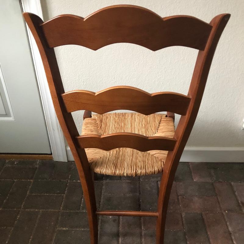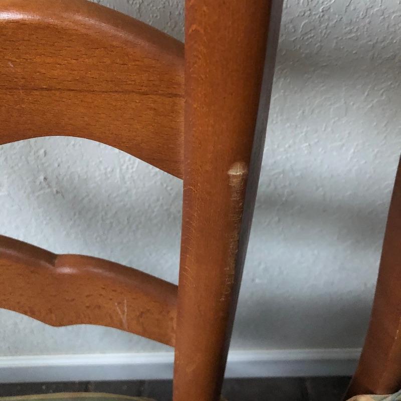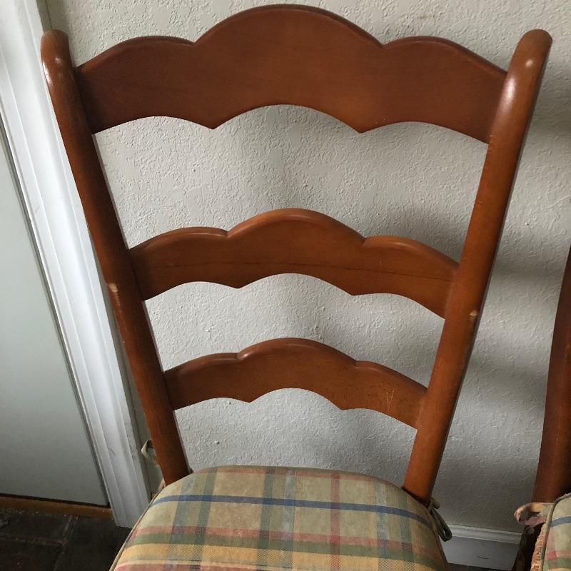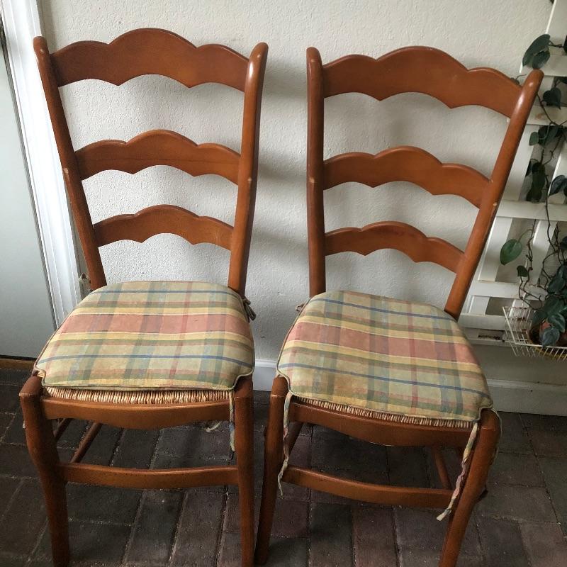 2 matching walnut colored wood ladder back chairs with wicker seats and matching seat cushions. Both chairs have minor scuffs in the same place see photos. Each chair measures 18” x 15” x 39”. Local Pickup only.