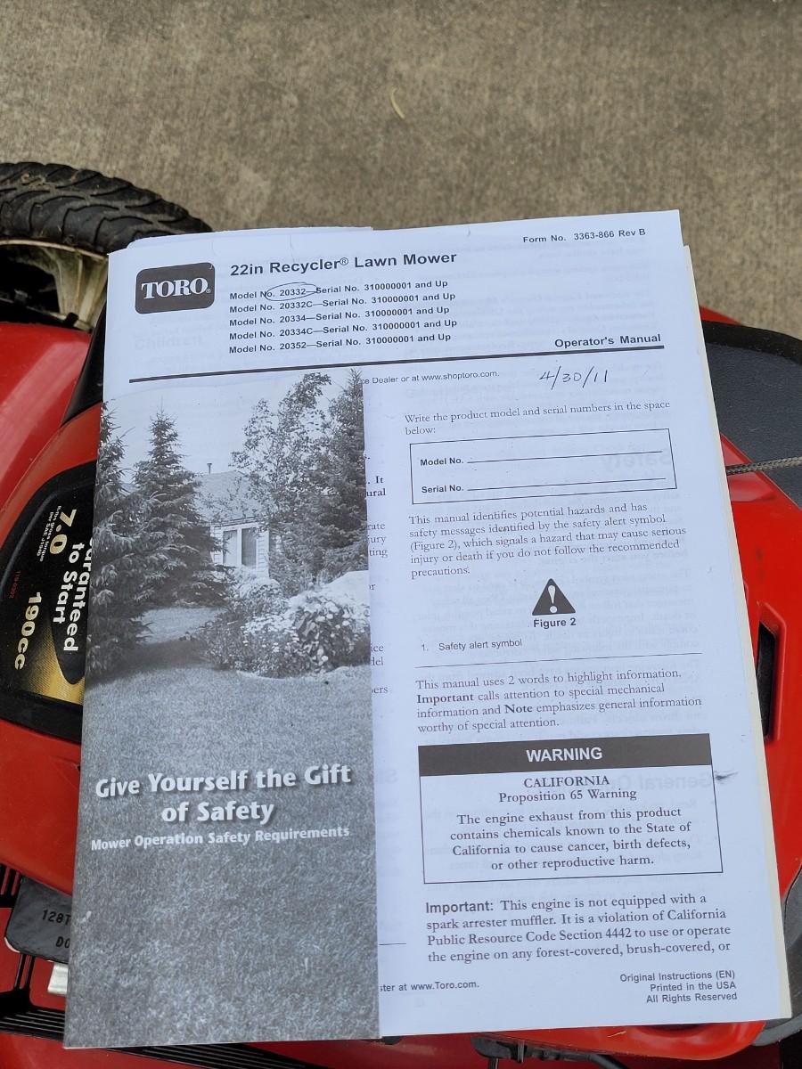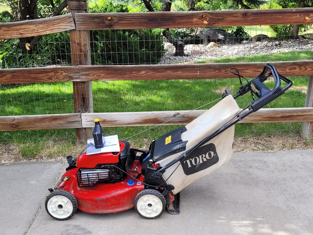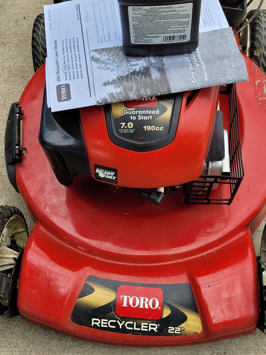 Lot 294: Toro 22" Recycler Lawn Mower with Manual. Small Engine Oil and 1 gallon Gas Can- Does not turn on and has a gas leak