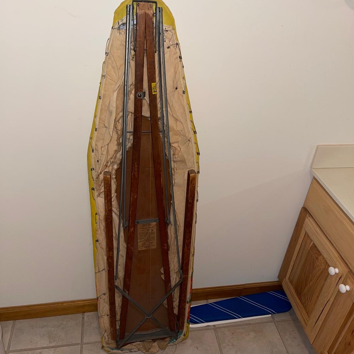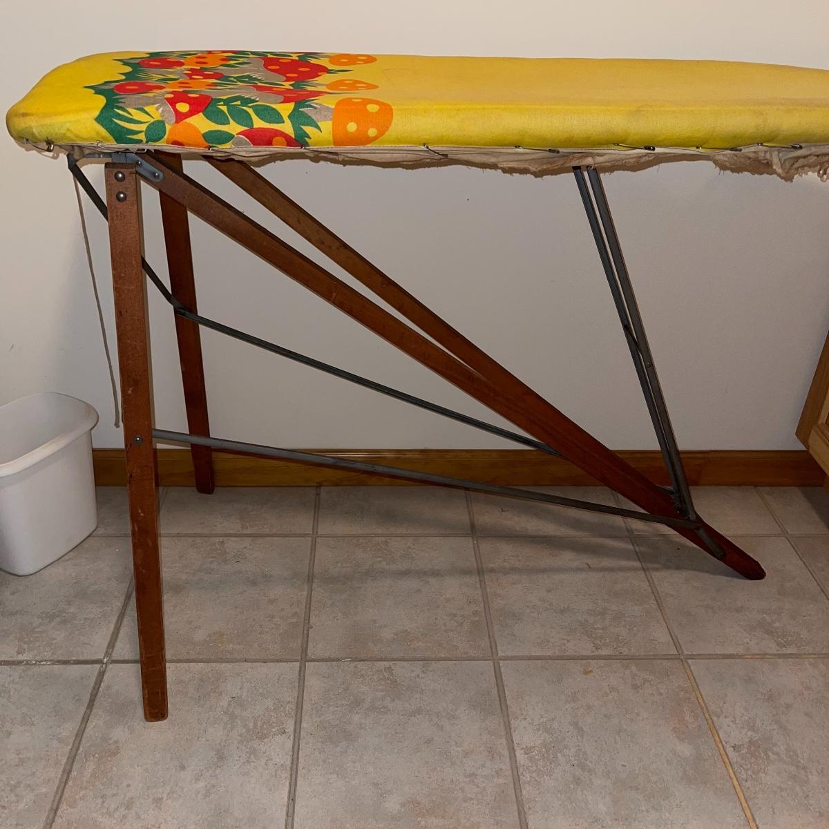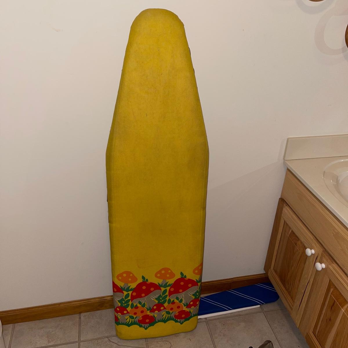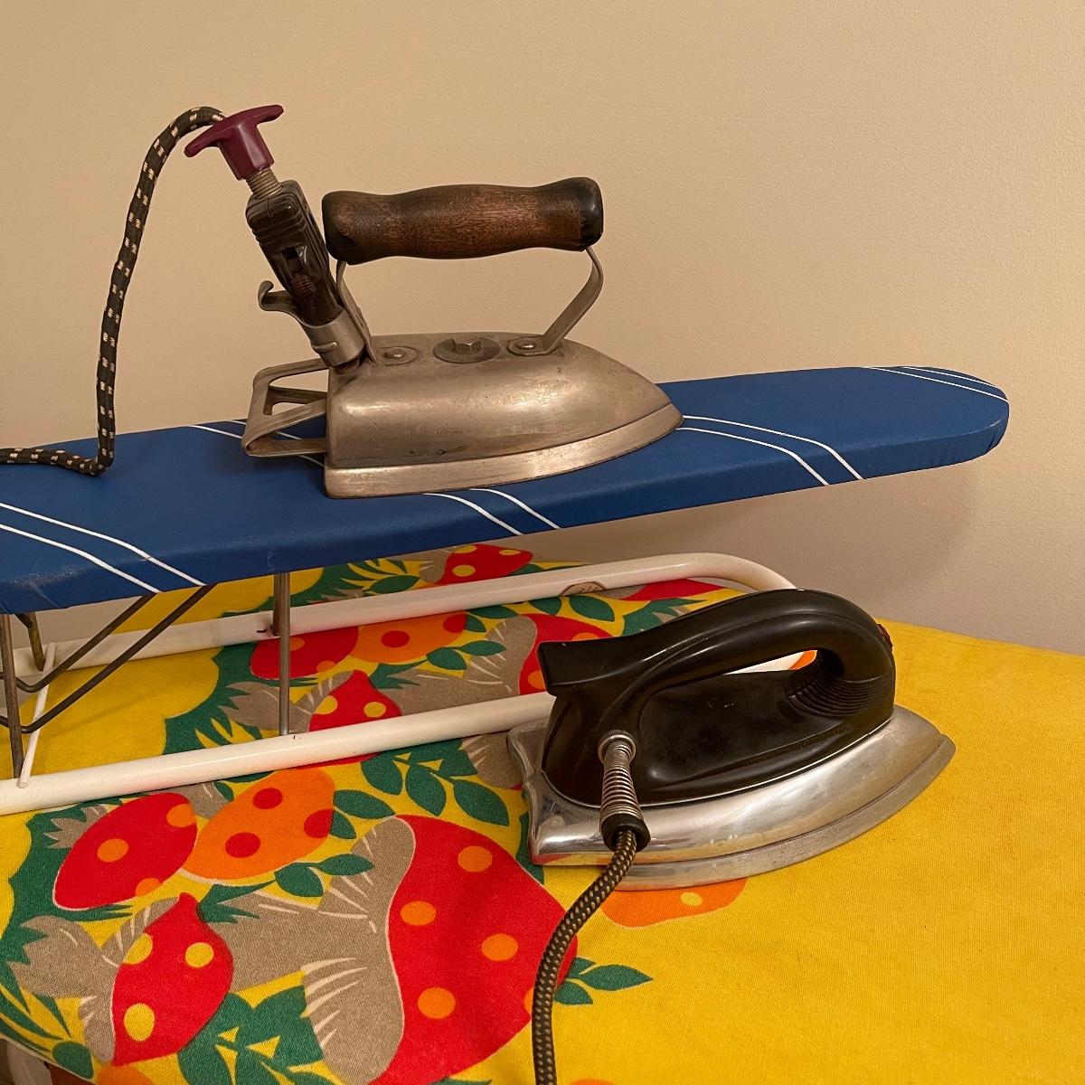 Time to iron with this antique ironing board with a yellow mushroom fabric, wooden legs, and metal hardware. It stands 33.5 inches tall when standing and 54.5 inches long. Also included is a mini 21.5 inch long blue ironing board and two old school irons. One of the irons is a model A-4 Ironmaster Sunbeam and has a three pronged wall plug. The second iron has no brand names but it has a wooden handle and a two pronged wall plug.
