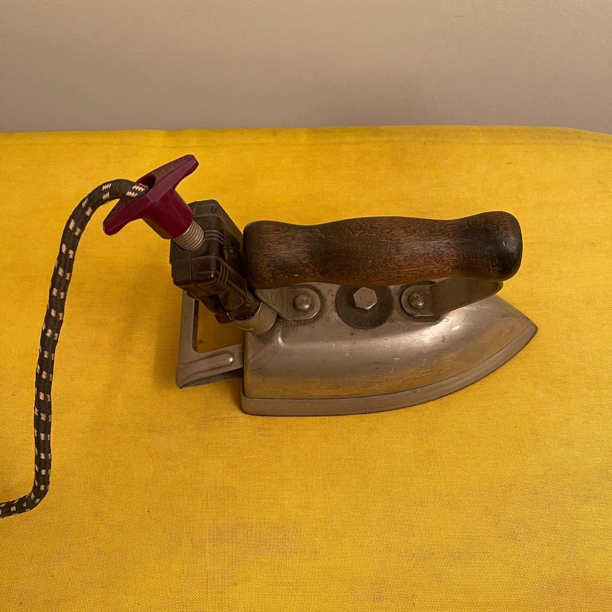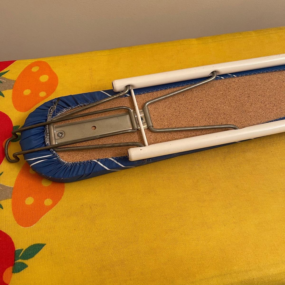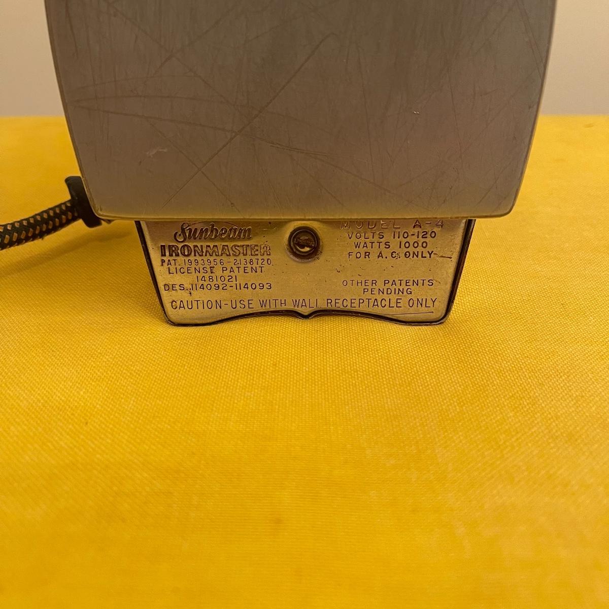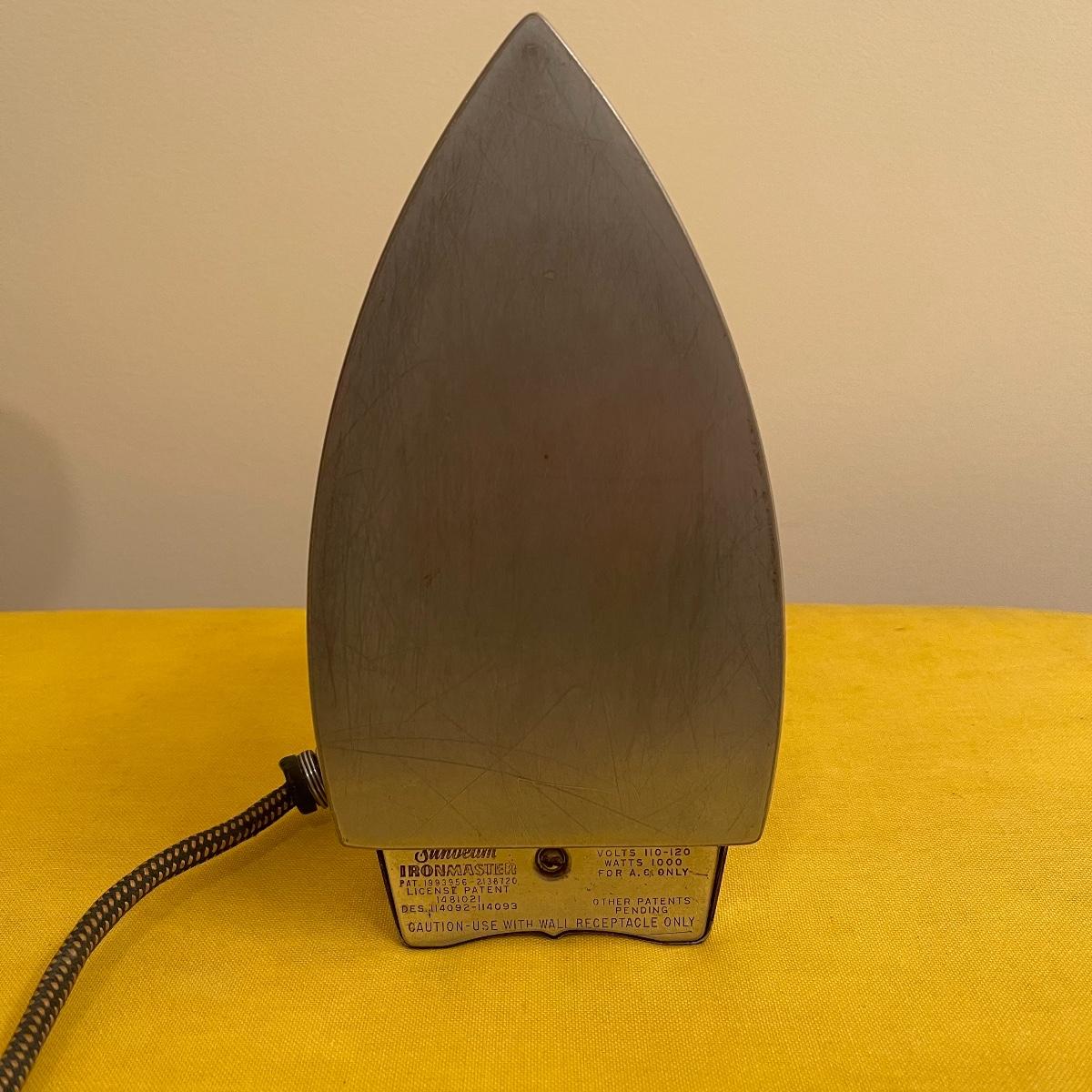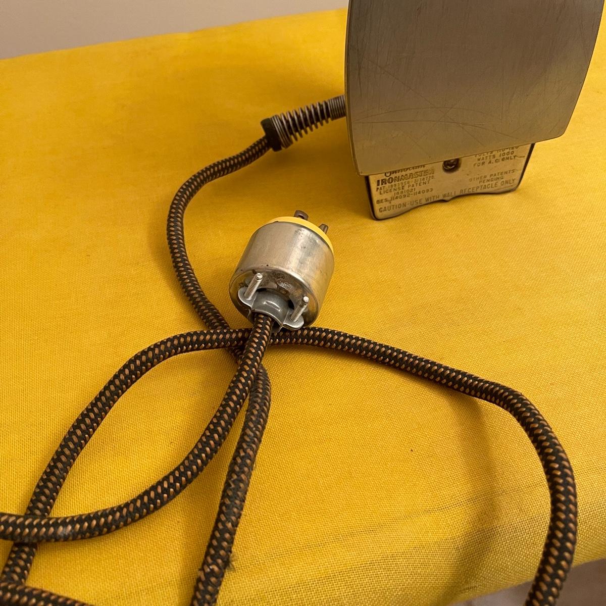 Time to iron with this antique ironing board with a yellow mushroom fabric, wooden legs, and metal hardware. It stands 33.5 inches tall when standing and 54.5 inches long. Also included is a mini 21.5 inch long blue ironing board and two old school irons. One of the irons is a model A-4 Ironmaster Sunbeam and has a three pronged wall plug. The second iron has no brand names but it has a wooden handle and a two pronged wall plug.