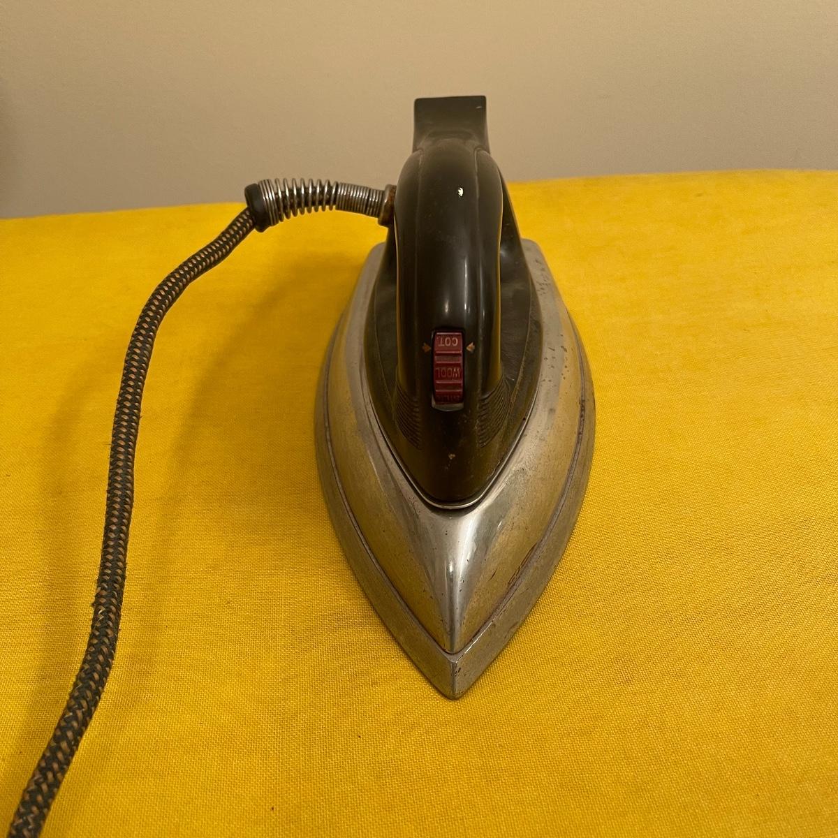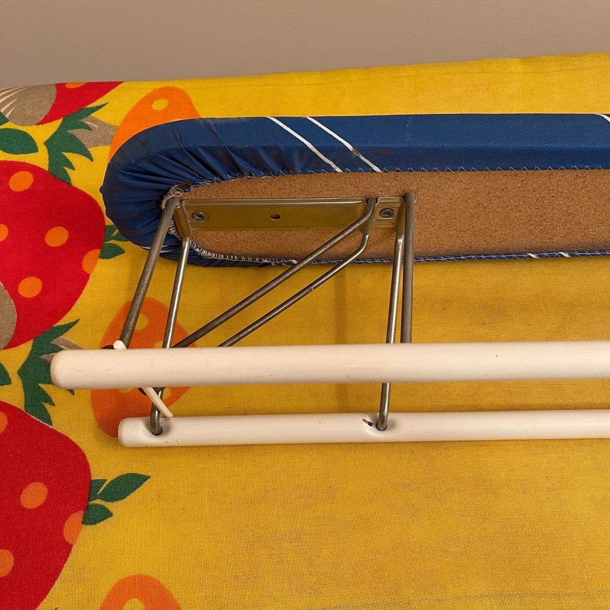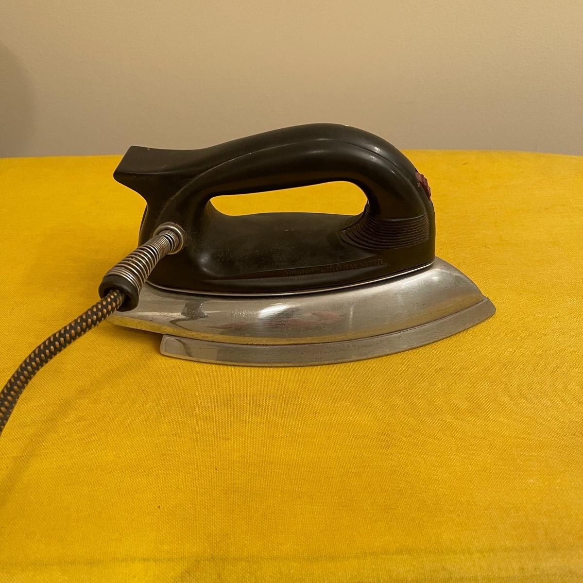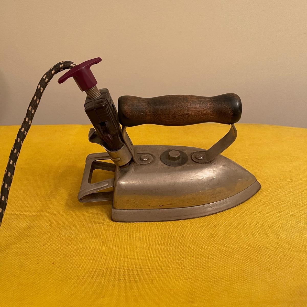Time to iron with this antique ironing board with a yellow mushroom fabric, wooden legs, and metal hardware. It stands 33.5 inches tall when standing and 54.5 inches long. Also included is a mini 21.5 inch long blue ironing board and two old school irons. One of the irons is a model A-4 Ironmaster Sunbeam and has a three pronged wall plug. The second iron has no brand names but it has a wooden handle and a two pronged wall plug.