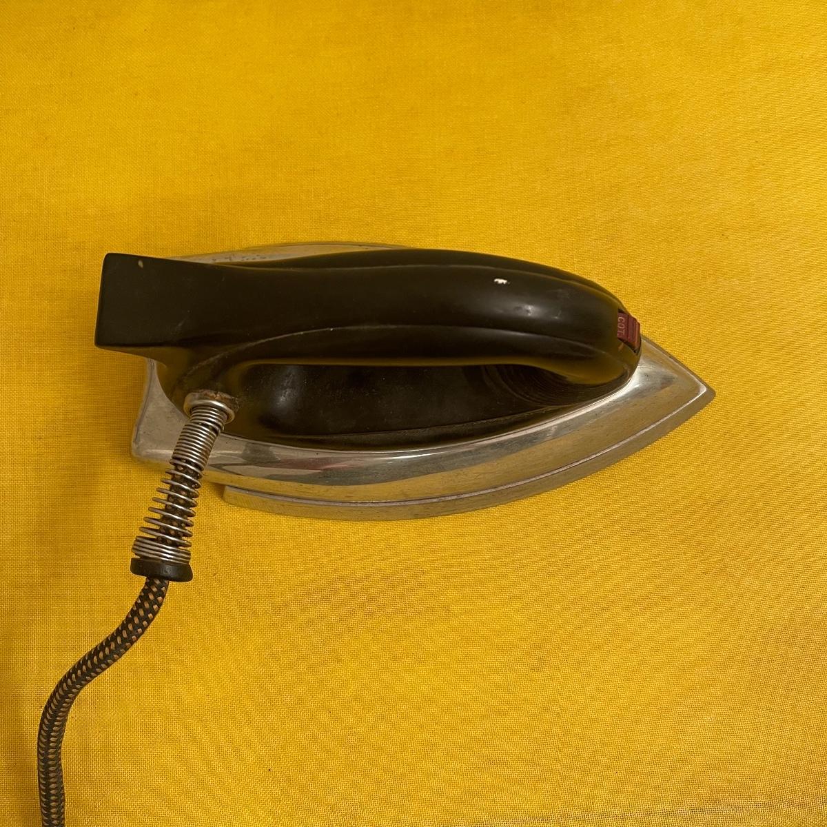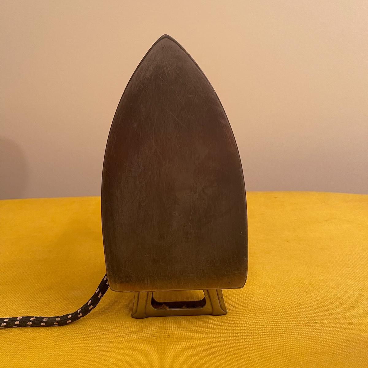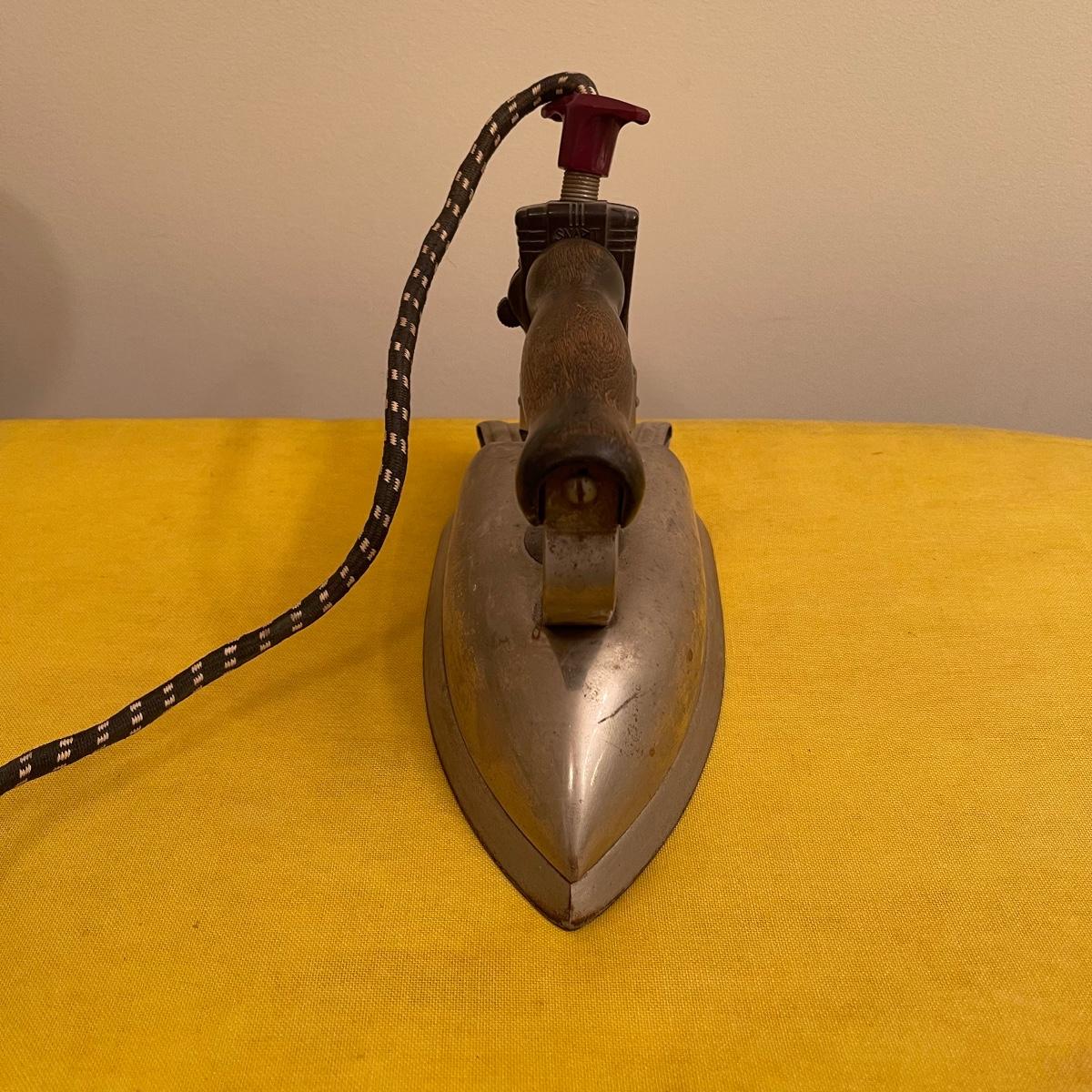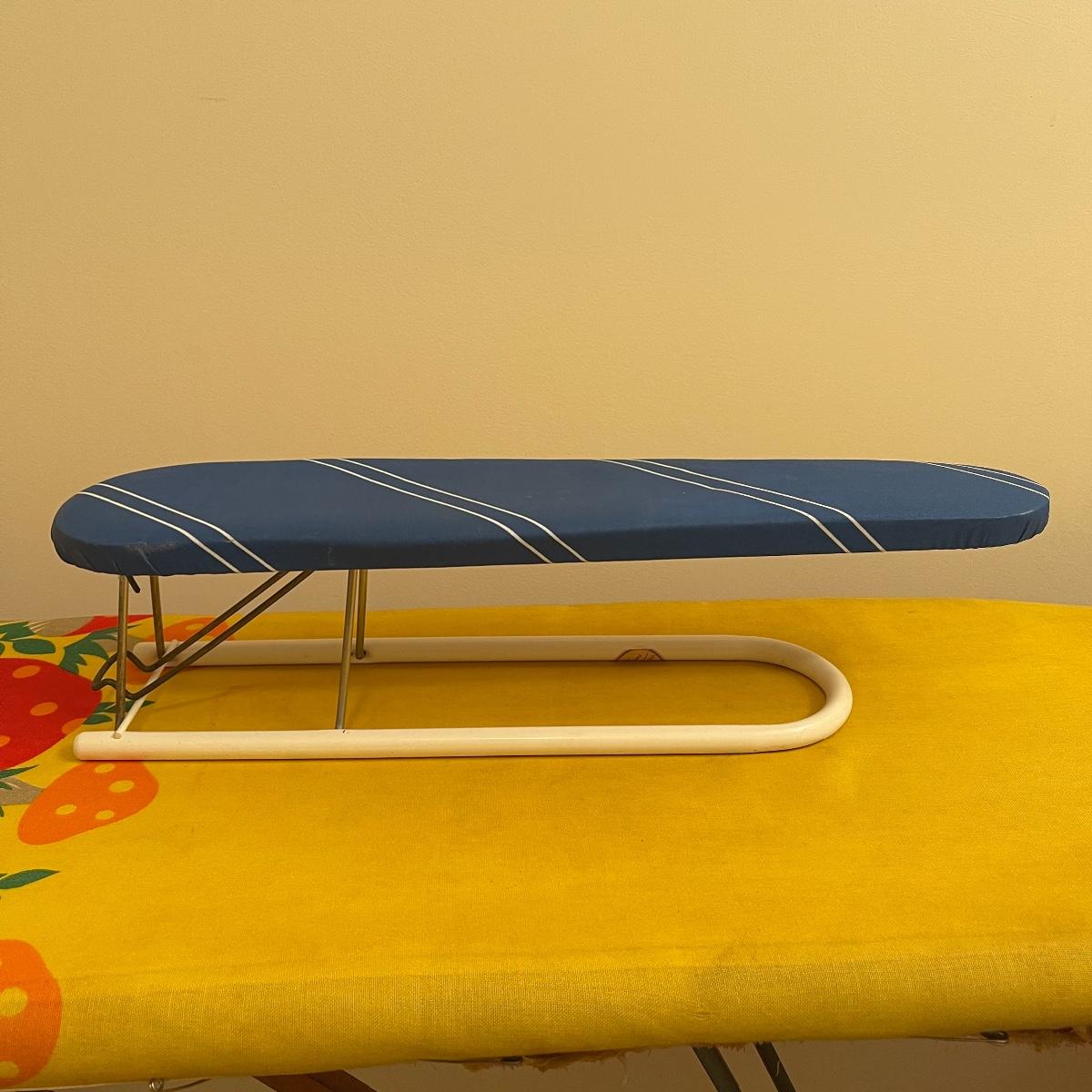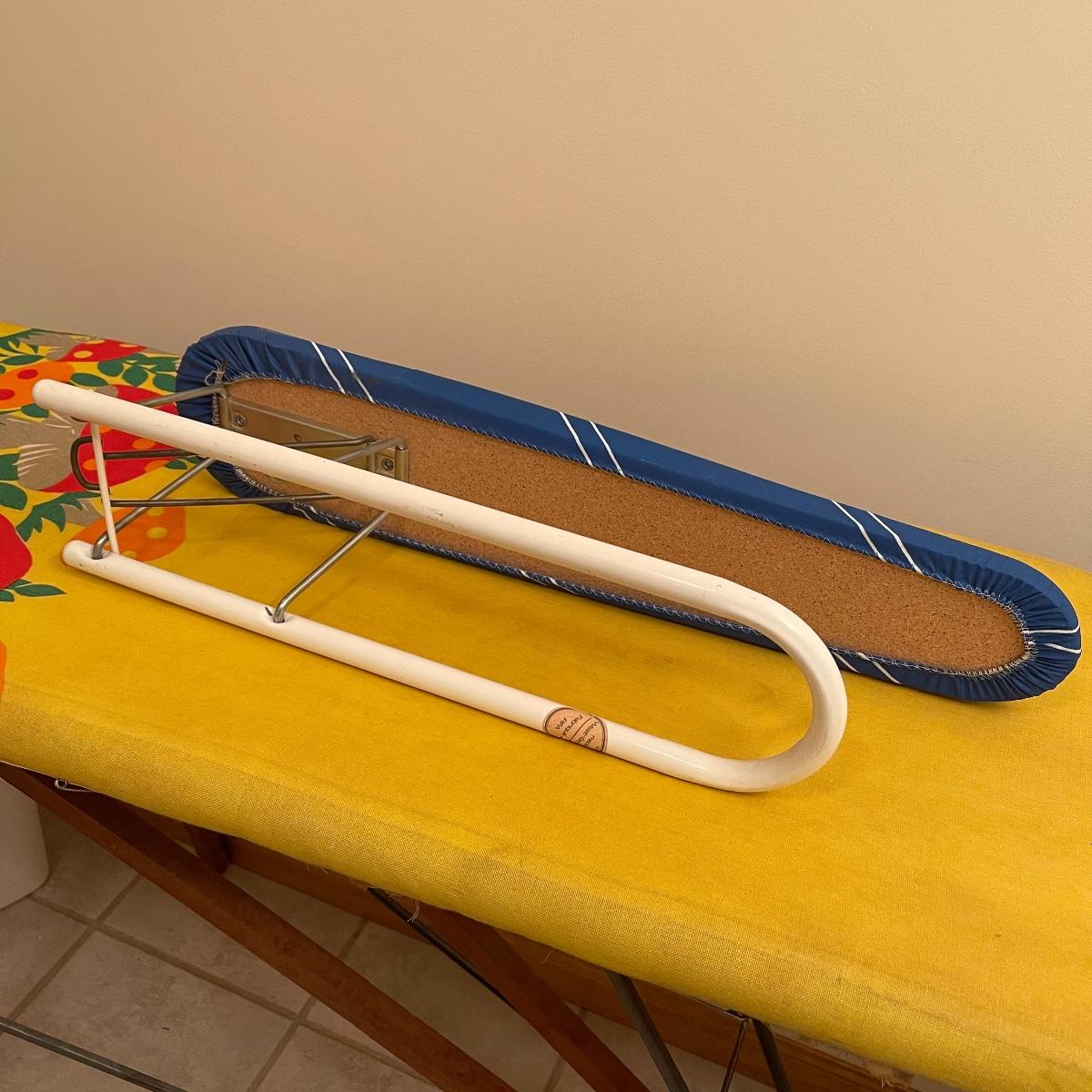 Time to iron with this antique ironing board with a yellow mushroom fabric, wooden legs, and metal hardware. It stands 33.5 inches tall when standing and 54.5 inches long. Also included is a mini 21.5 inch long blue ironing board and two old school irons. One of the irons is a model A-4 Ironmaster Sunbeam and has a three pronged wall plug. The second iron has no brand names but it has a wooden handle and a two pronged wall plug.