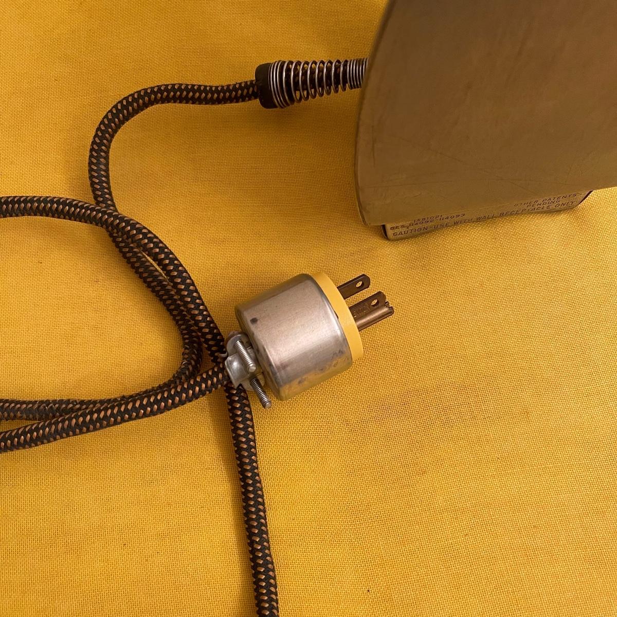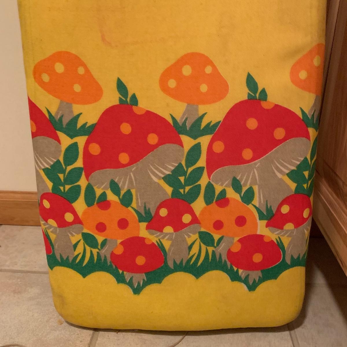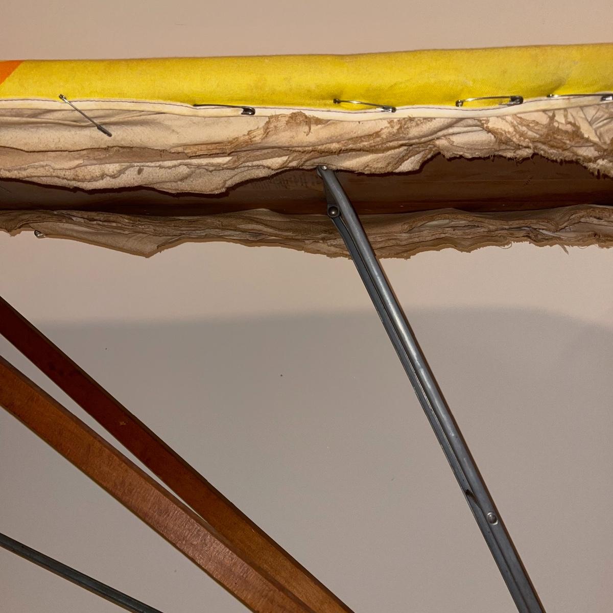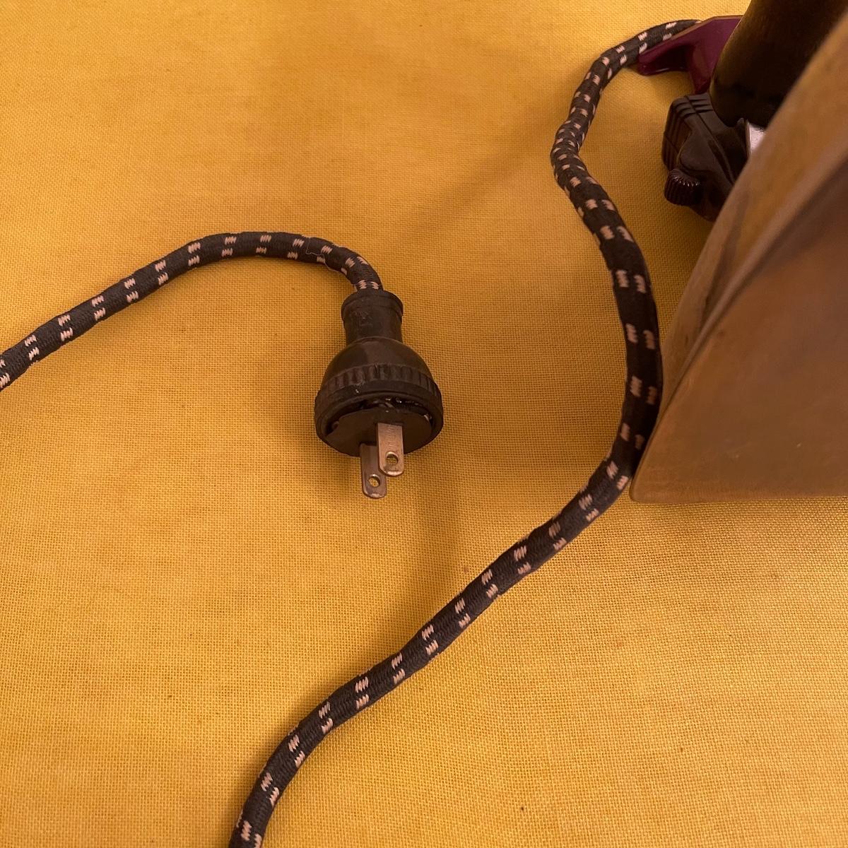 Time to iron with this antique ironing board with a yellow mushroom fabric, wooden legs, and metal hardware. It stands 33.5 inches tall when standing and 54.5 inches long. Also included is a mini 21.5 inch long blue ironing board and two old school irons. One of the irons is a model A-4 Ironmaster Sunbeam and has a three pronged wall plug. The second iron has no brand names but it has a wooden handle and a two pronged wall plug.