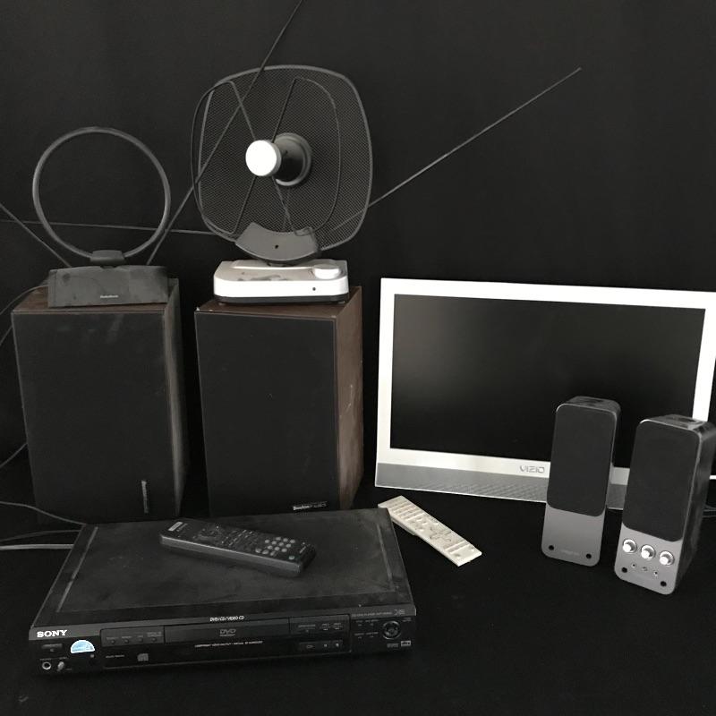 This lot contains all the basics: a Vizeo flatscreen tv, two sets of speakers, a Sony DVD player, a digital HGTV antenas and another antenna. See pics. Local pickup only.