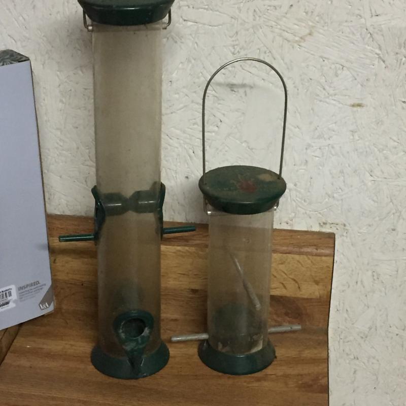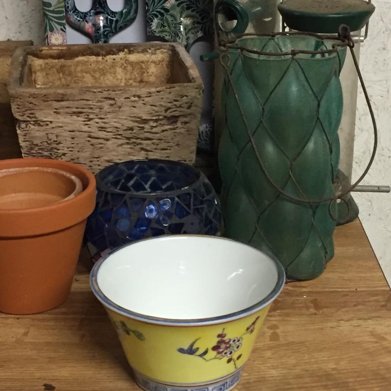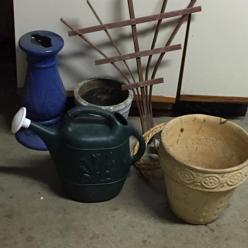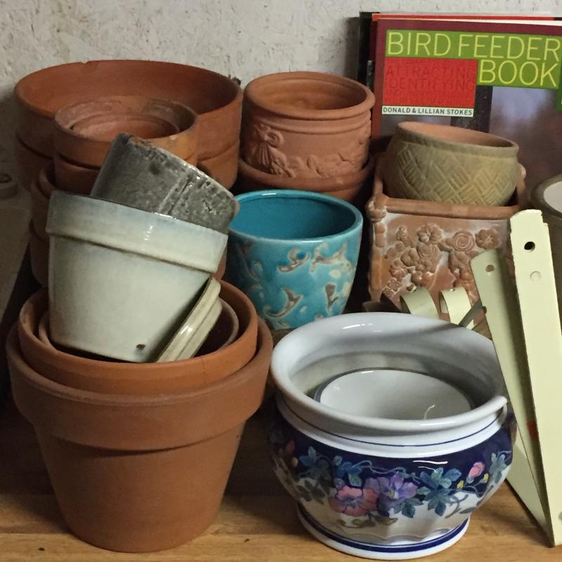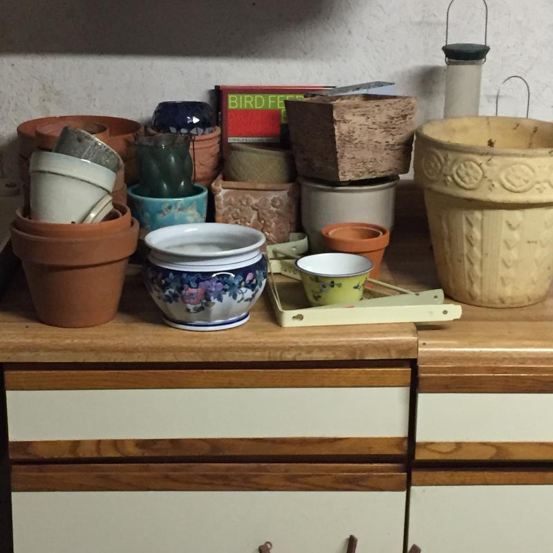 Large Assortment of Flower Pots and Bird Feeders. Largest pot measures 11”Tall. Lot also includes two Droll Yankee Bird Feeders and More. Cabinet not Included.