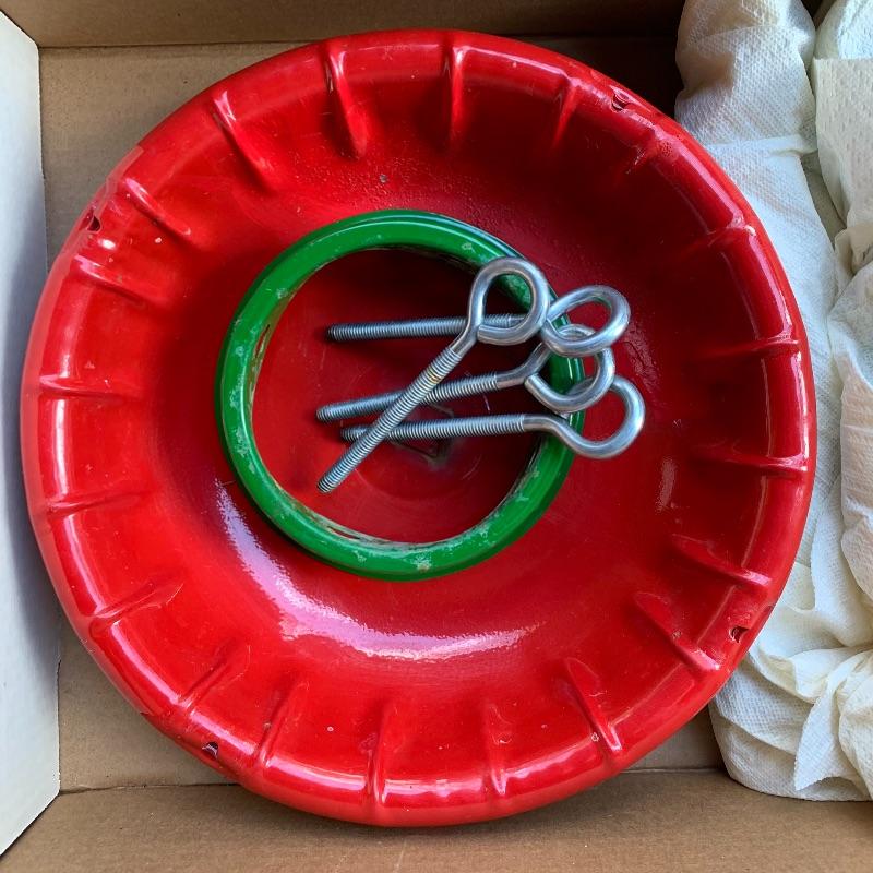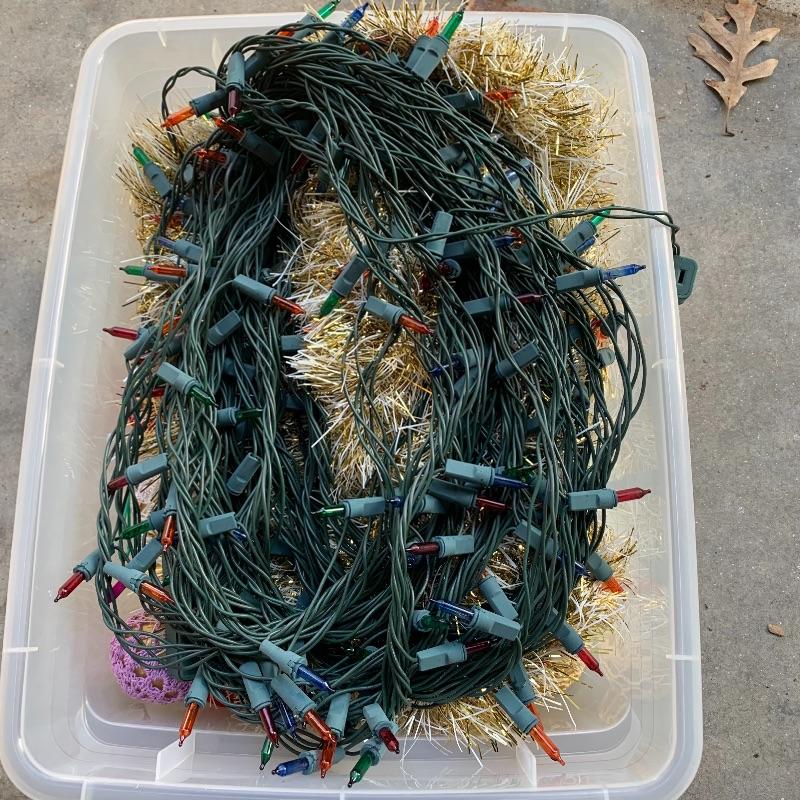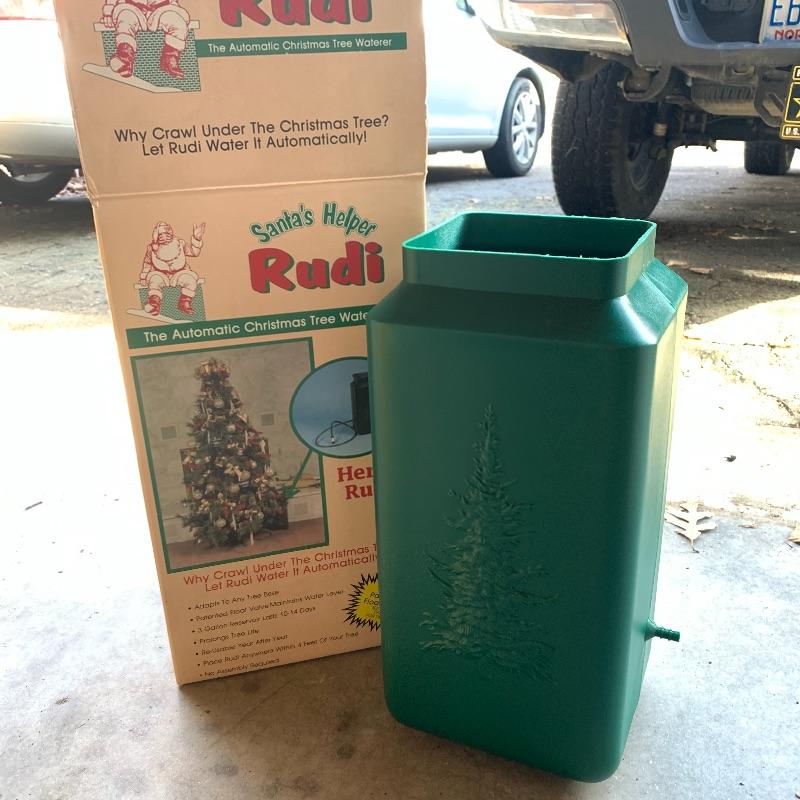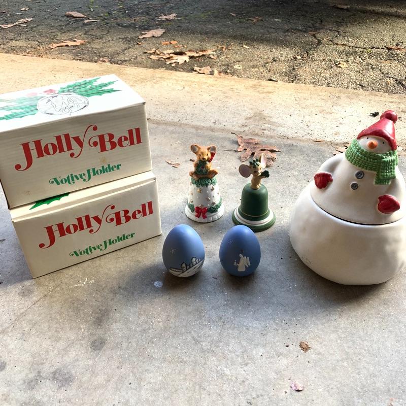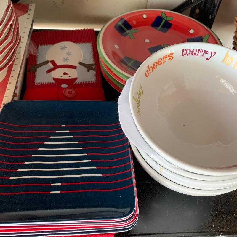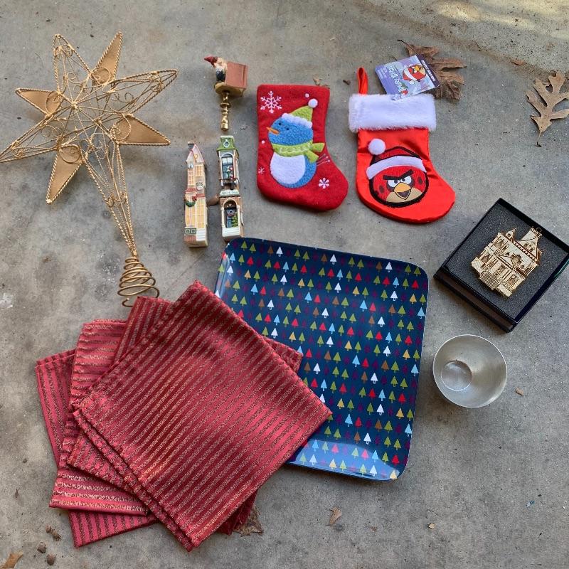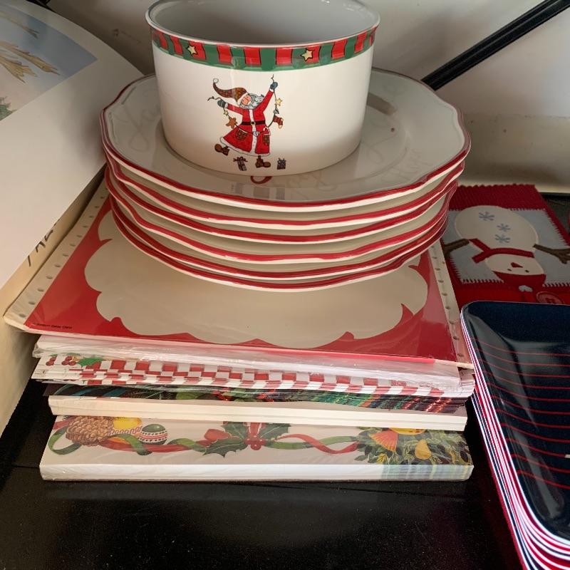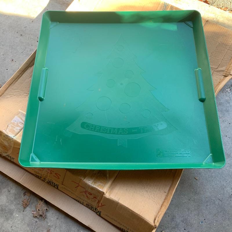 This lot includes an array of Christmas decorations including a tree stand and automatic tree waterer, holiday plates and serving dishes, ornaments, tree lights (worked when tested), a holiday tray, and more. The holiday tray has some small scuffs (see picture). Local pick up only.