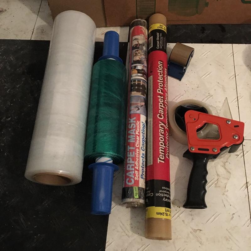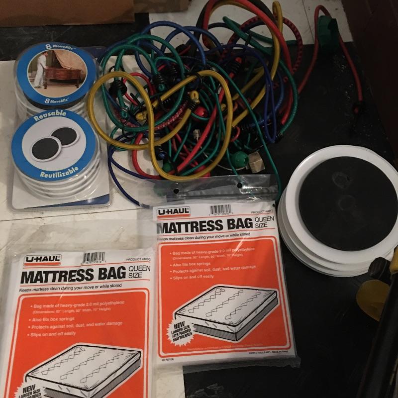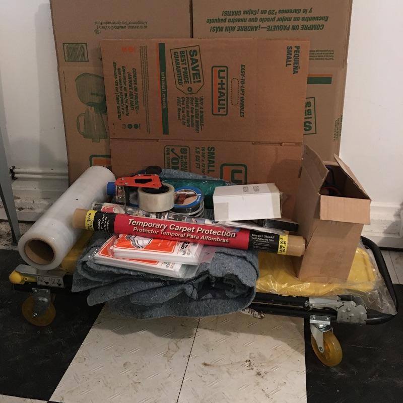 Furniture movers, carpet protector, two mattress bags, plastic, tape gun, moving blanket, cardboard boxes and more. Local pick up only.
