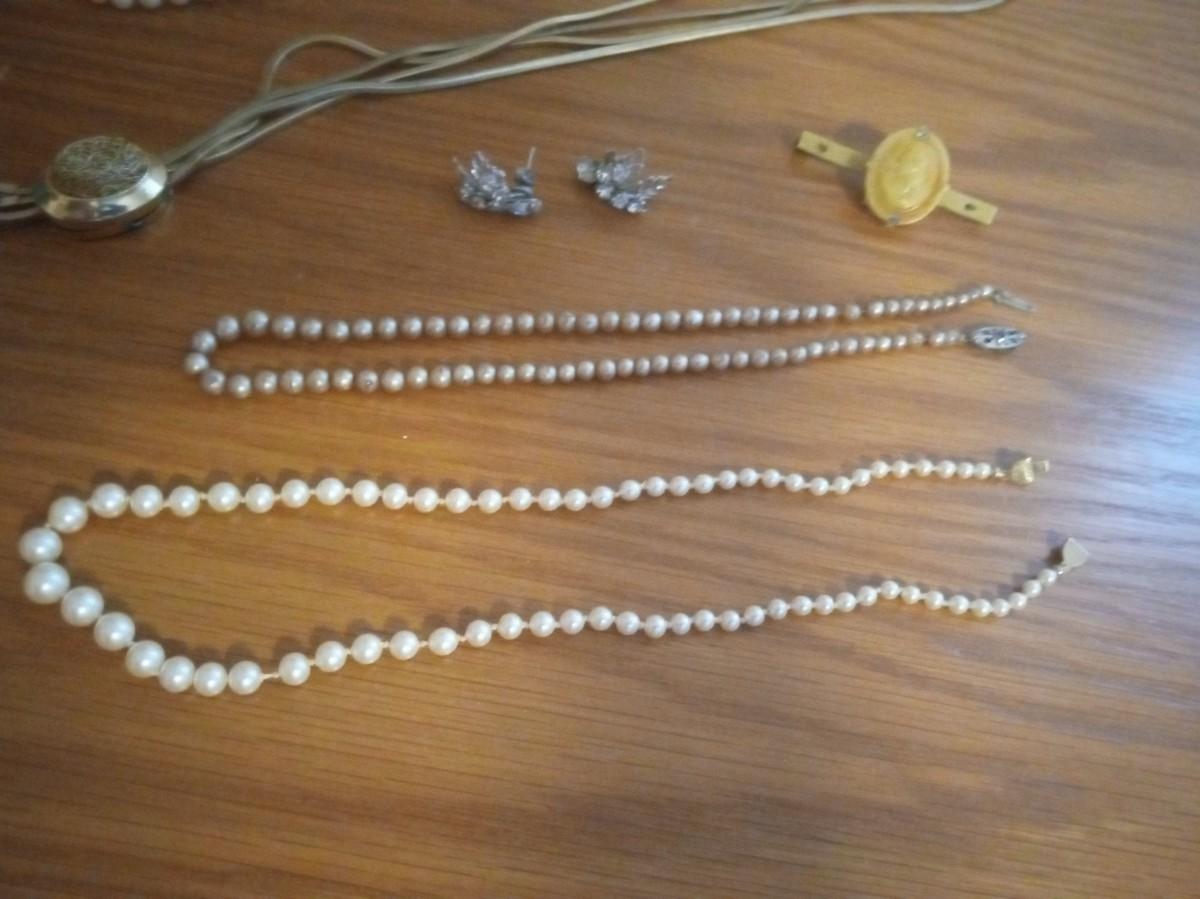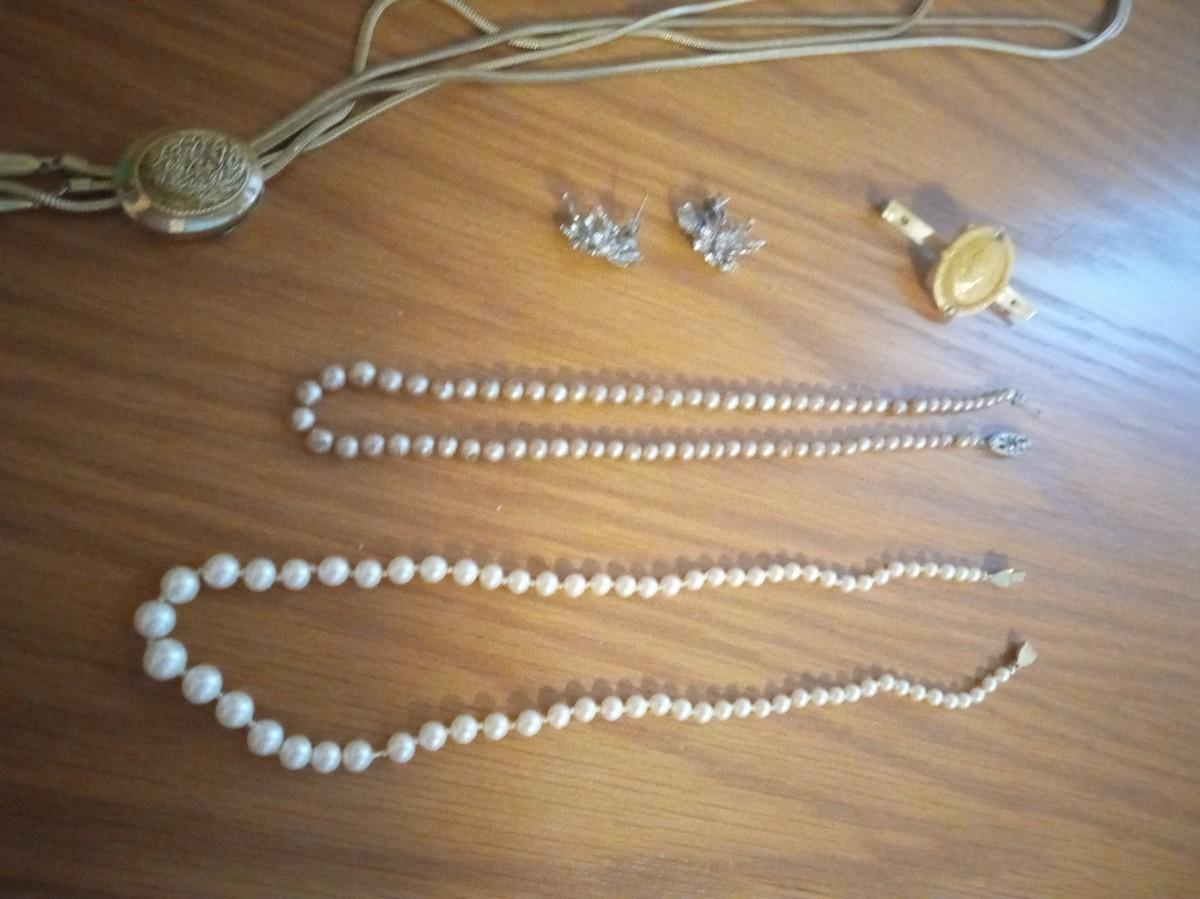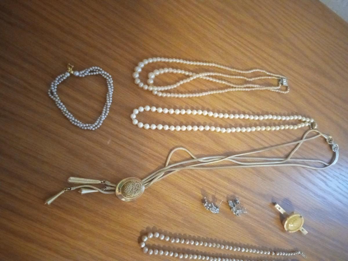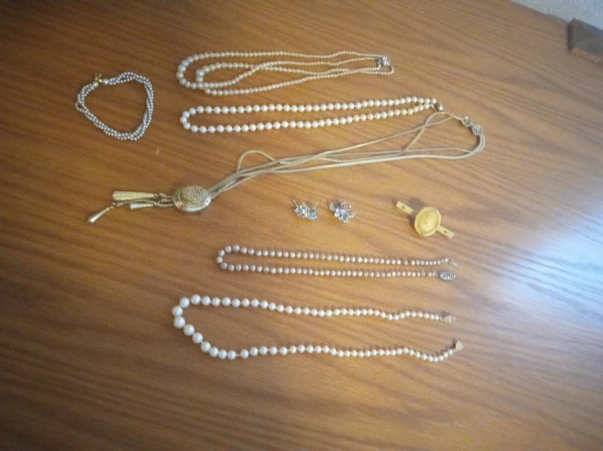 LOT 300 FAUX STRANDS OF PEARLS, PIN, PIERCED EARRINGS AND A BRACELET