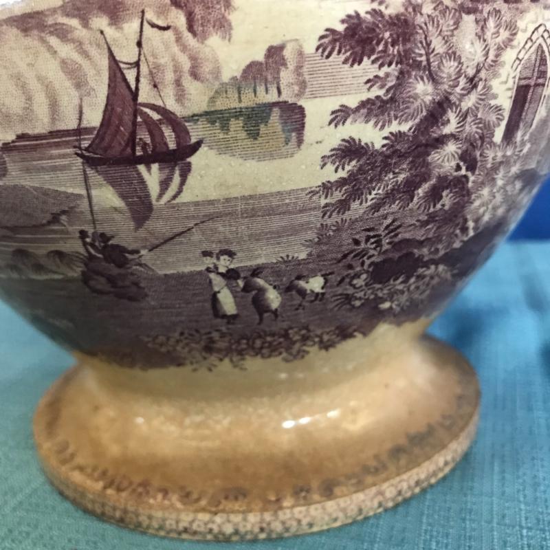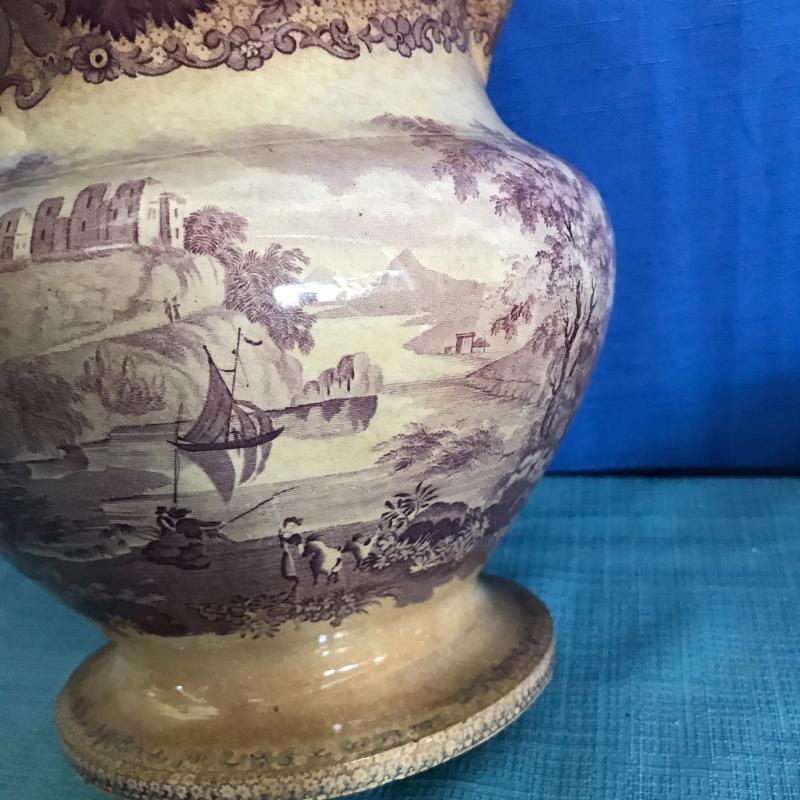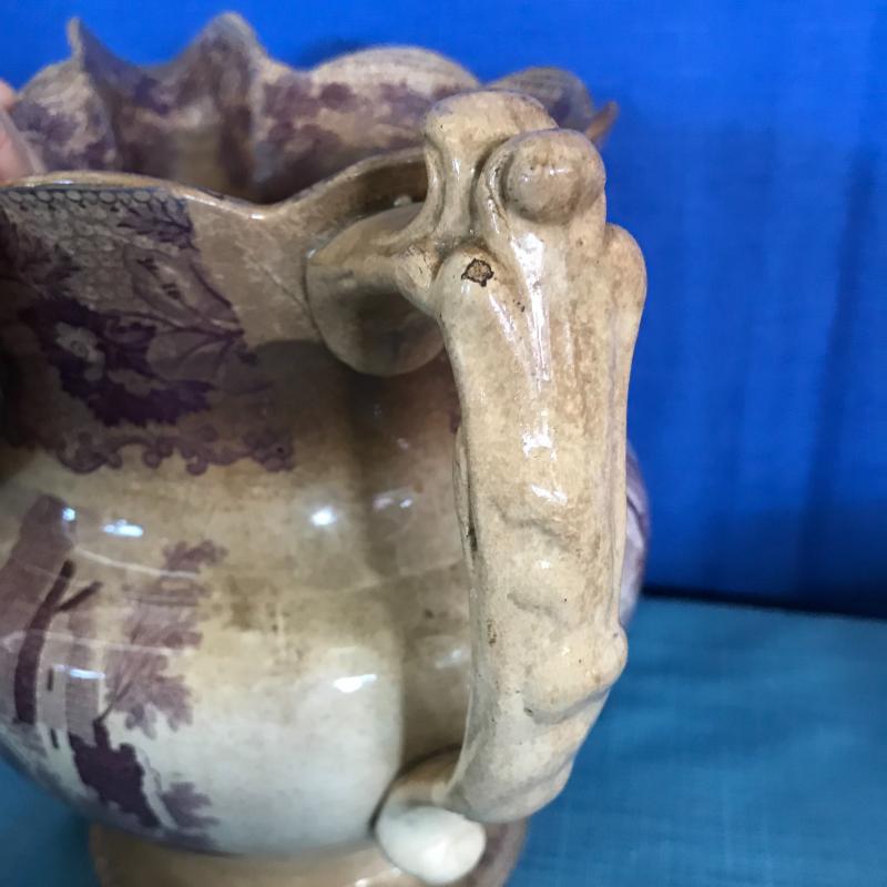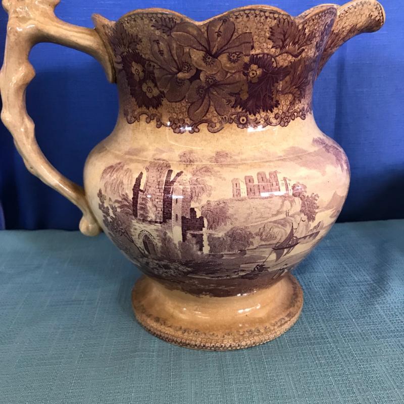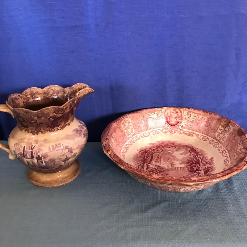 Lot includes two pieces of Transfer Ware from the 1800s. One has purplish print, and the other, pinkish. Bowl is approx. 14” in diameter. Pitcher is approx. 9” tall. Shipping or Local pickup in Maggie Valley, NC.