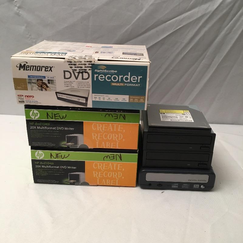 Collection of six DVD writers and one CD writer. Five DVD writers are internal as well as the CD writer and HP is external, but does not have power cord. A great find for someone who builds computers.
