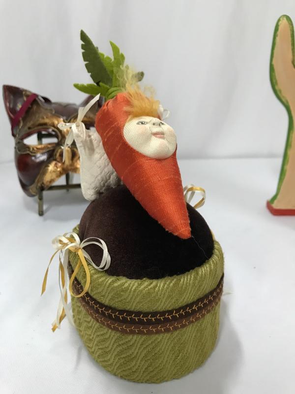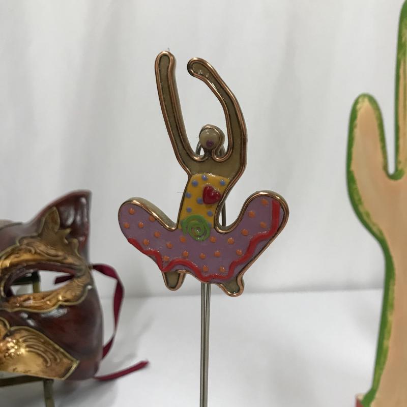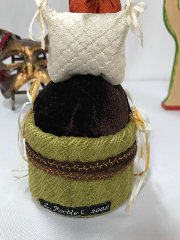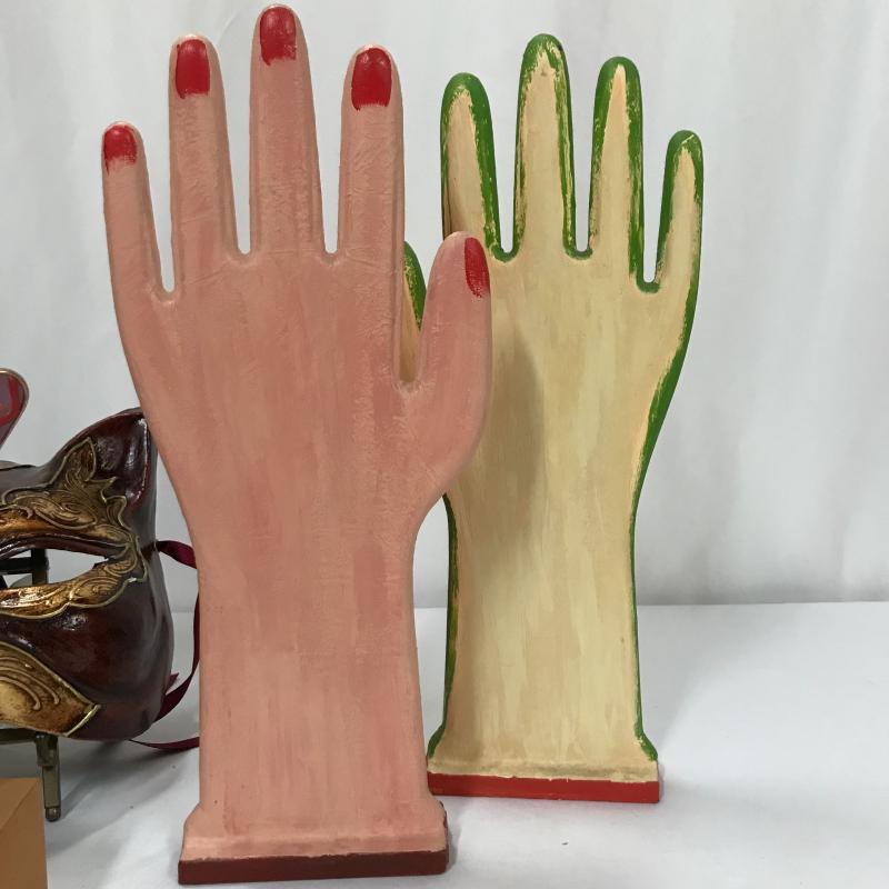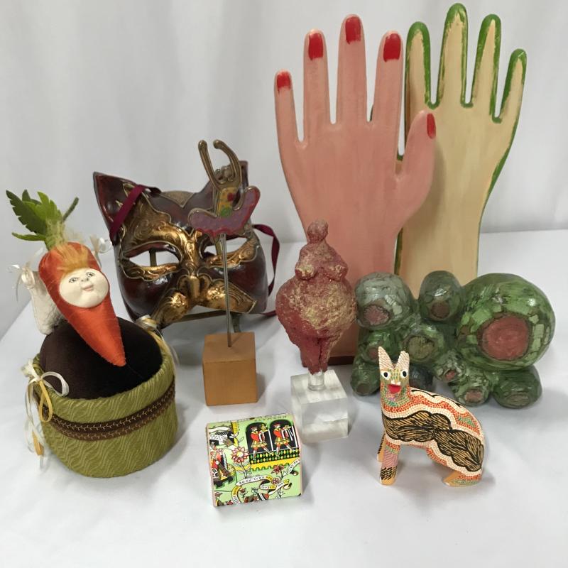 Colorful art pieces. Random lot includes Wall Art, Venetian mask, artsy pin cushion and more. See photos. Hands are 12”tall. Shipping or local pick up in Asheville