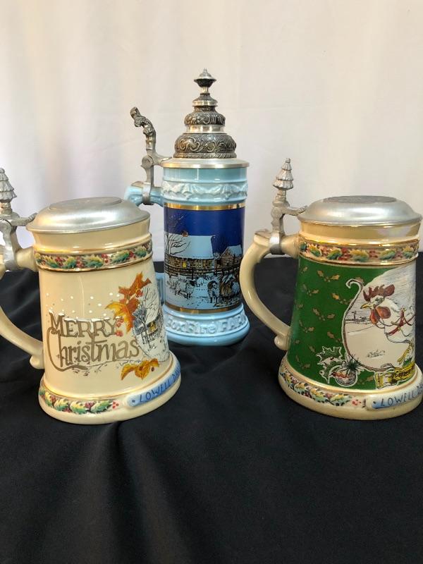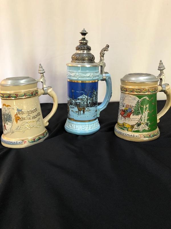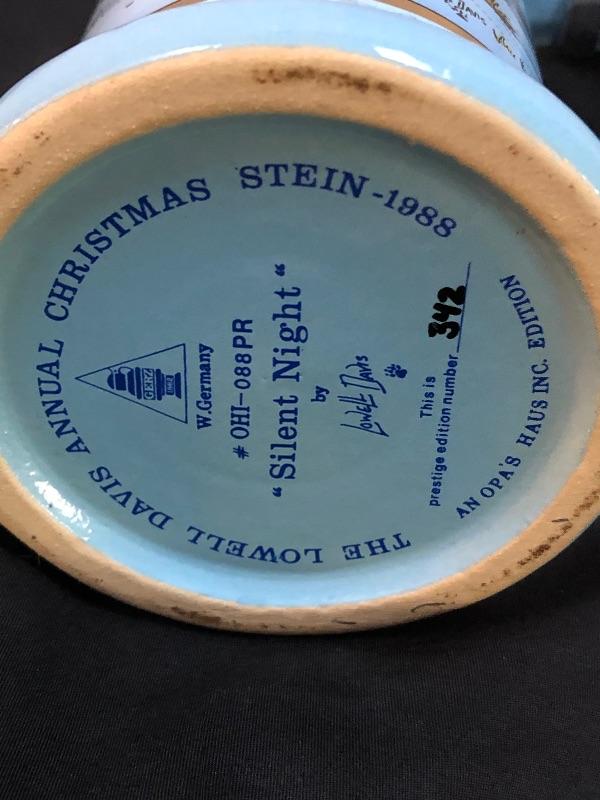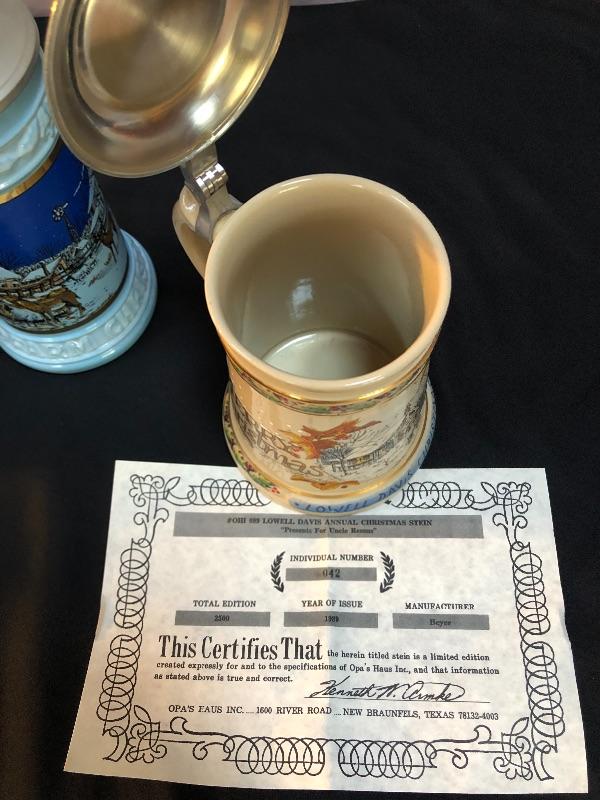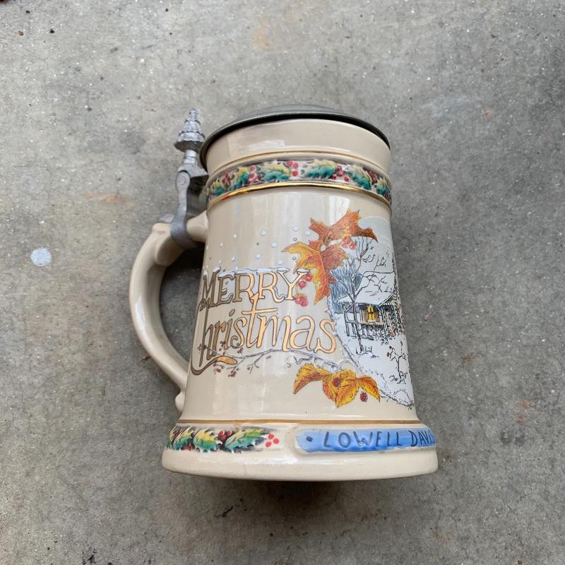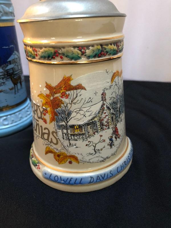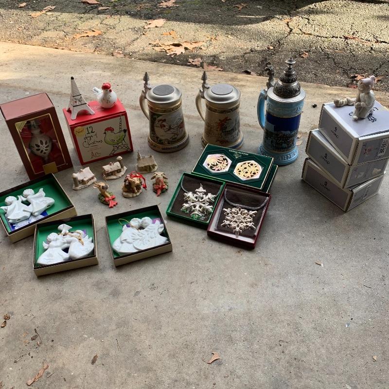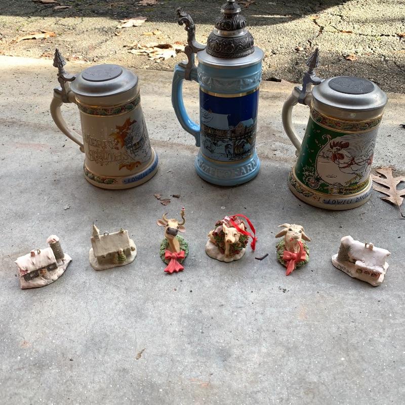 This lot includes a variety of nicer Christmas decor including three Lowell Davis Christmas steins, seven hanging stained glass decorations, three Lenox ceramics ornaments, three Landro ornaments, Lowell Davis ornaments, and more. The blue Stein measures 10” high with the other two measuring approximately 6” high. One of the Laurel Davis ornaments has a piece broken off (see picture). Local pick up only.