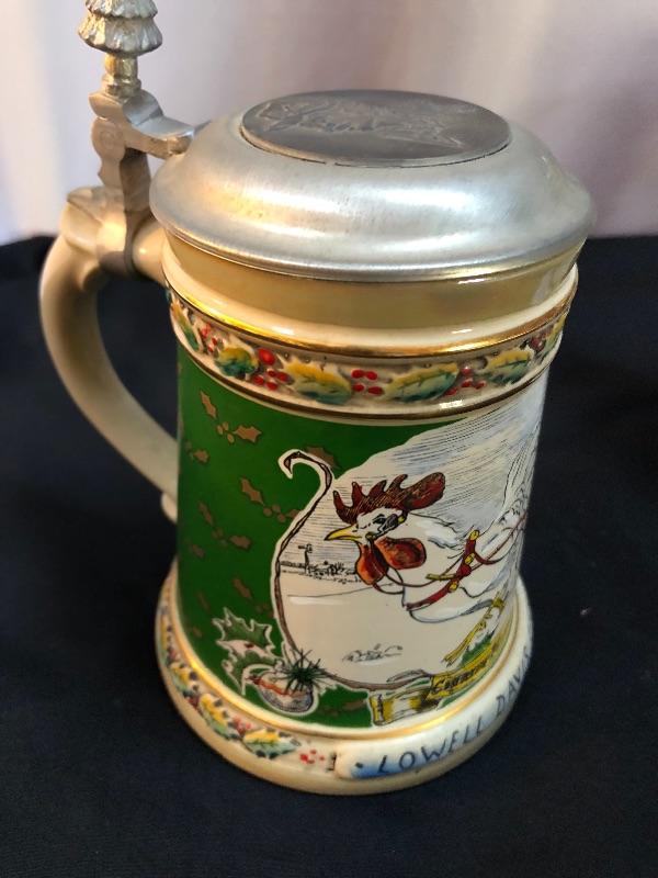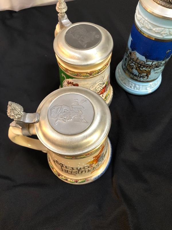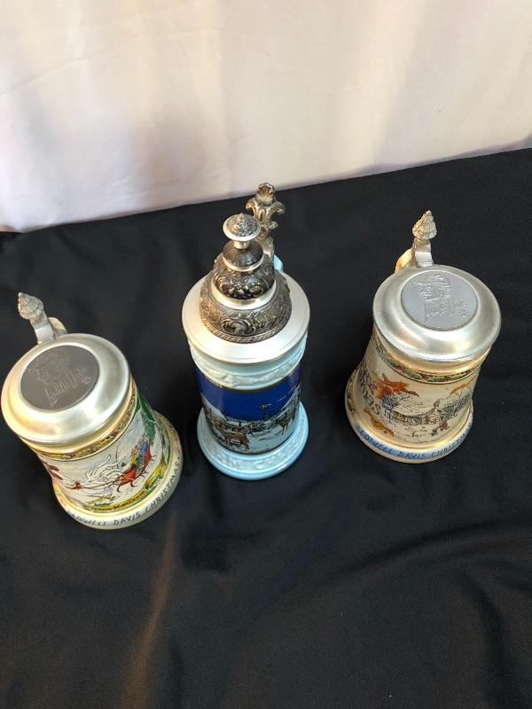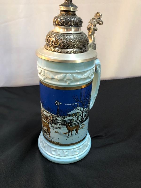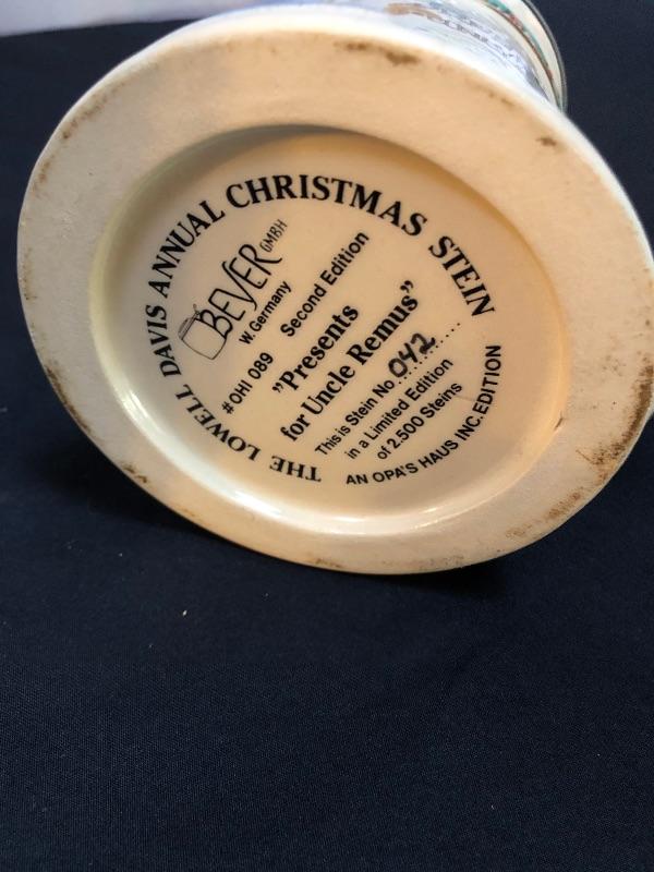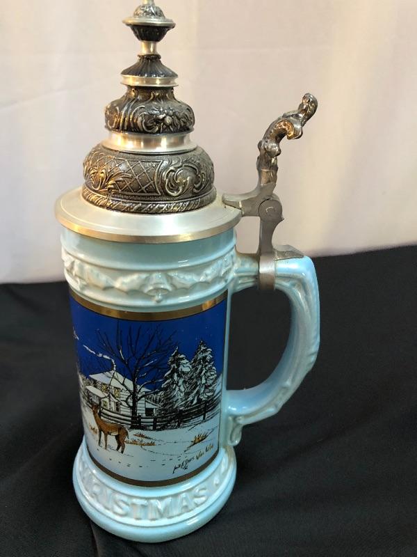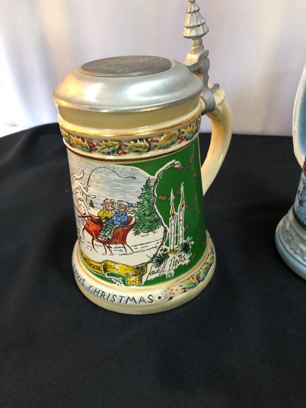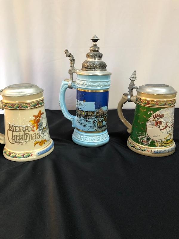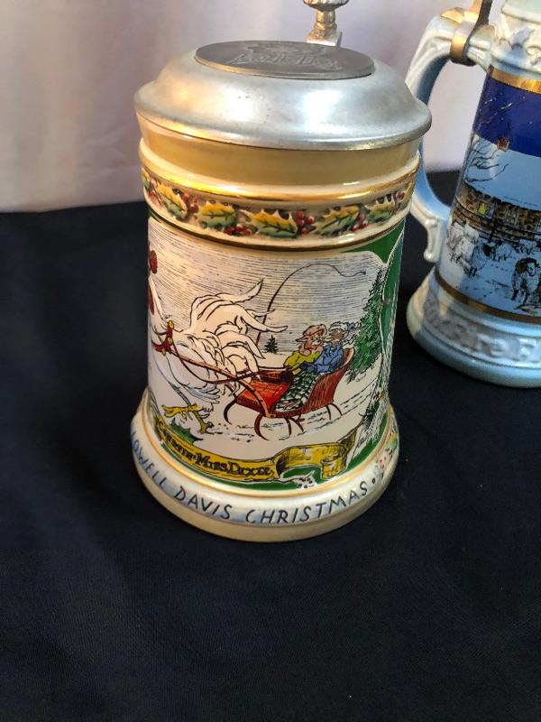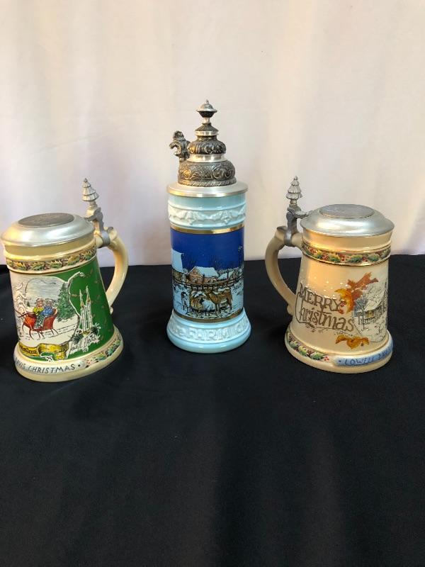 This lot includes a variety of nicer Christmas decor including three Lowell Davis Christmas steins, seven hanging stained glass decorations, three Lenox ceramics ornaments, three Landro ornaments, Lowell Davis ornaments, and more. The blue Stein measures 10” high with the other two measuring approximately 6” high. One of the Laurel Davis ornaments has a piece broken off (see picture). Local pick up only.