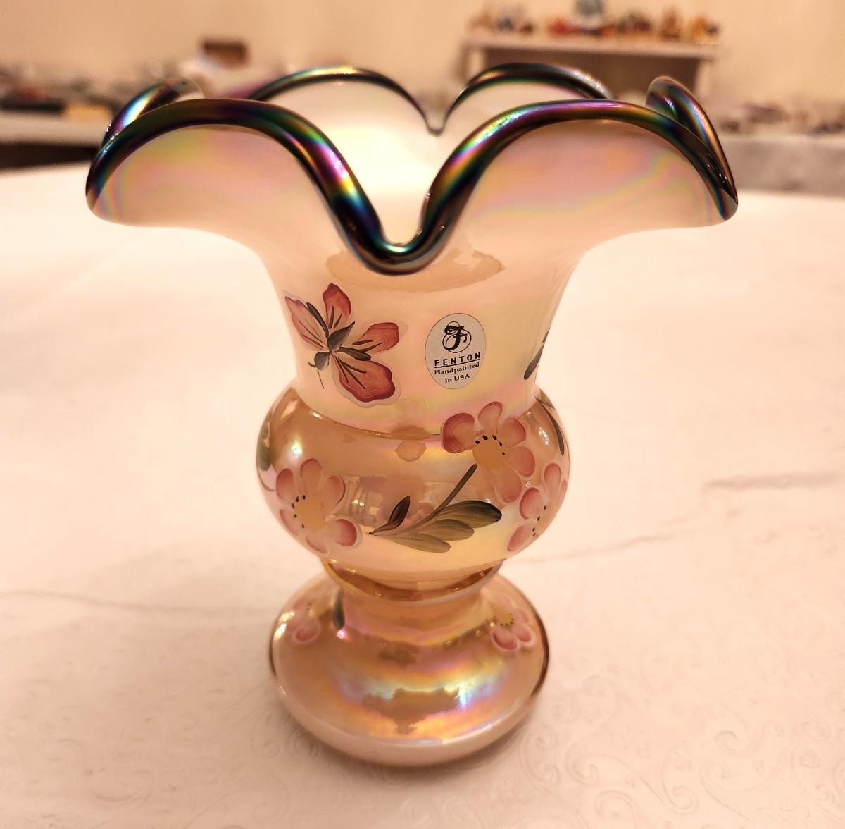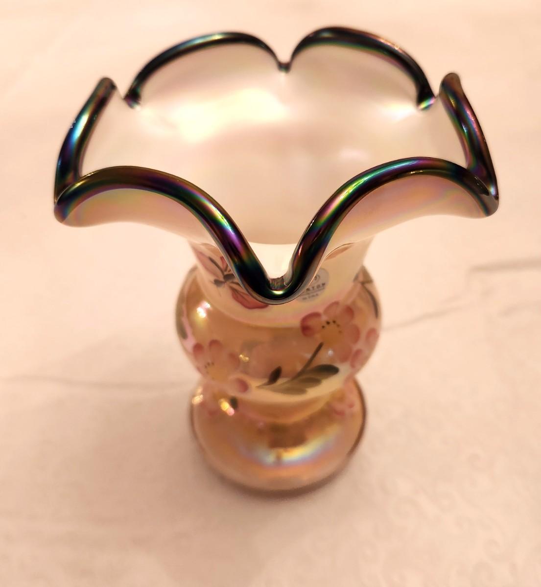Beautiful Fenton Art Glass Vase - 6.5" tall, has label - iridescent crest and Sunset overlay on the glass. Signed.