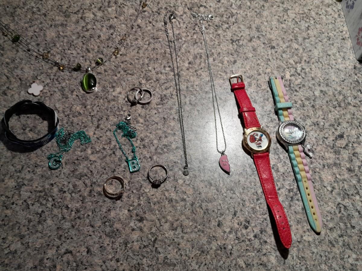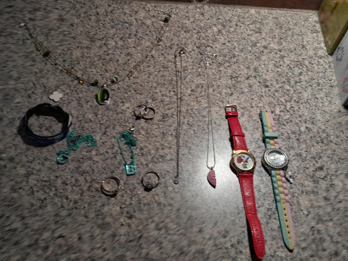 MOSTLY CHILDREN'S JEWELRY, AND TWO WATCHES. THE RINGS ARE BIGGER THAN A SIZE 8