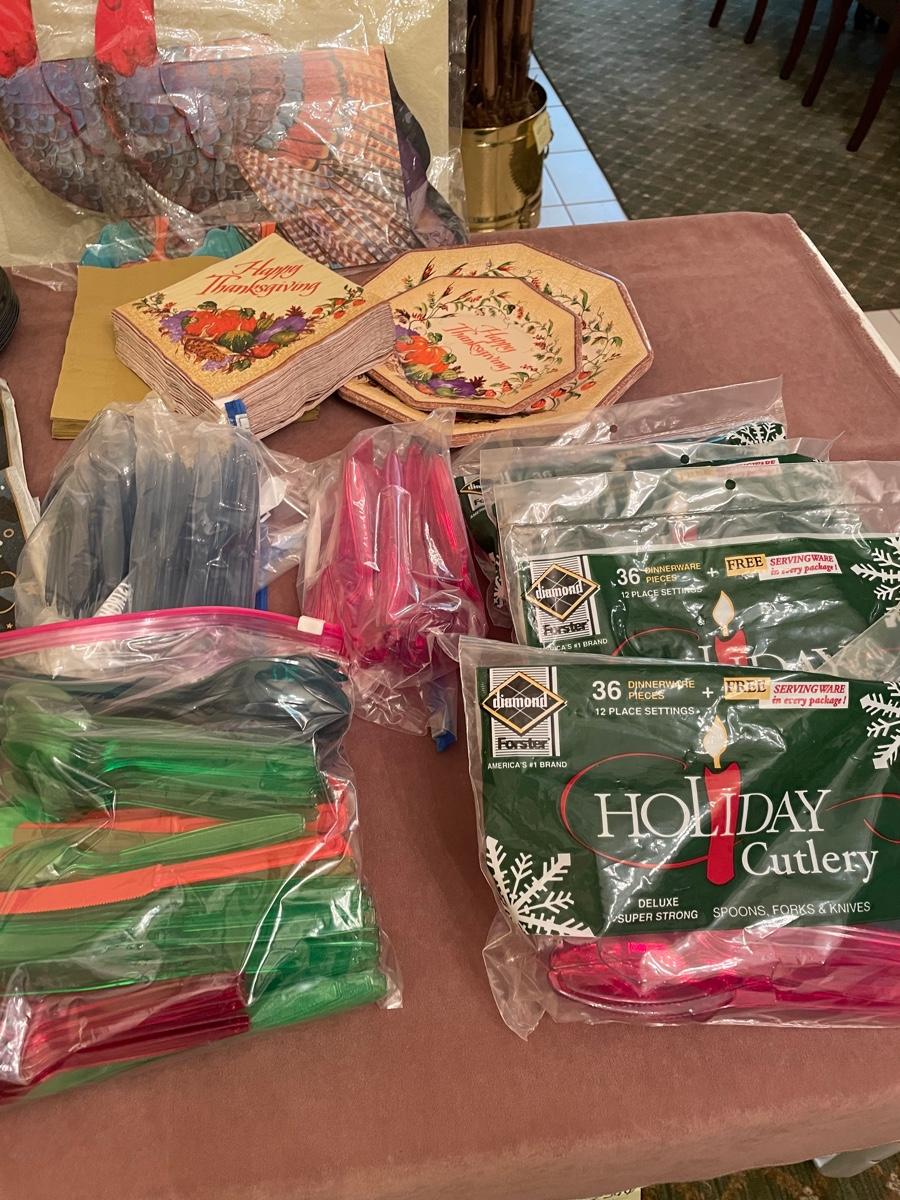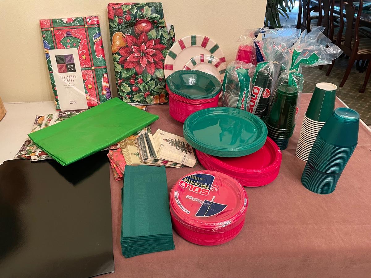 plates, cups, 4 tablecloths, napkins, set of 6 black vinyl placemats
