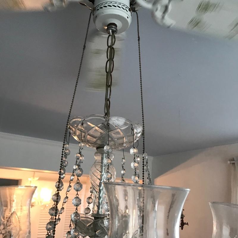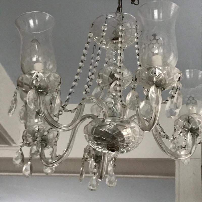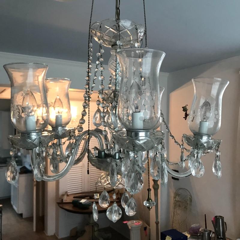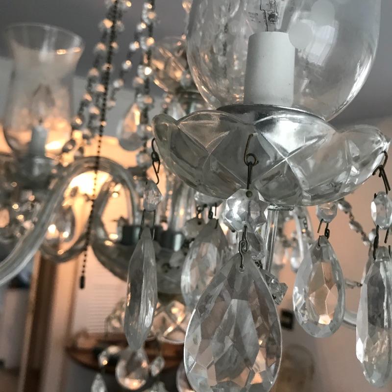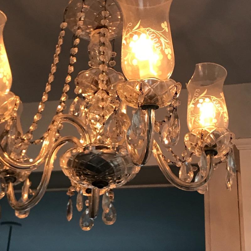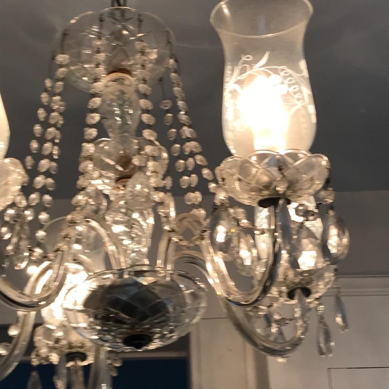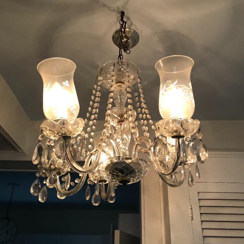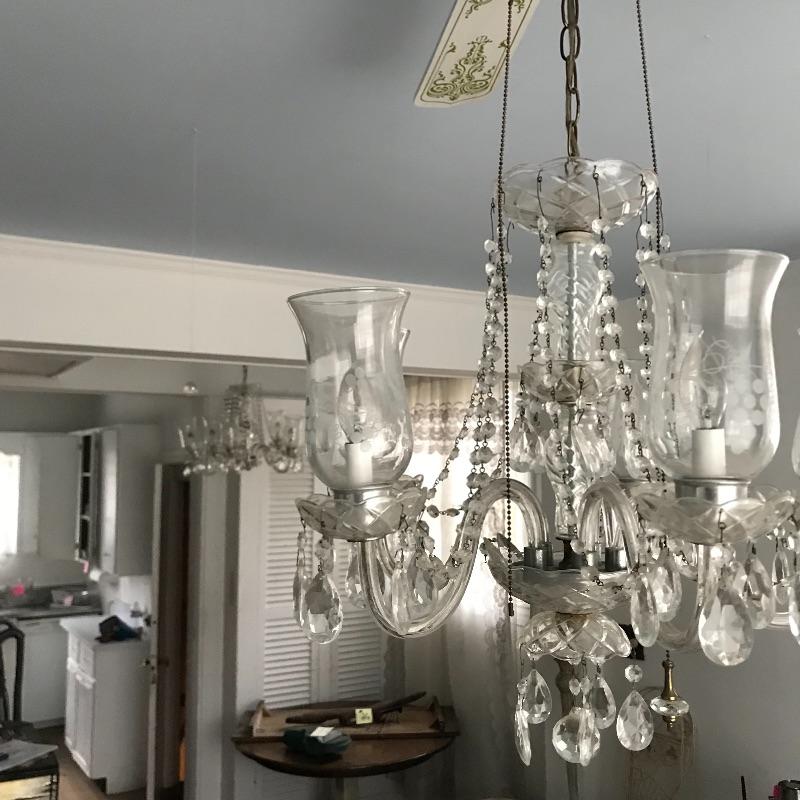 Lot includes two vintage chandeliers with hanging prism-like accents. Dimable and stylish, these would be an elegant accent to your dining room or entryway. Approx. 20” h x 21” in diameter and 18” h x 21” in diameter. See pics. Local pickup only.