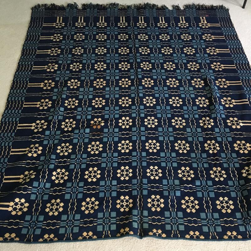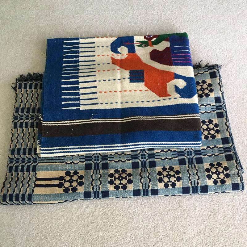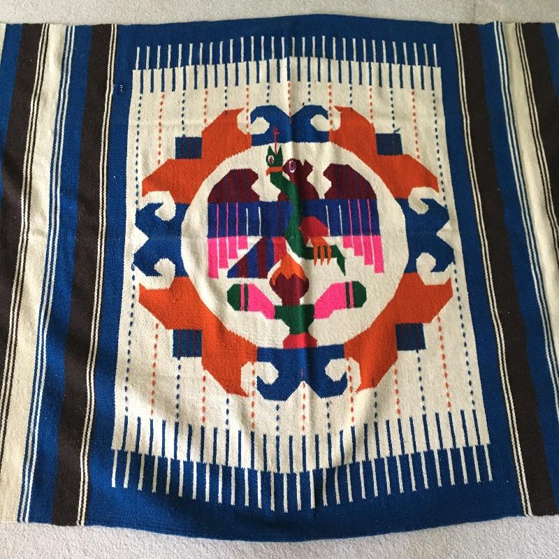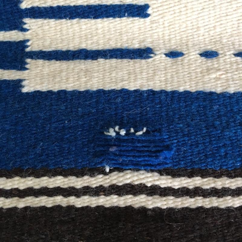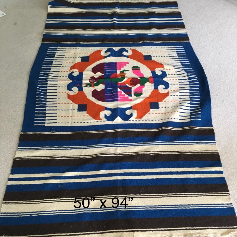 A blue tapestry style rug measures 69” x 84” and has a few stains and what seems to be wax on one end, see images. The rug with the large bold Aztec like design in the middle measures 50” x 94” and has one spot that is frayed, again see images.