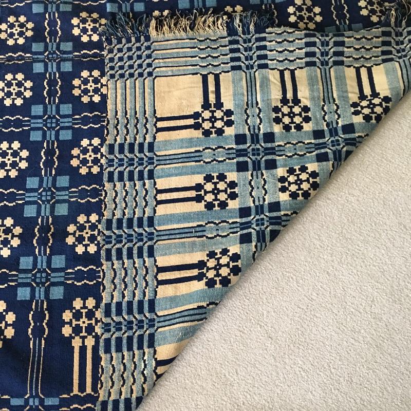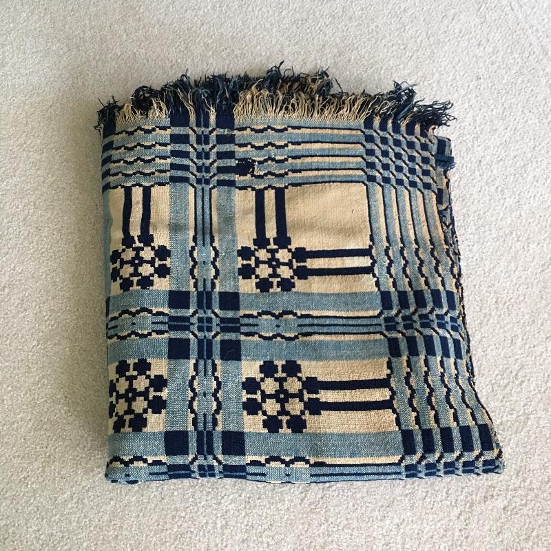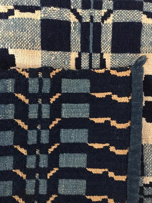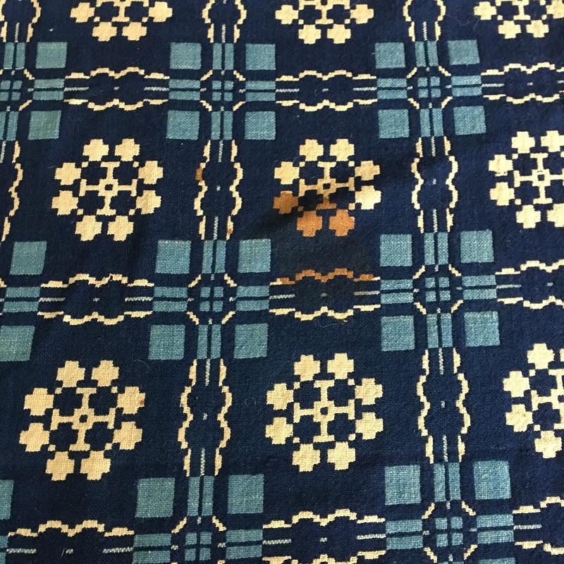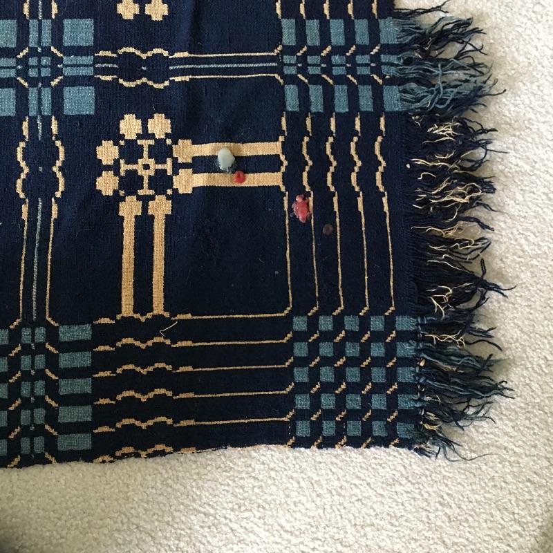 A blue tapestry style rug measures 69” x 84” and has a few stains and what seems to be wax on one end, see images. The rug with the large bold Aztec like design in the middle measures 50” x 94” and has one spot that is frayed, again see images.