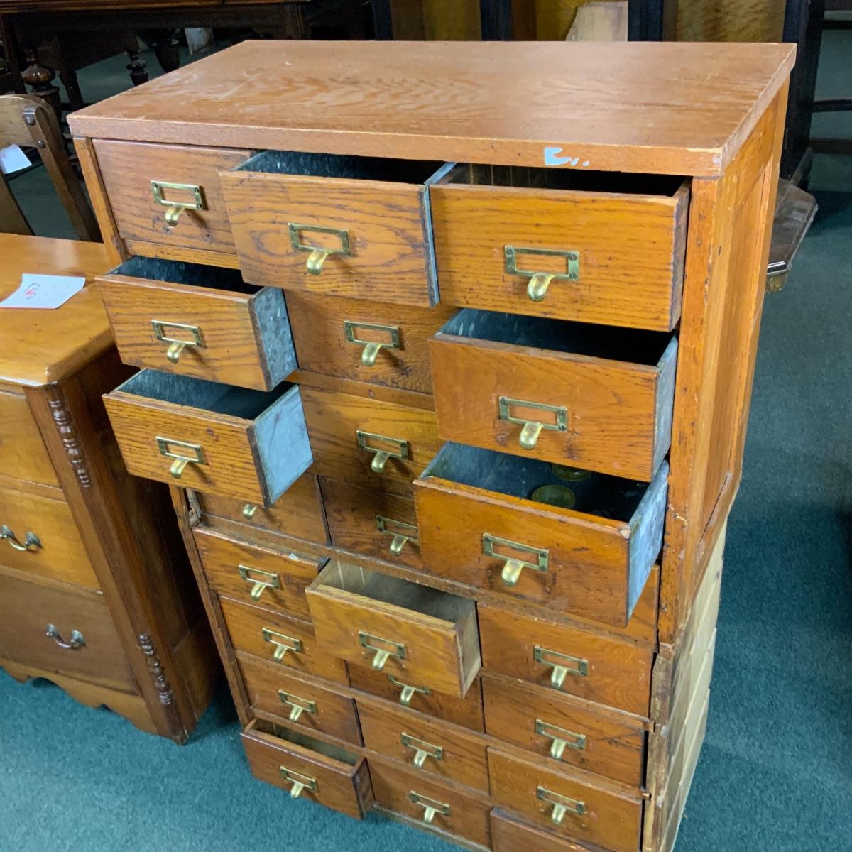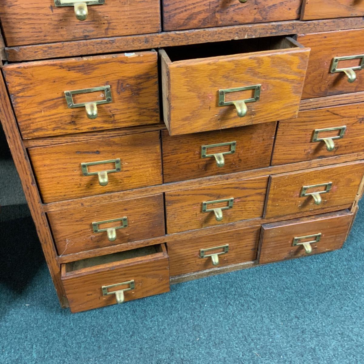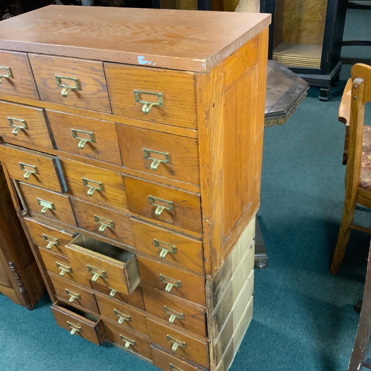 Stacking up card file. There are two sets in this lot stacked on top of each other. I think they look nice like that but you could always separate them and use them on either side of a desk. They need just a little cleaning. //::\\ Please see photos for details and condition. No attempt has been made to hide any imperfections. All items listed in this auction are warehouse items, and need to be cleaned. A majority of the items need restoration as well. All items are sold AS IS and WITHOUT GUARANTEE. If you are uncertain about an item, DO NOT BID. Due to the nature of this online auction in-person inspection is HIGHLY recommended. All Sales are FINAL. Pick Up Times are FIRM. Please confirm with your own schedule that you can pick up in the scheduled times listed in the Terms and Conditions. Any questions please message the auctioneer. DO NOT Contact The Harp Gallery.