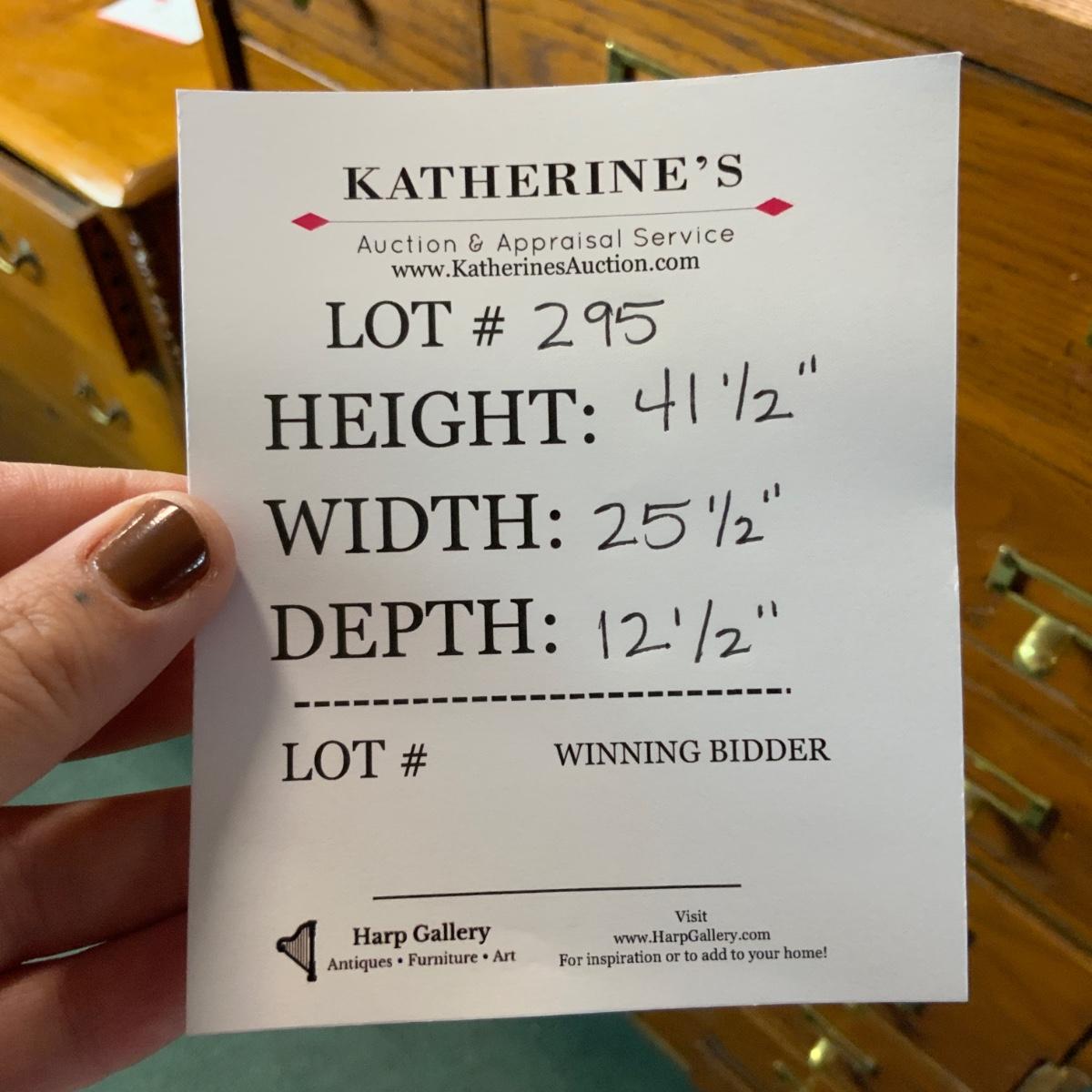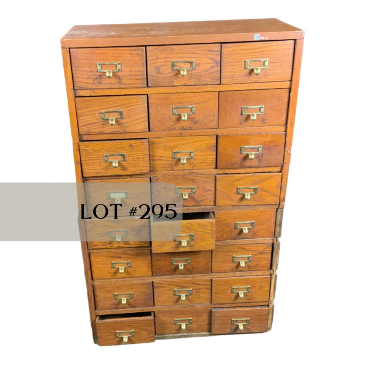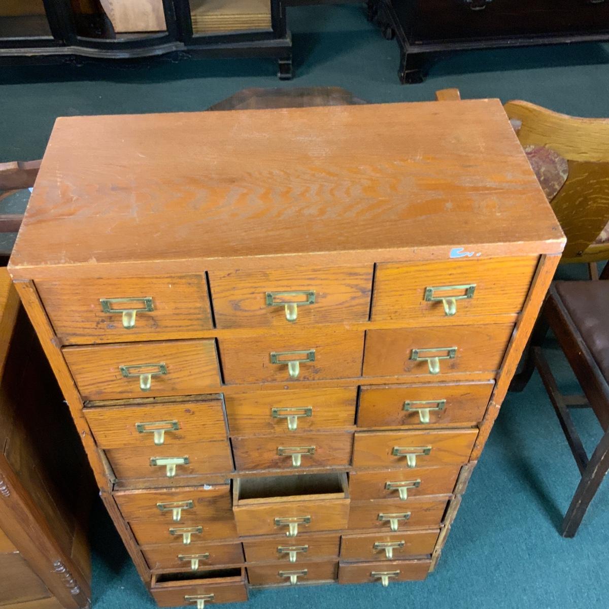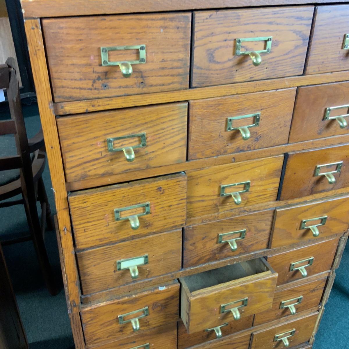 Stacking up card file. There are two sets in this lot stacked on top of each other. I think they look nice like that but you could always separate them and use them on either side of a desk. They need just a little cleaning. //::\\ Please see photos for details and condition. No attempt has been made to hide any imperfections. All items listed in this auction are warehouse items, and need to be cleaned. A majority of the items need restoration as well. All items are sold AS IS and WITHOUT GUARANTEE. If you are uncertain about an item, DO NOT BID. Due to the nature of this online auction in-person inspection is HIGHLY recommended. All Sales are FINAL. Pick Up Times are FIRM. Please confirm with your own schedule that you can pick up in the scheduled times listed in the Terms and Conditions. Any questions please message the auctioneer. DO NOT Contact The Harp Gallery.