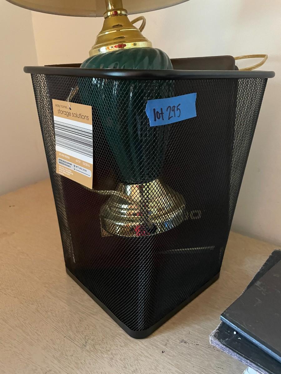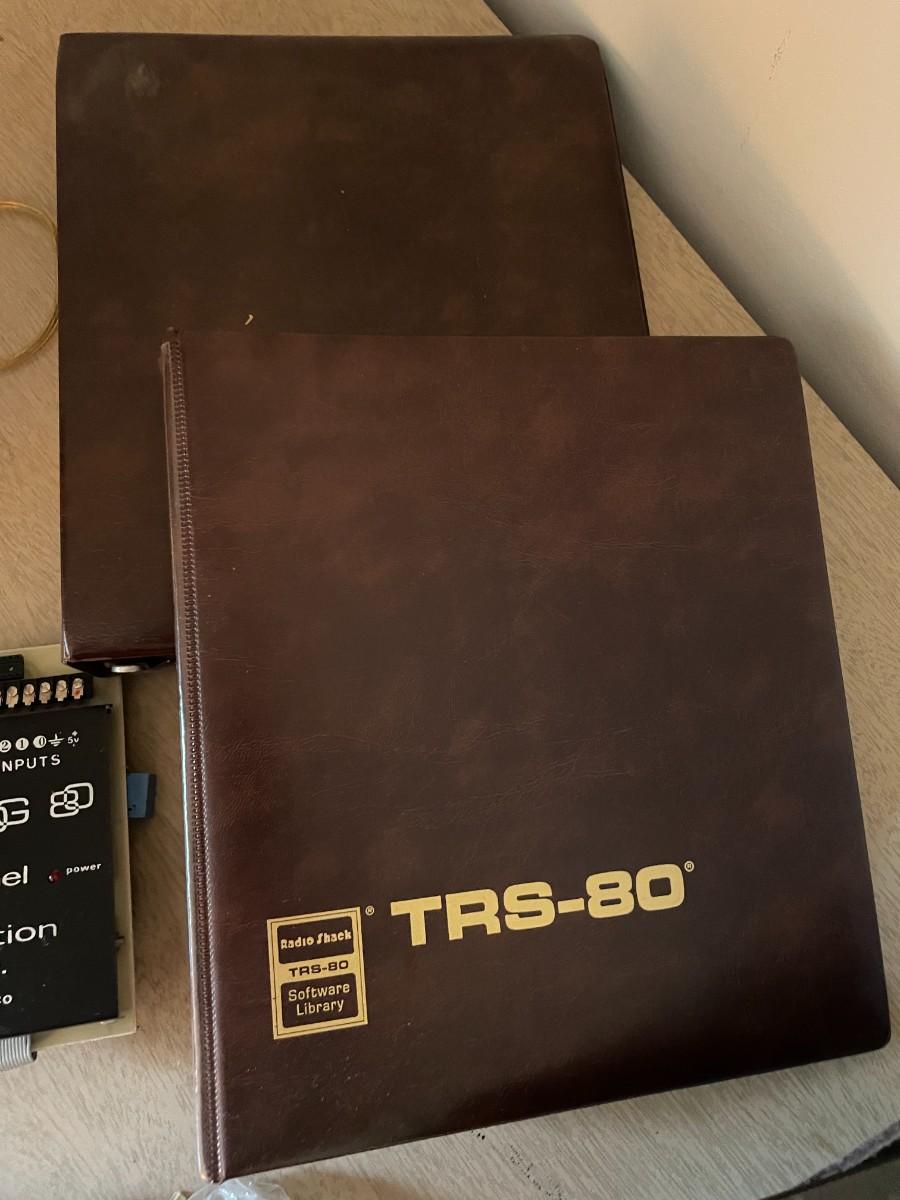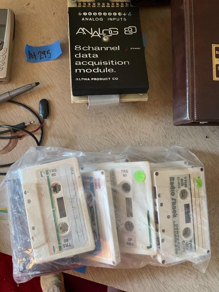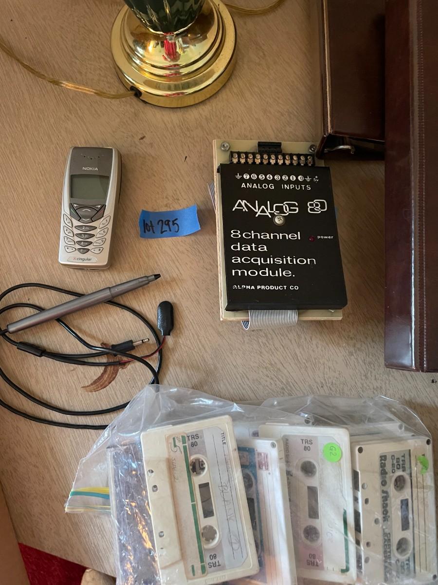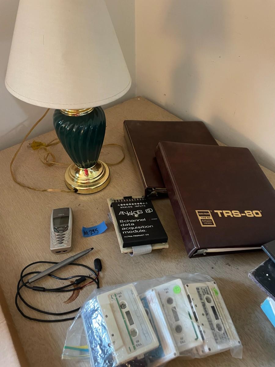 lot 295- TRS-80 buffs, digitizing pen, binders, cassettes, vintage phone, lamp, trashcan, etc.