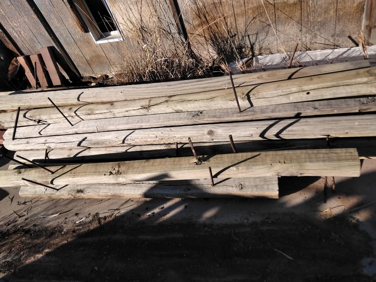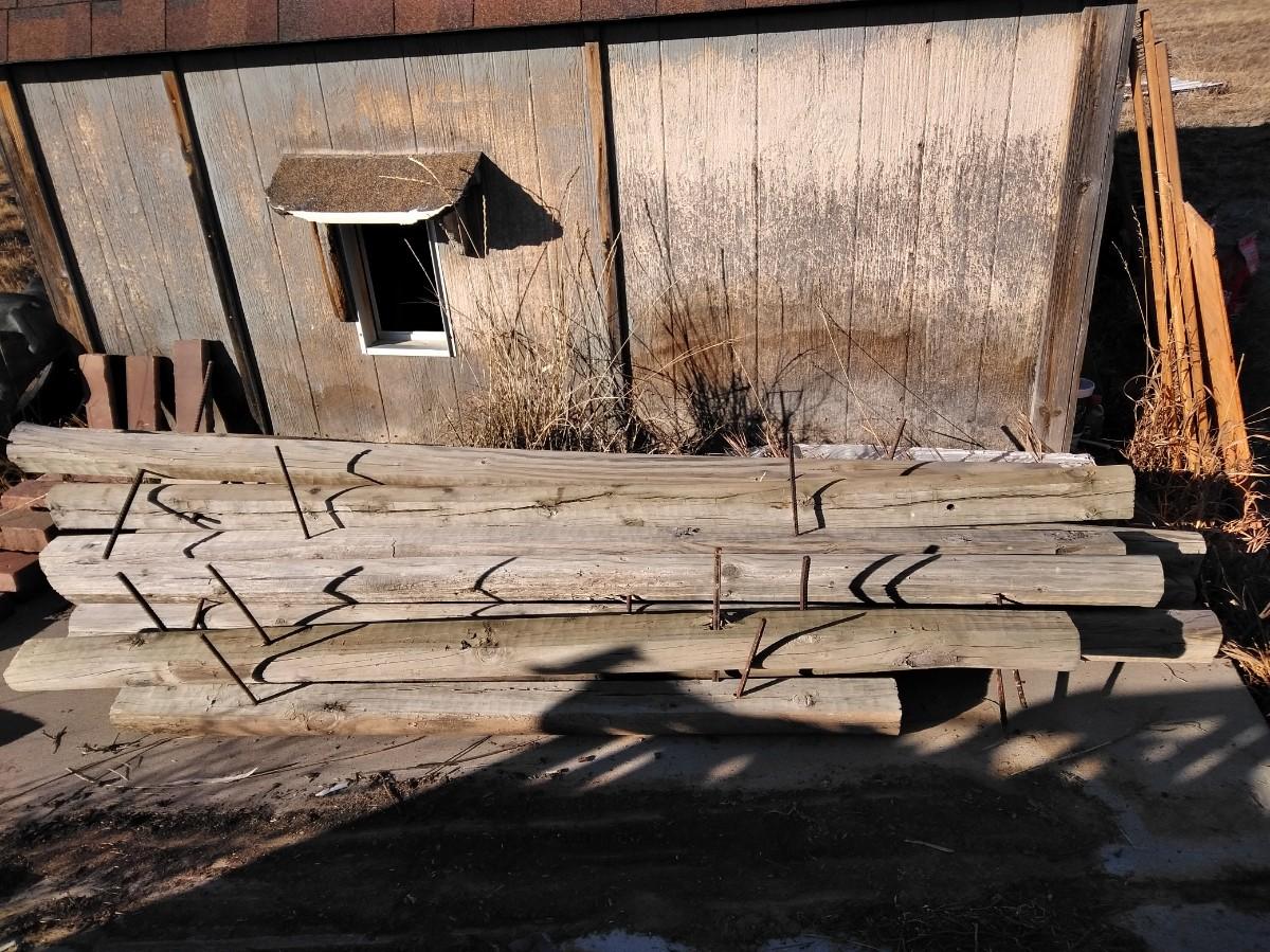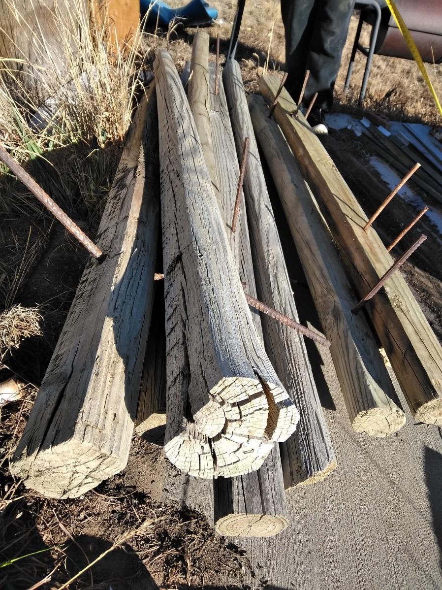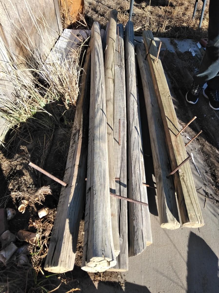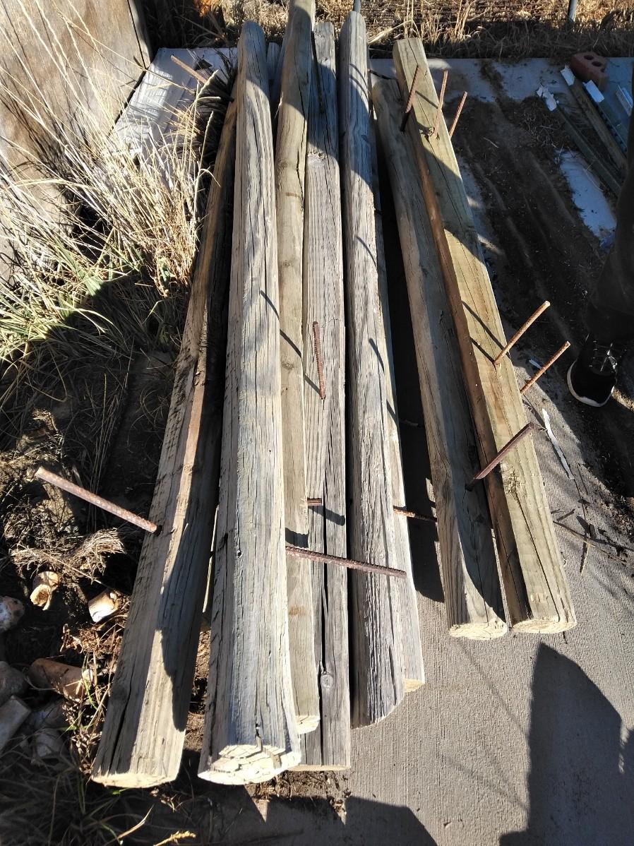 WEATHERED LANDSCAPING TIMBERS RANGE IN SIZE FROM 6' TO 8' SOME HAVE REBAR