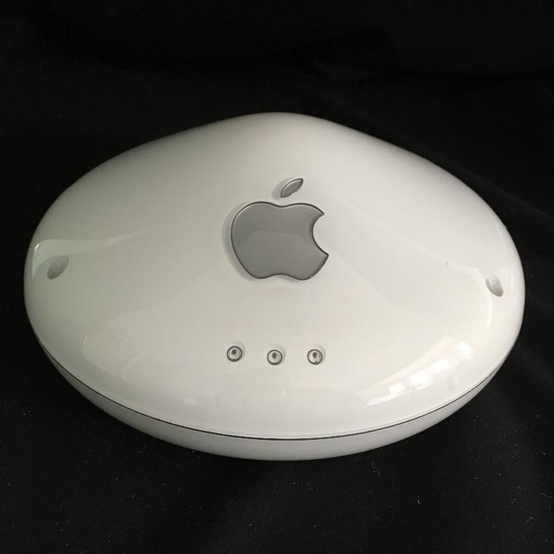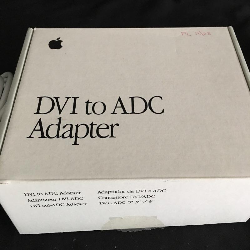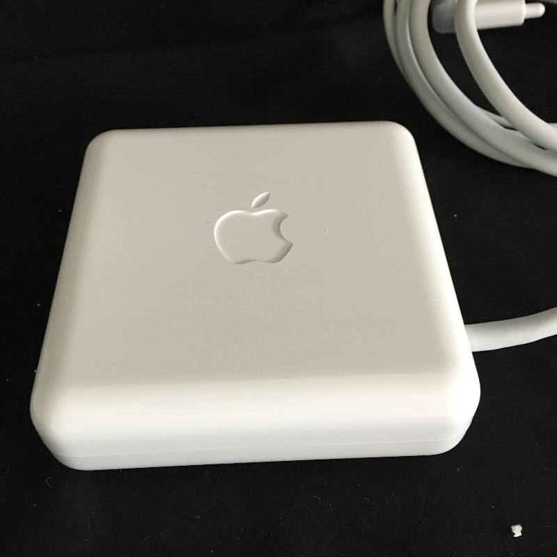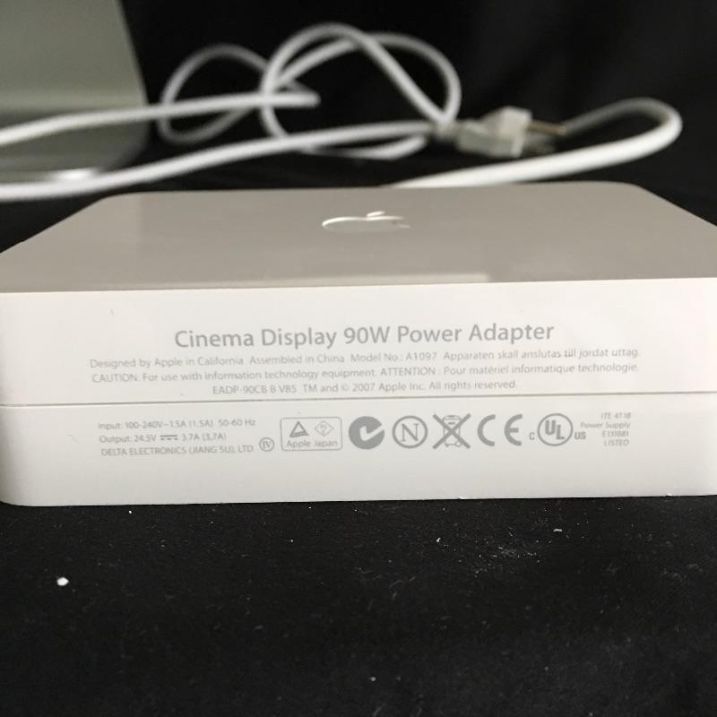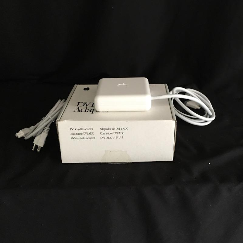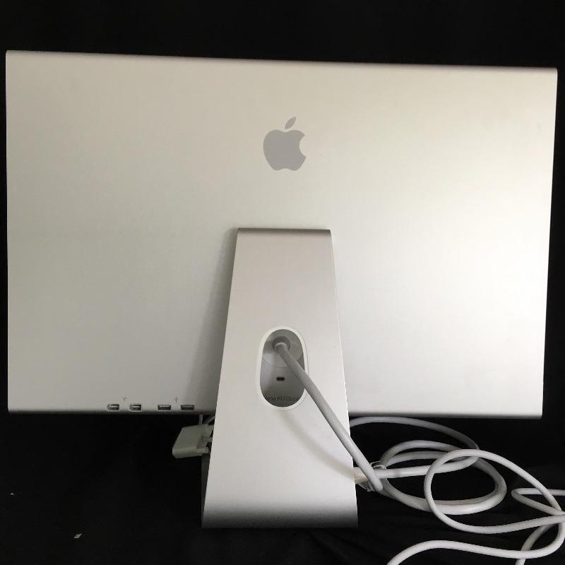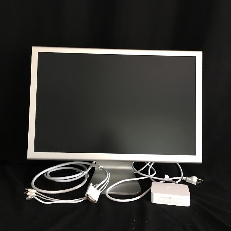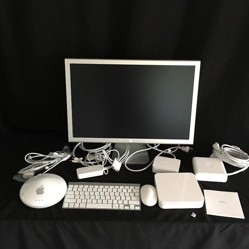 Assortment of Apple Peripherals that includes a wireless keyboard and mouse, 23” cinema HD Display, DVI to ADC adapter, AirPort Extreme base stations and a few extra wires.