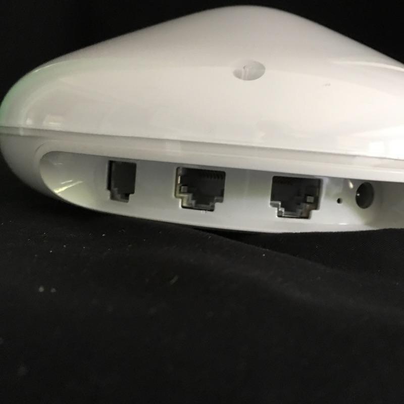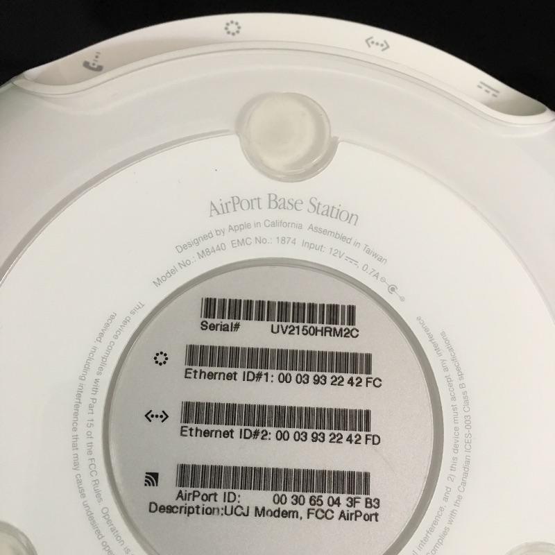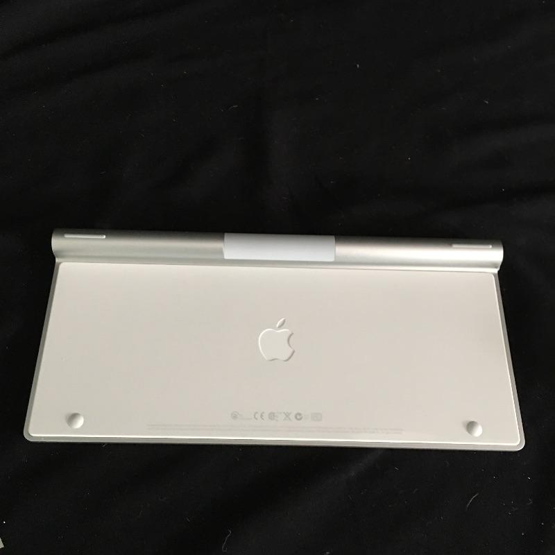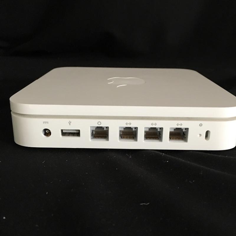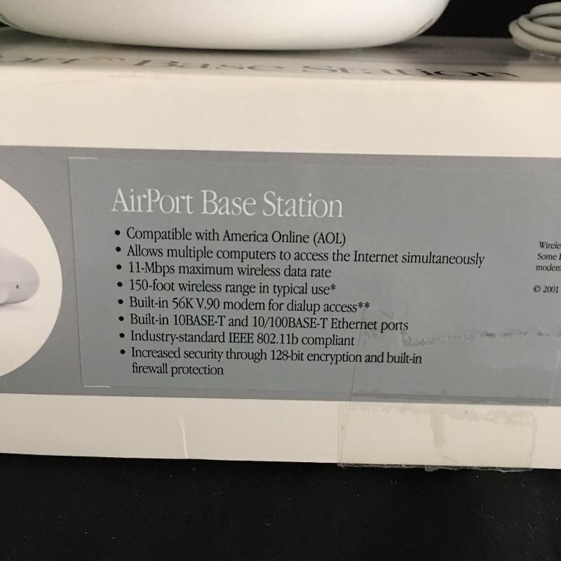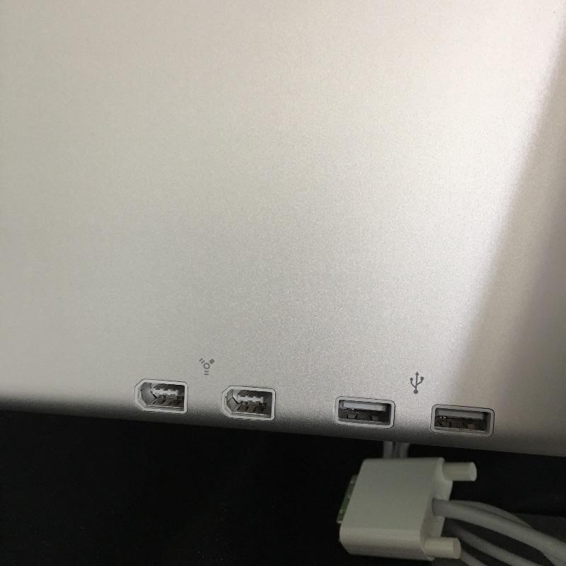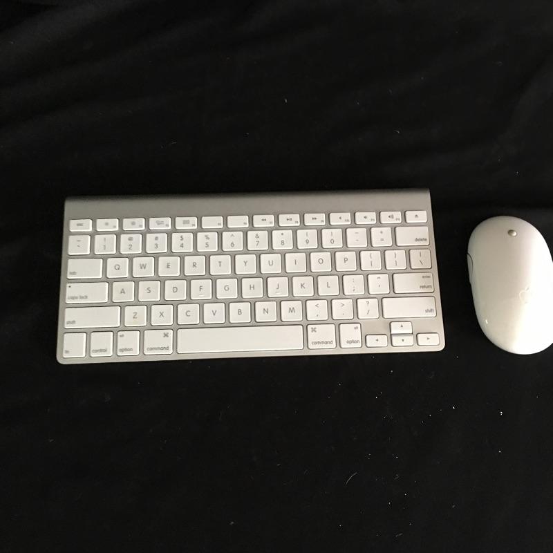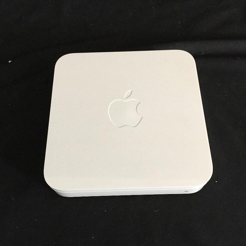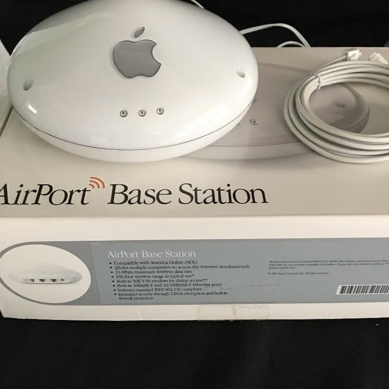 Assortment of Apple Peripherals that includes a wireless keyboard and mouse, 23” cinema HD Display, DVI to ADC adapter, AirPort Extreme base stations and a few extra wires.
