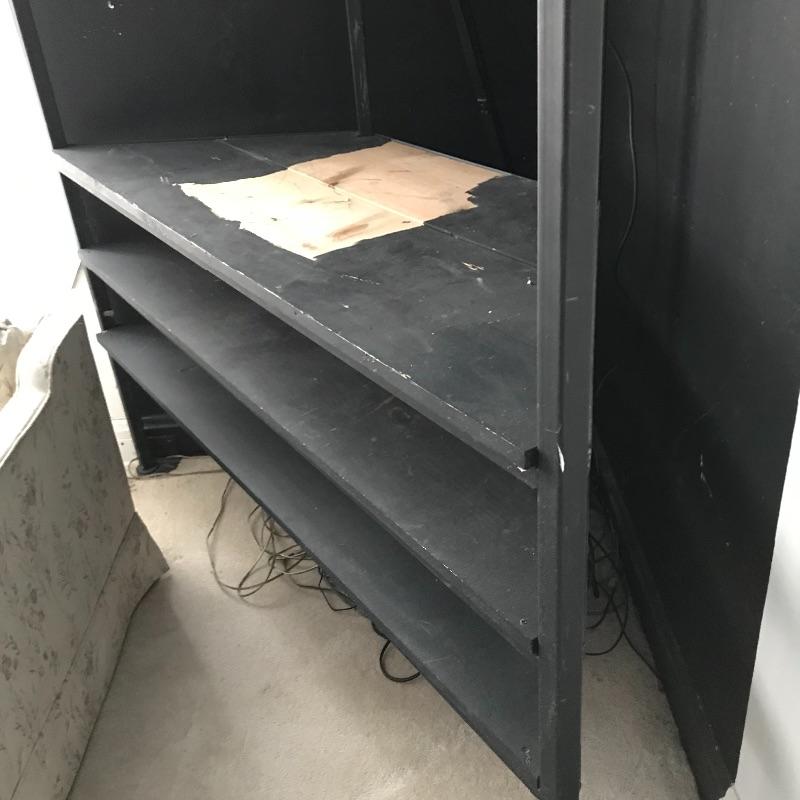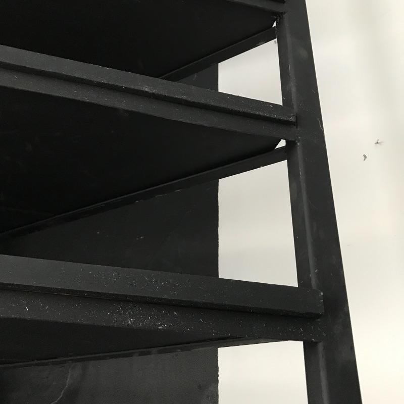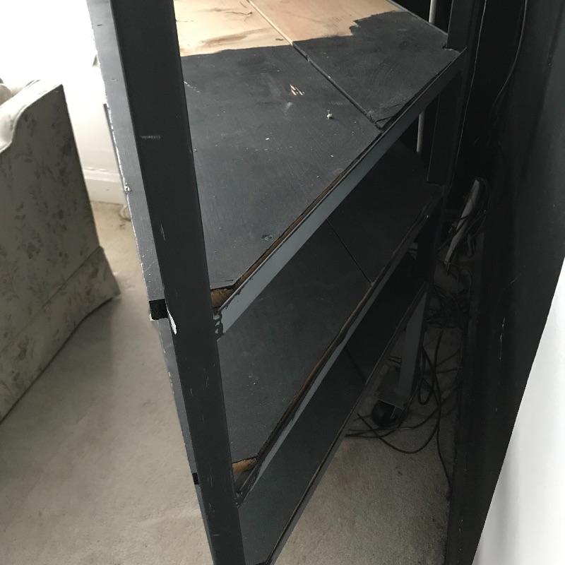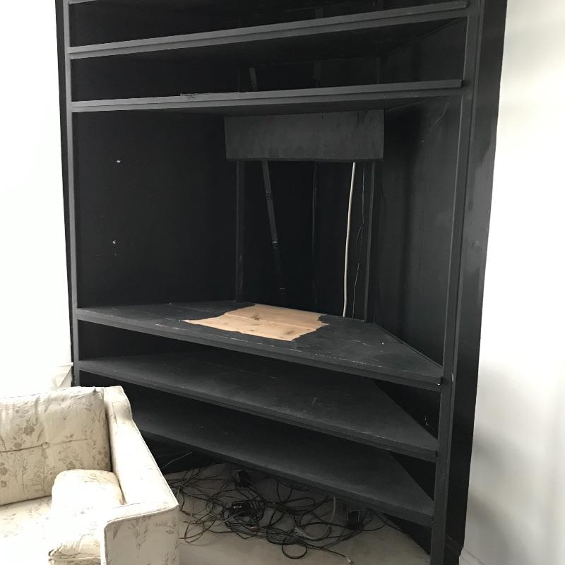This large corner shelf is perfect for anywhere you need strong, sturdy corner storage. Metsl with wooden shelves, piece needs a paint job but is in great shape otherwise. On casters. Approx. 62” wide at widest point x 20.5” deep x 101” tall. Please bring help to move and load as this piece is large and heavy. Local pickup only.