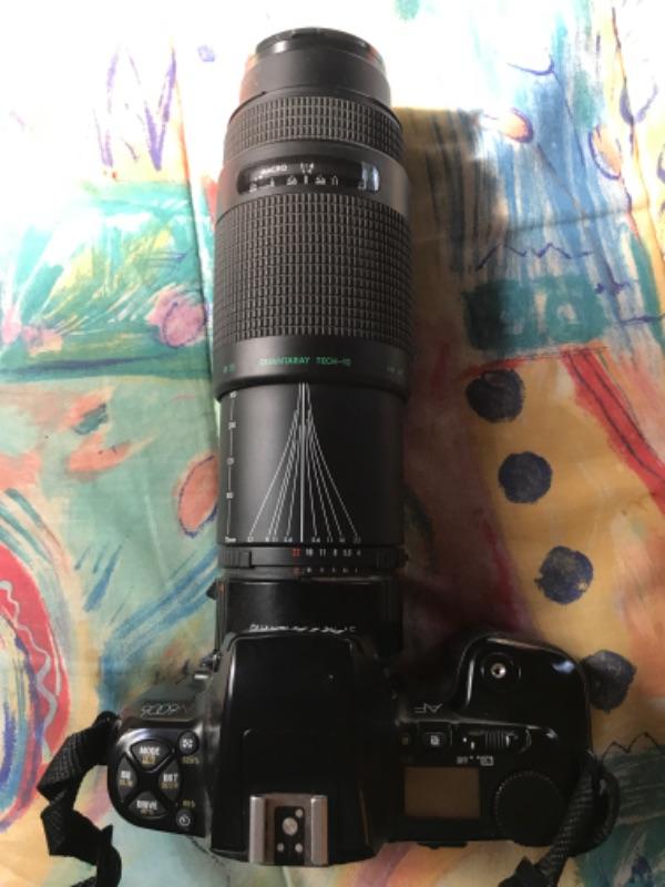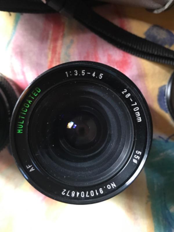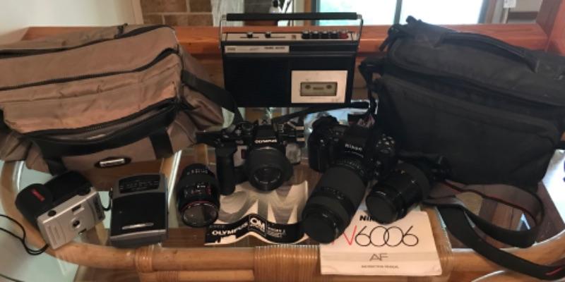 Nikon N6006 camera with bag and accessories, Olympus OM-PC Camera with Power Winder 2, Zuiko lens and bag of accessories, Channel model 6392 radio, Radio Shack pocket radio and Bell Howell 35mm camera