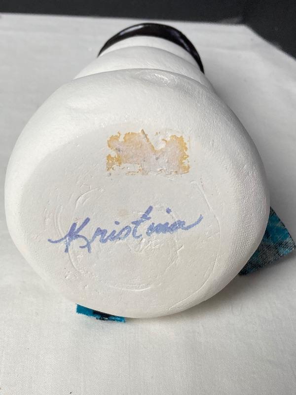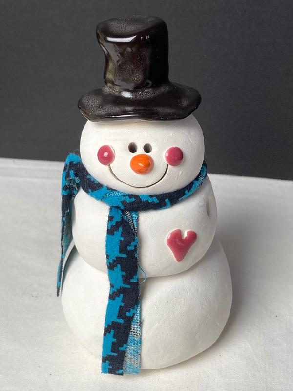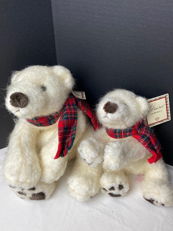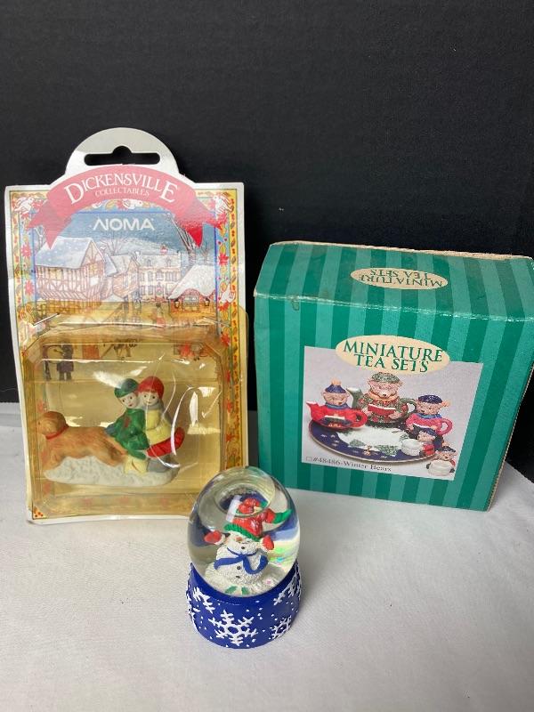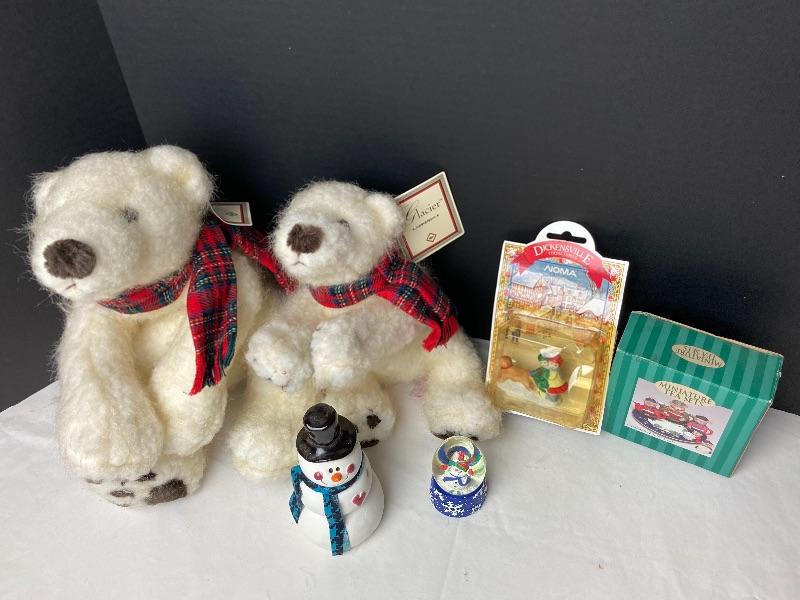 Pair of stuffed Polar Bears by Glacier, Pottery snowman signed Kristina (missing arms), Dickensville collectibles still in original packaging, and Winter Bears miniature tea set