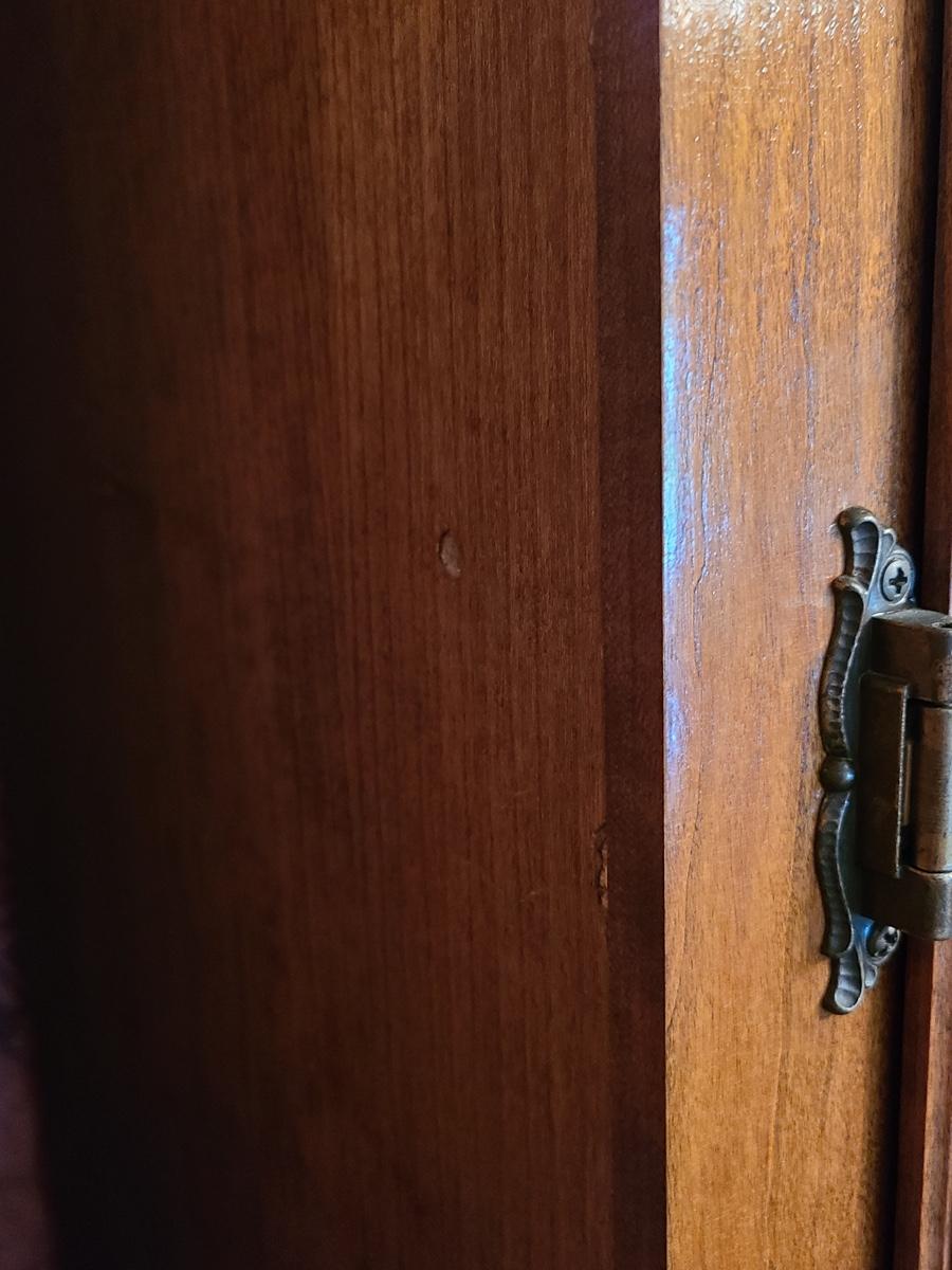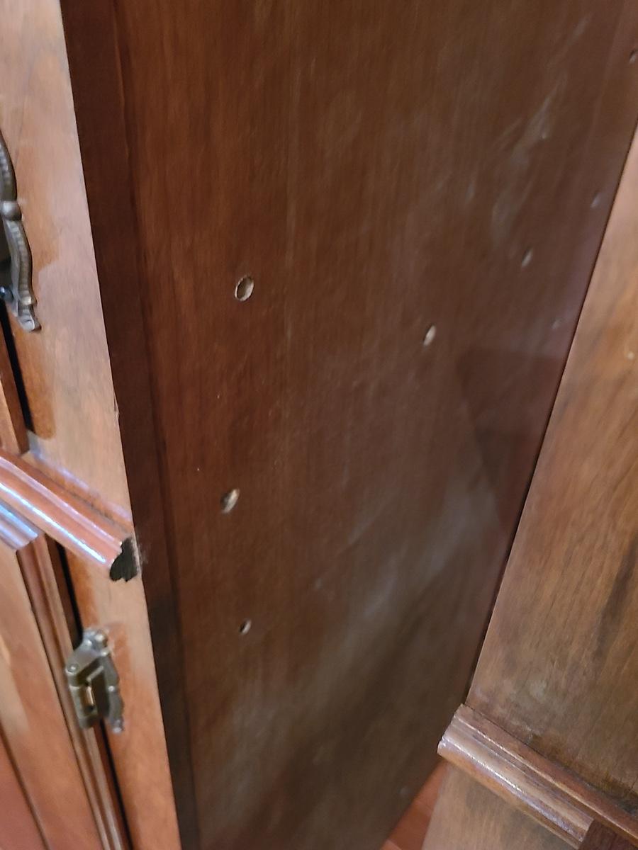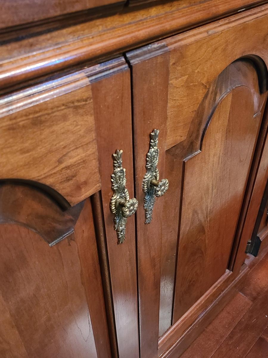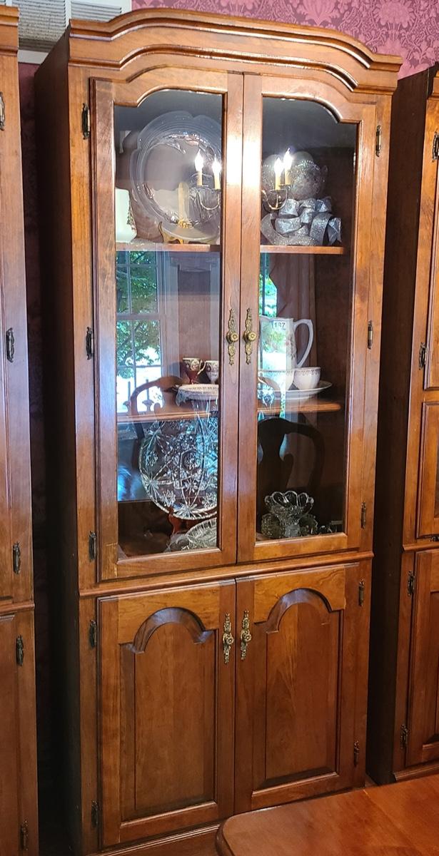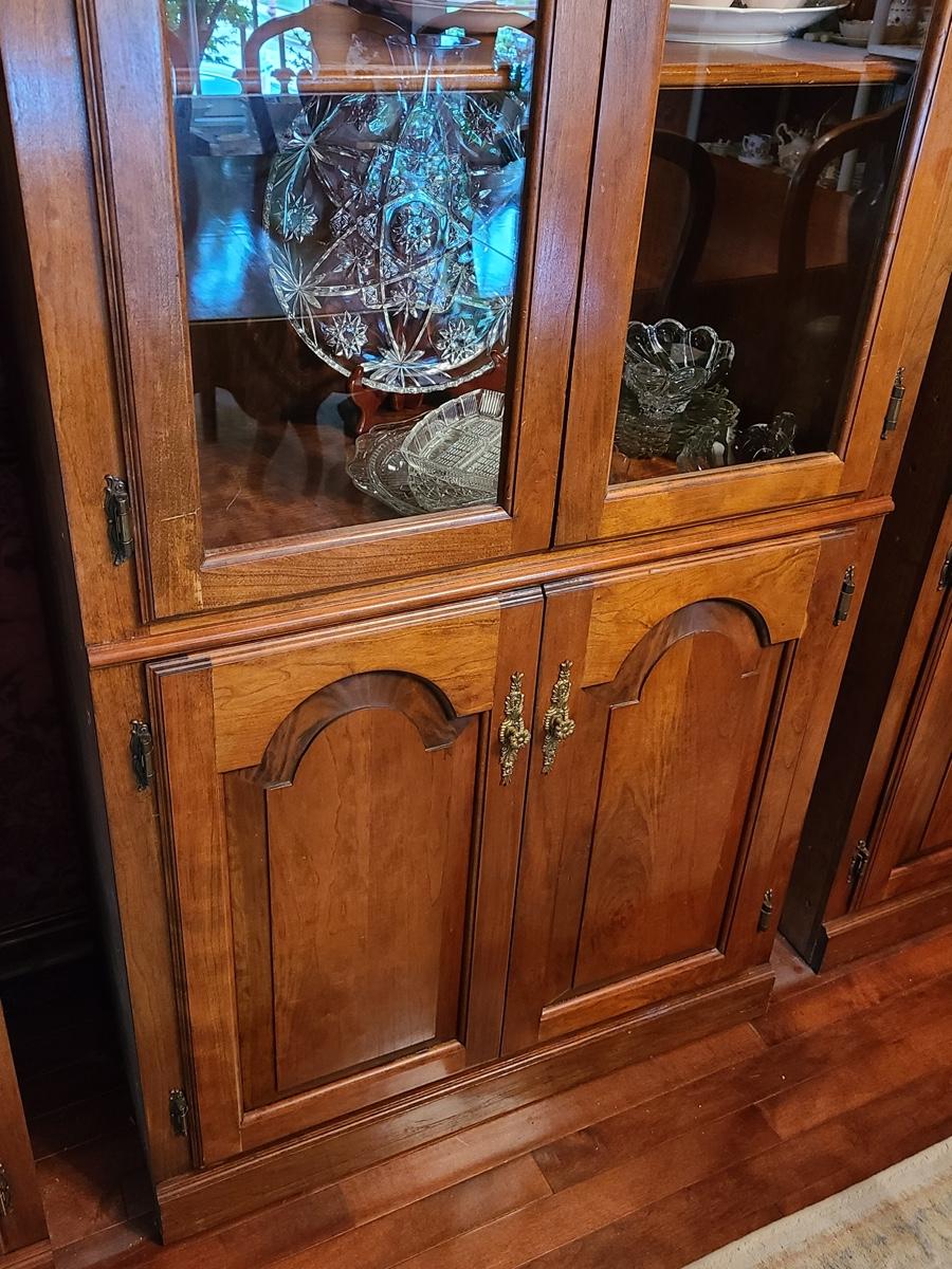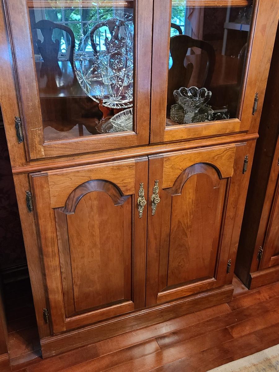 32x18x82. This unit is part one of a system of three. We are listing individually as someone may need just one for an office, or living room and not all three. Gold ornate hardware. Storage underneath. Items inside not included. There are small holes on the side where you can connect the three. You can leave alone, or fill. Please see pictures of holes. Please see all pictures as they are the best representation of the items in the lot, the condition of the lot, and will show measurements if taken. If purchasing furniture you must be able to move yourself with your own help, and truck. .