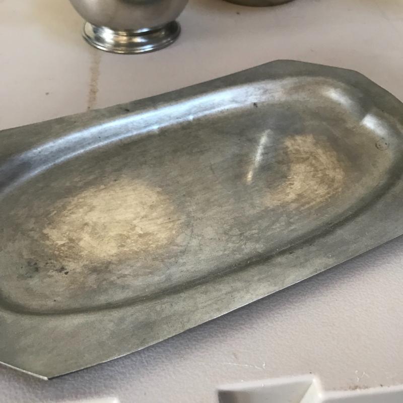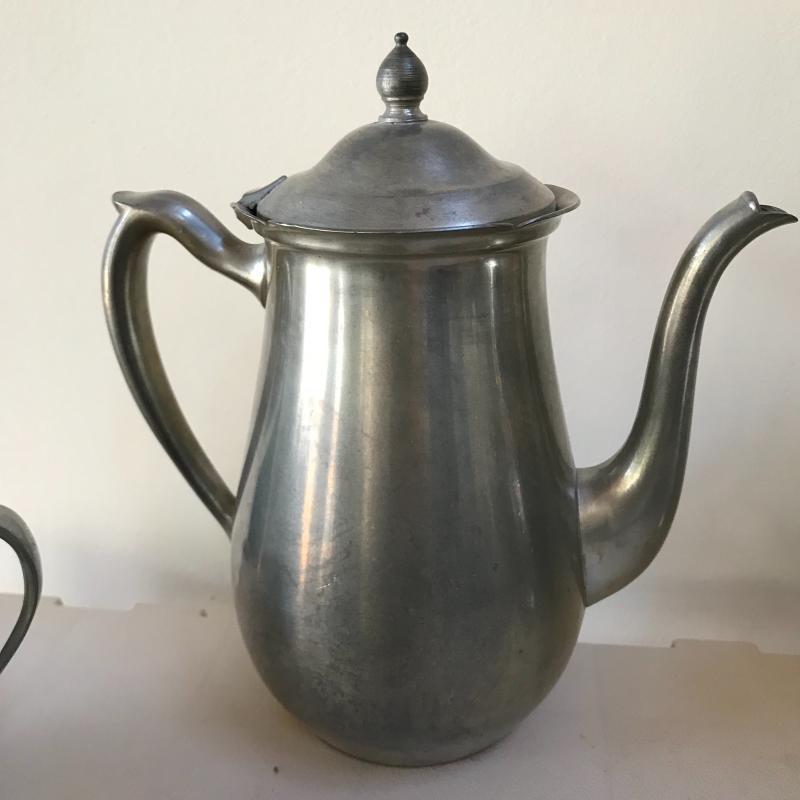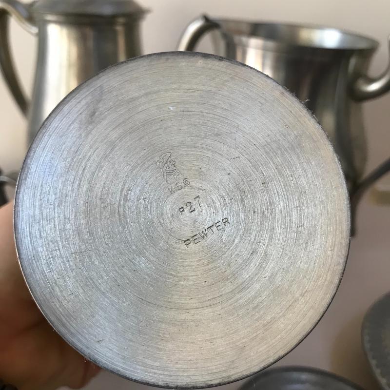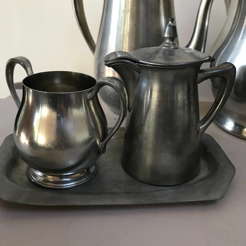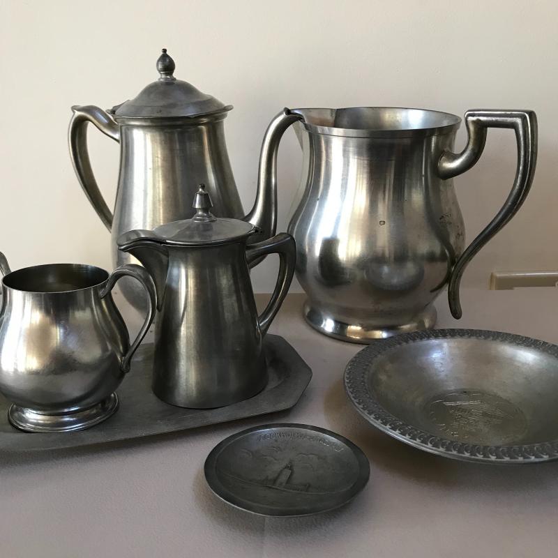 Lot includes 7 Pewter pieces: two small plates, a serving tray, a sugar bowl, a pitcher and a teapot. Shipping available.