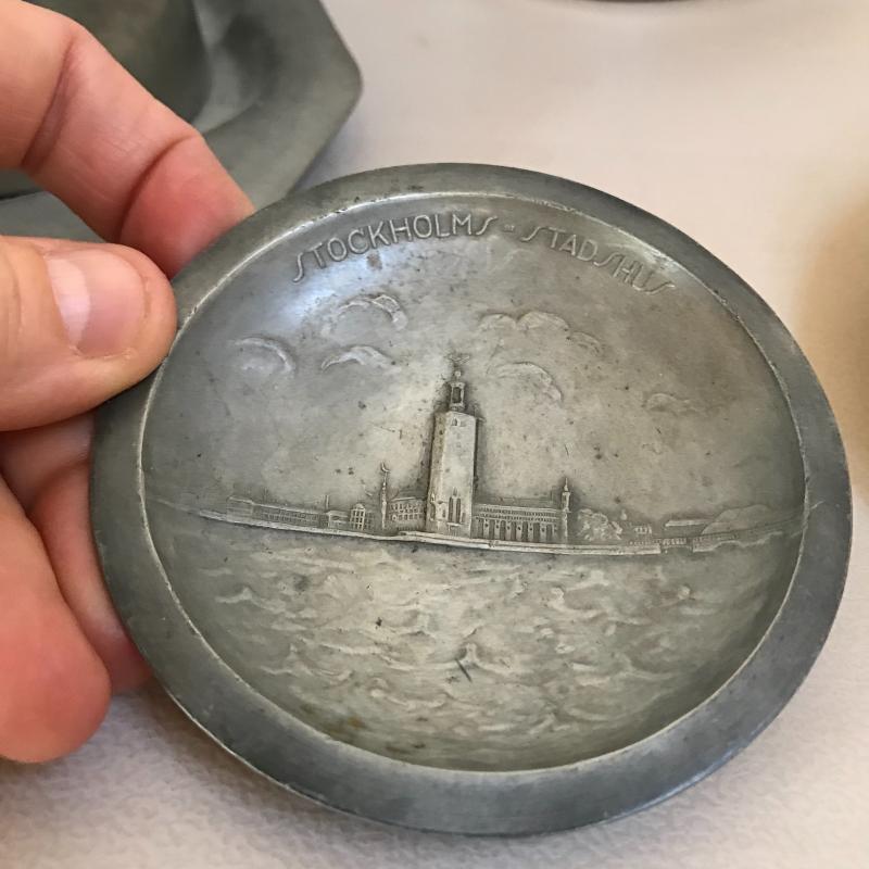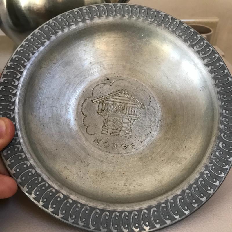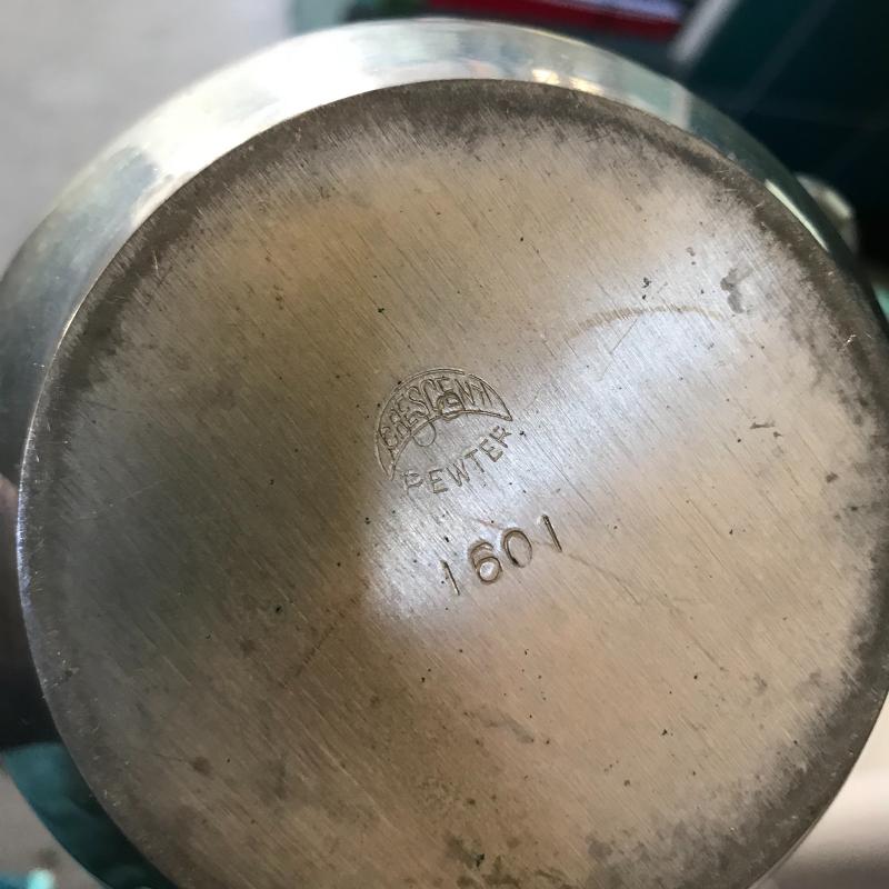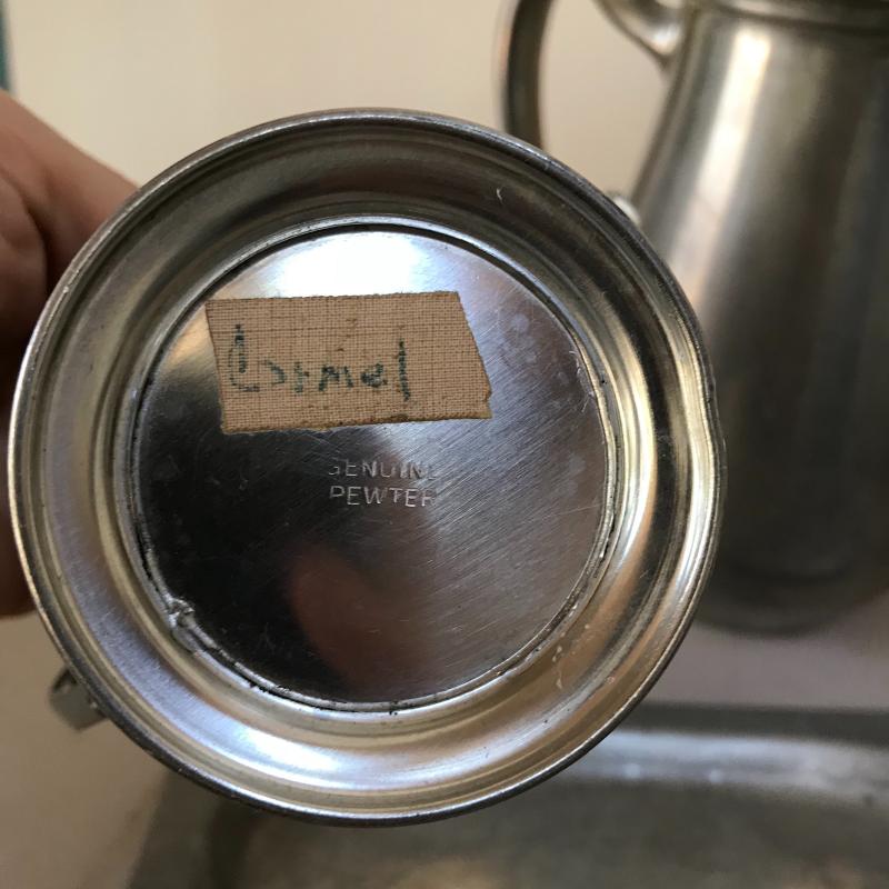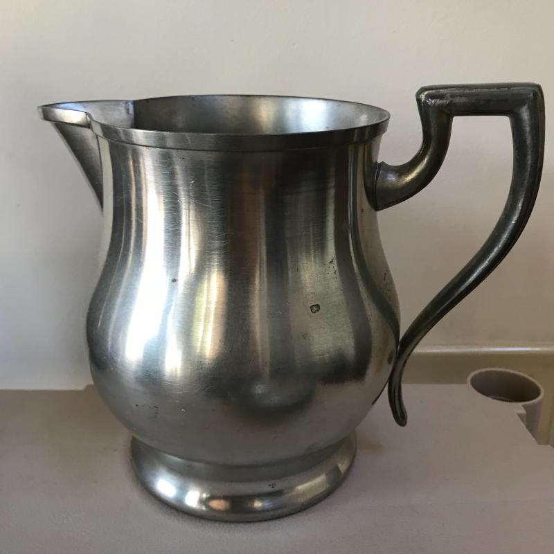 Lot includes 7 Pewter pieces: two small plates, a serving tray, a sugar bowl, a pitcher and a teapot. Shipping available.