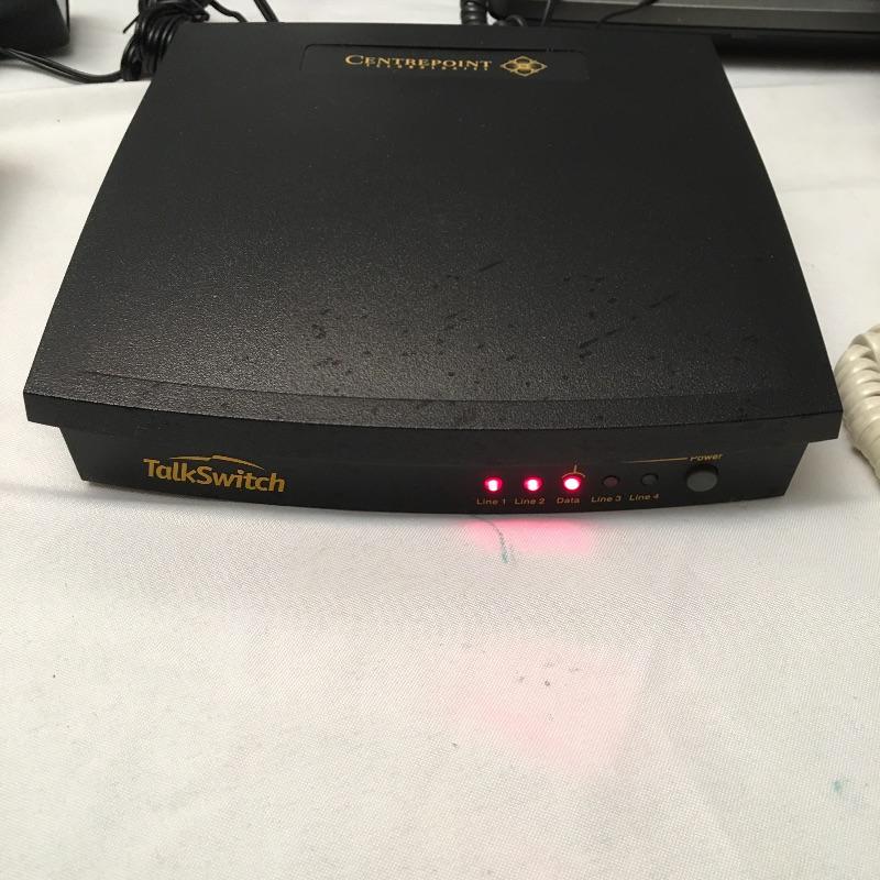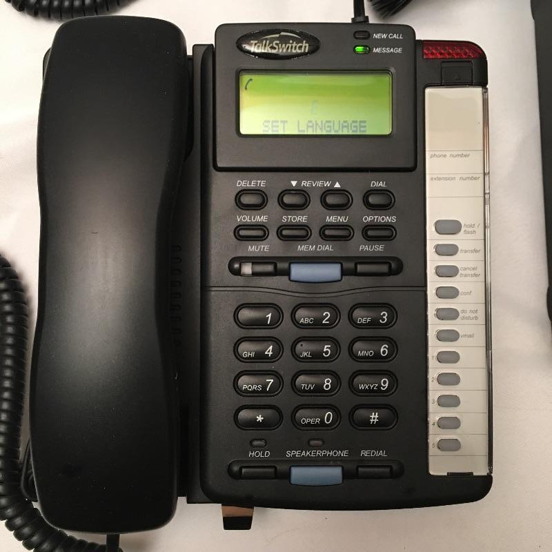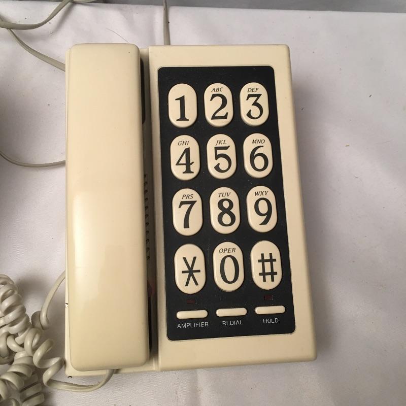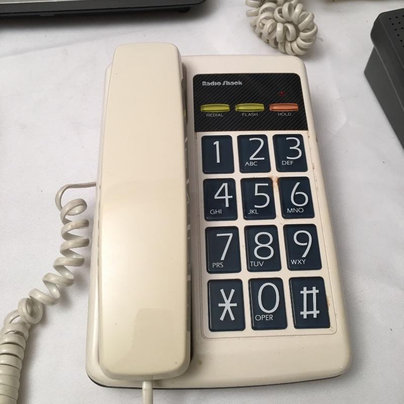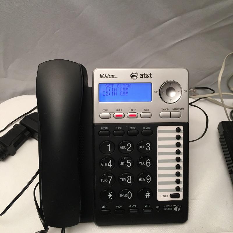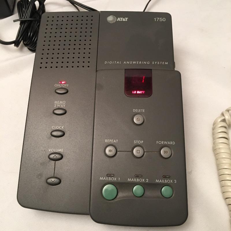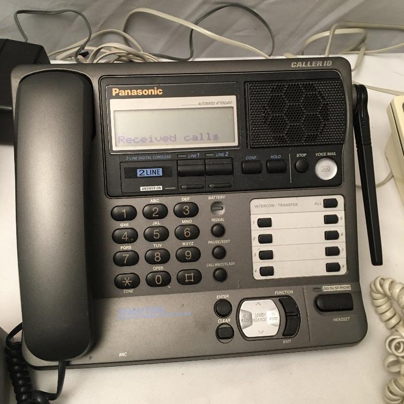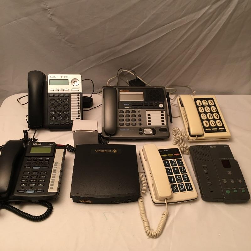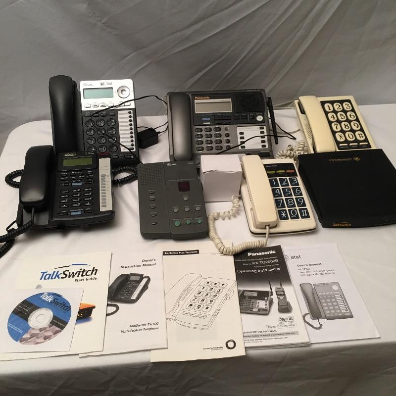 Phones and answering machine. Lot includes Talk Switch Phone, Panasonic KX-TG2000B, AT&T ML17929 phone, AT&T 1750 answering machine and two large numbered phones. All phones powered on when tested, but two are missing power cords.