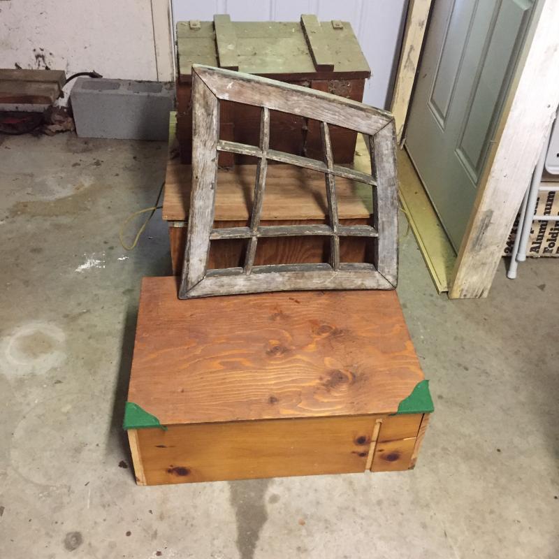 Three wooden boxes for decor or storage. Lot also includes a crooked old window frame that is just waiting for someone to give it some life with some creativity. Largest Box Measures 21”x20”x17”. Local Pickup Only