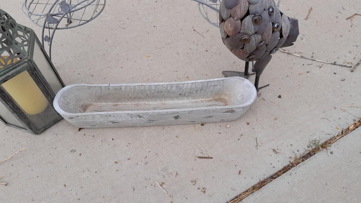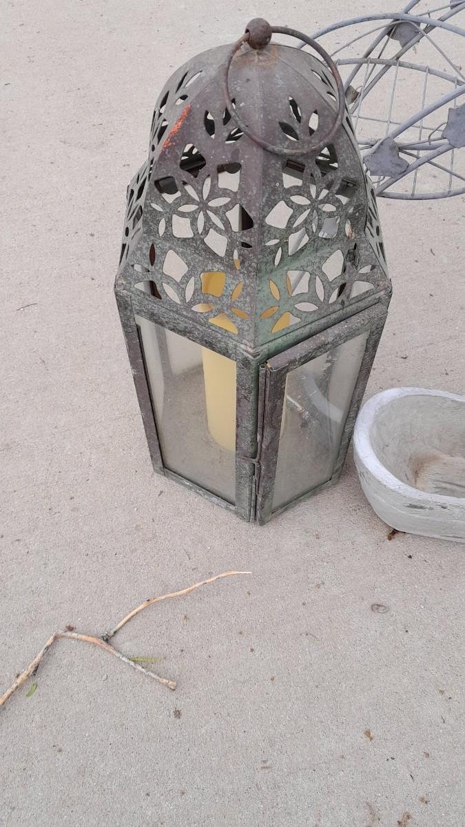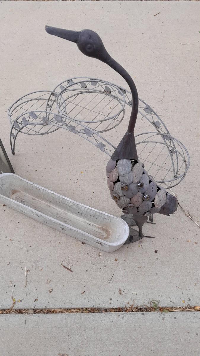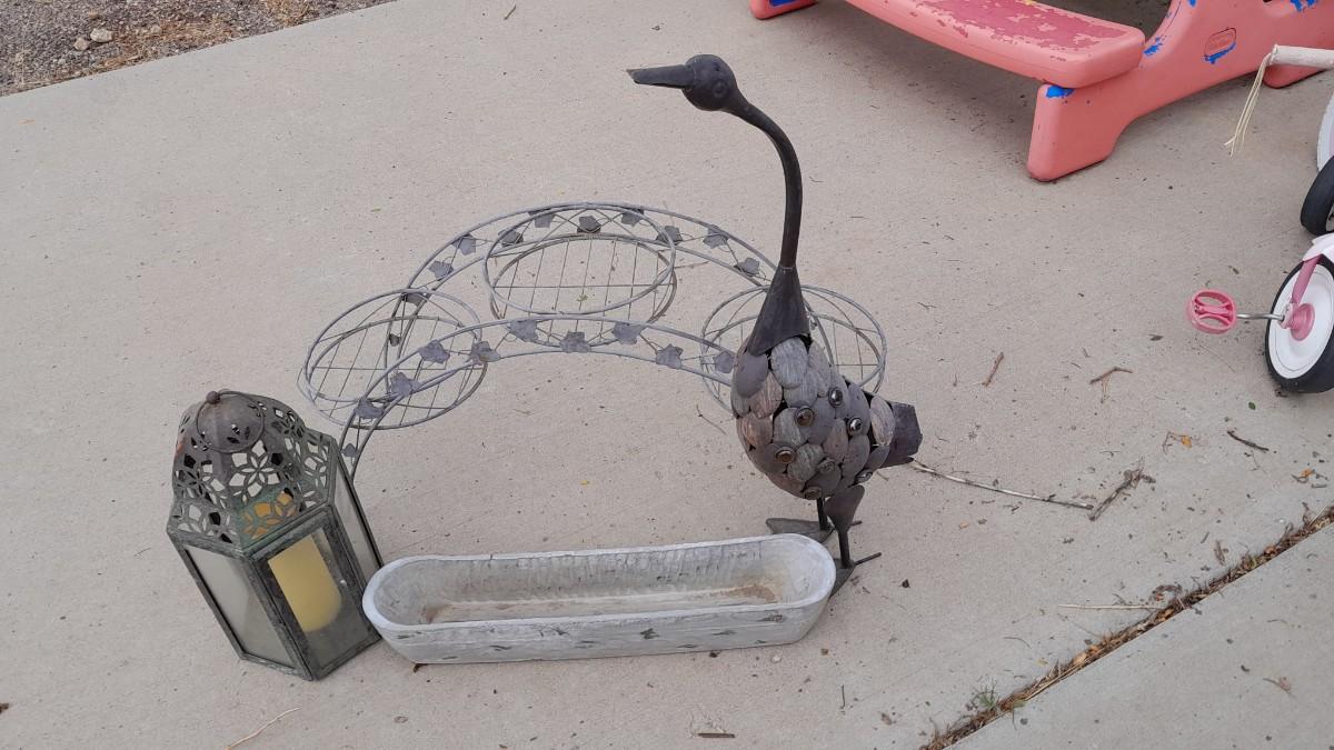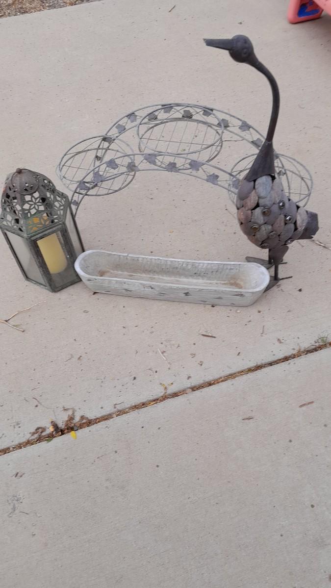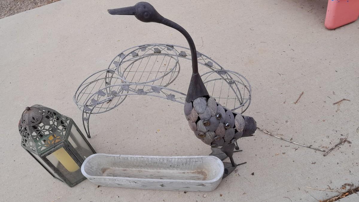 METAL GARDEN GOOSE, LONG TROUGH, METAL AND GLASS CANDLE LANTERN AND THREE-TIERED FLOWER POT ARCH STAND