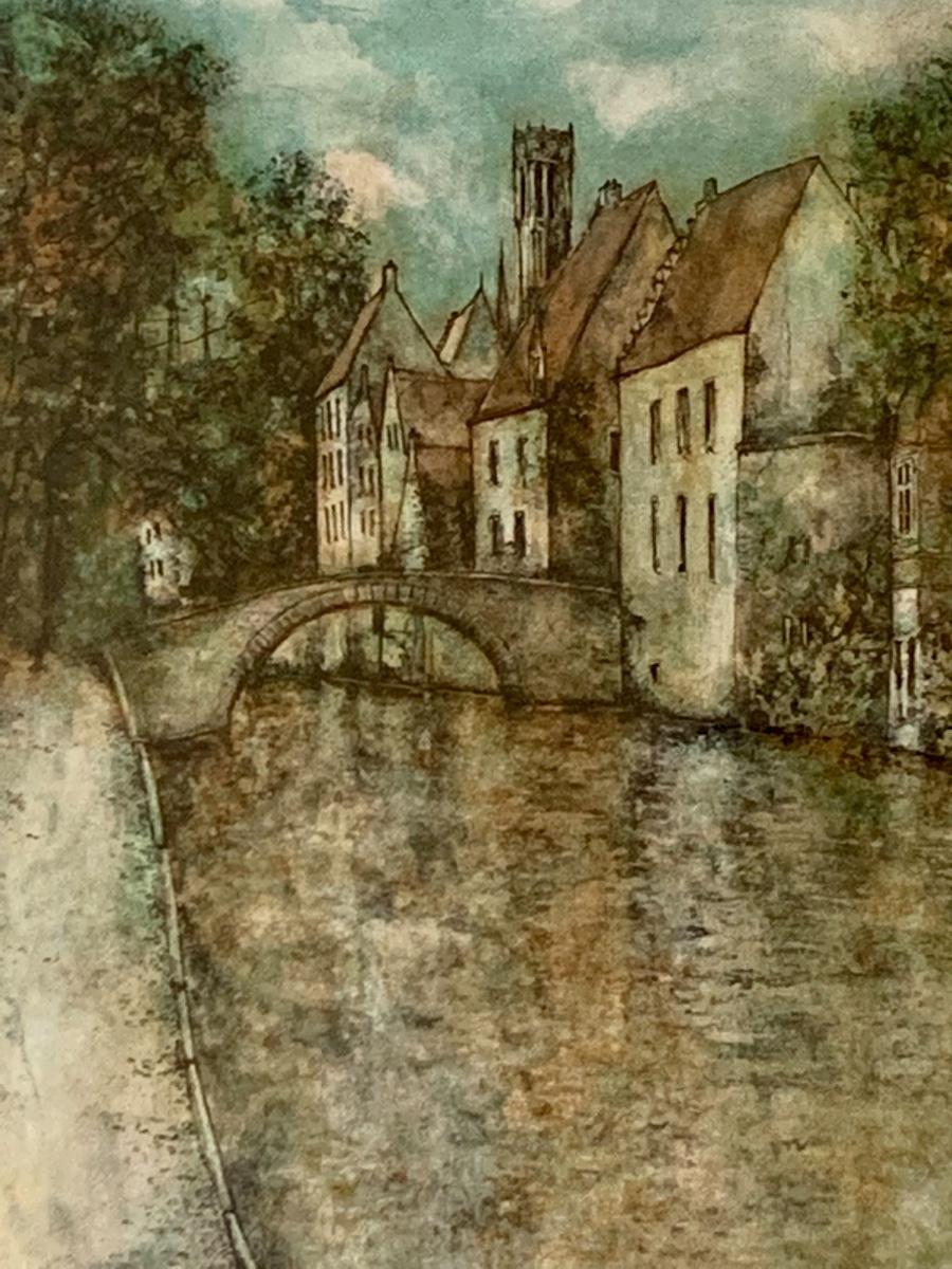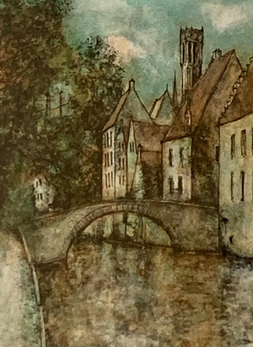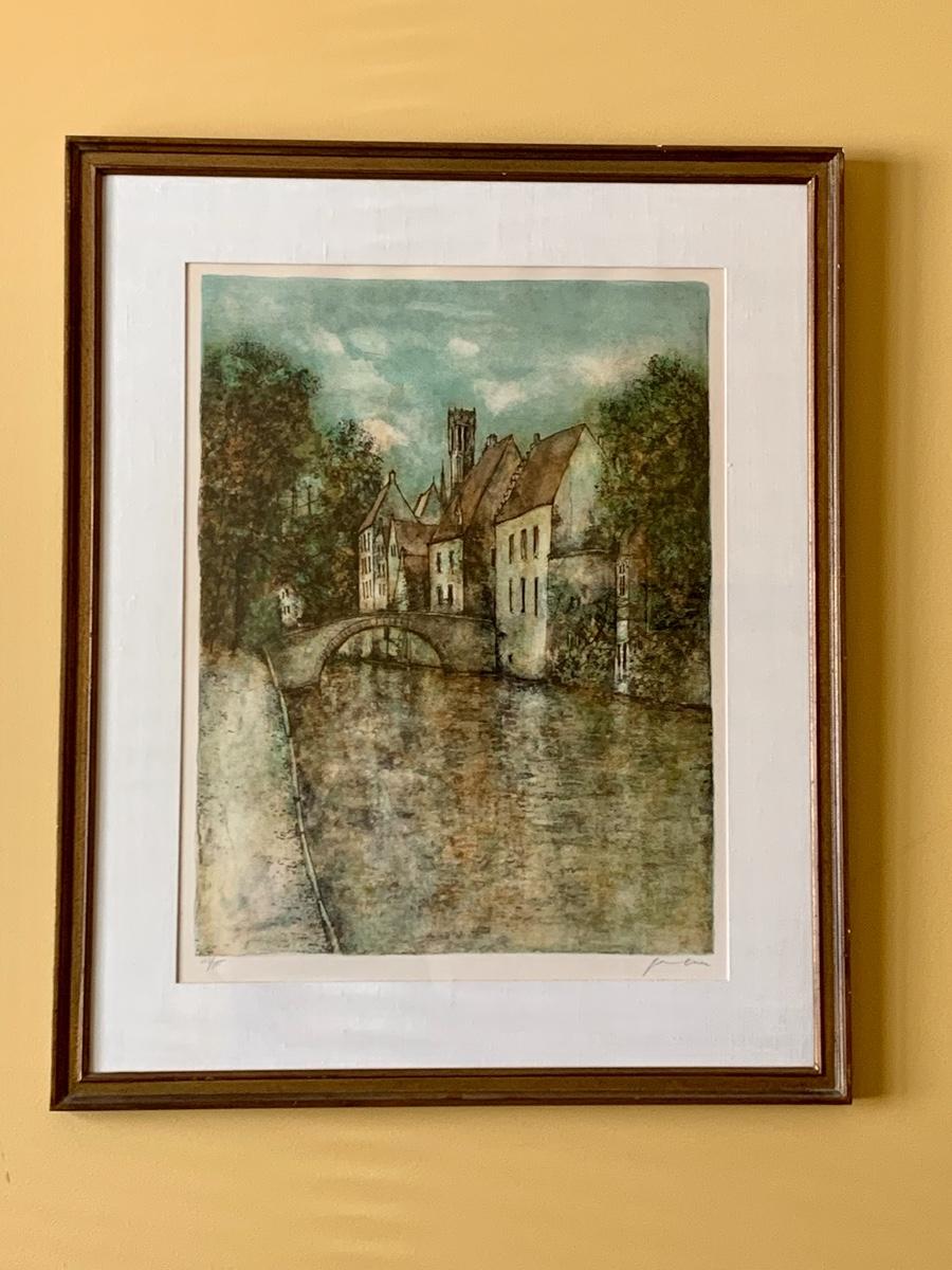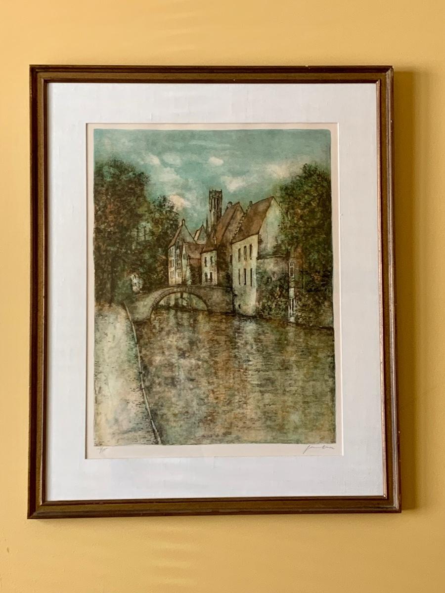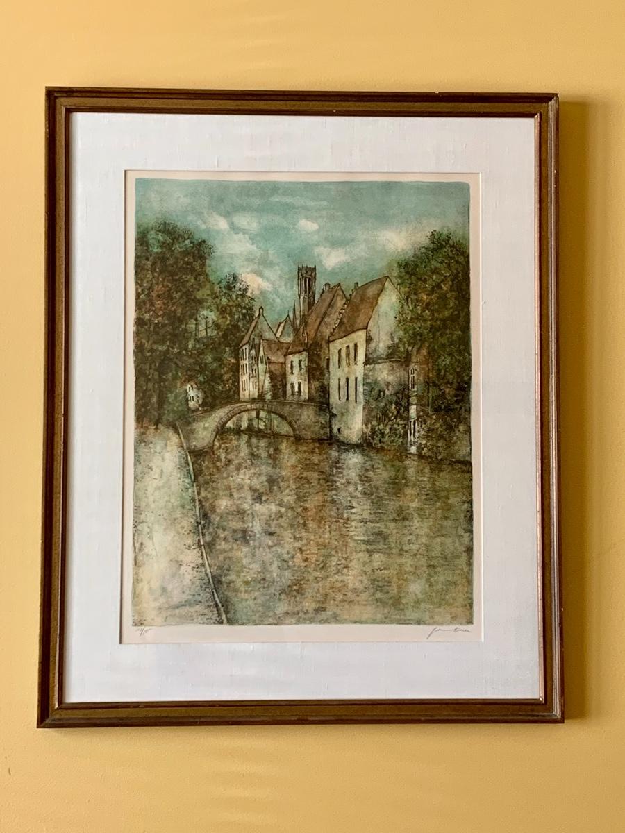 Serene artwork of a canal and bridge in view in this 26 x 31 framed and matted art piece .