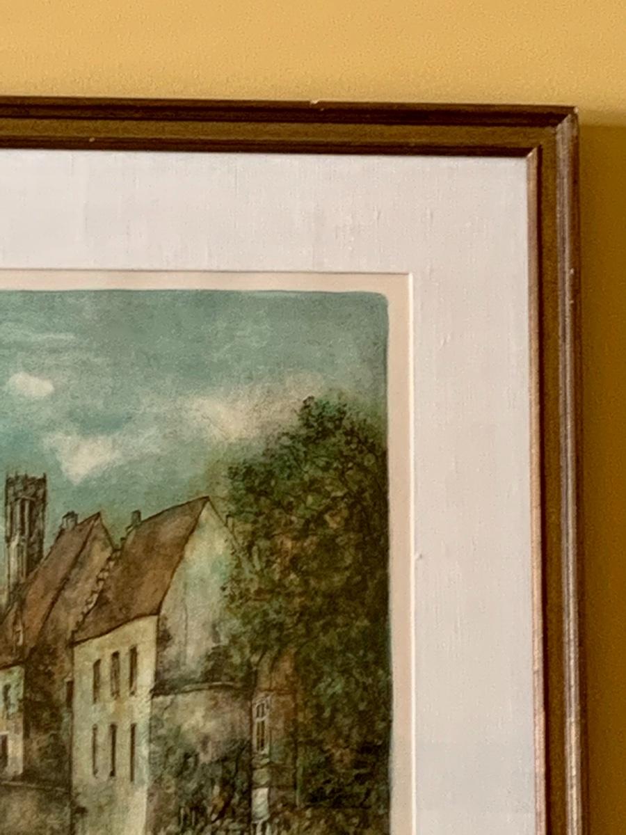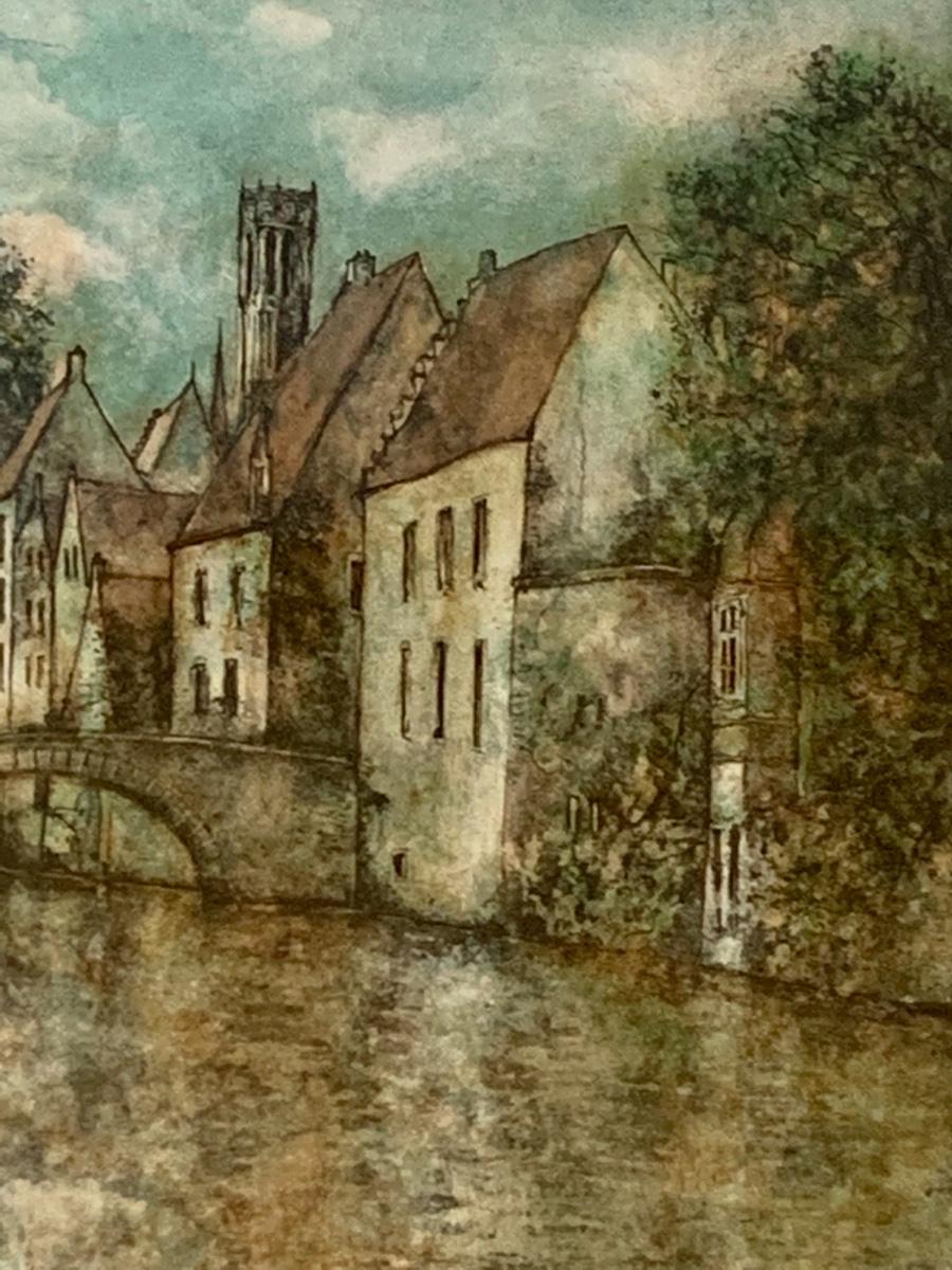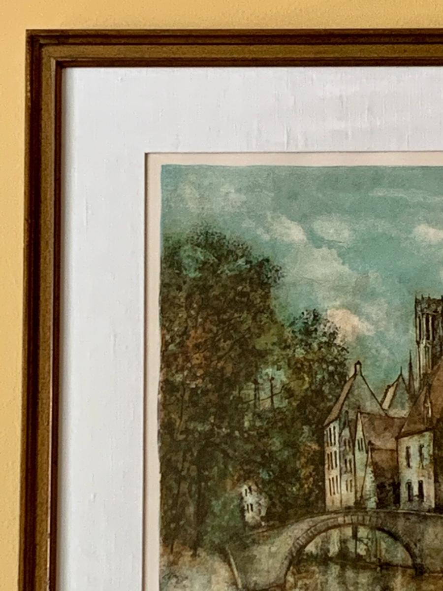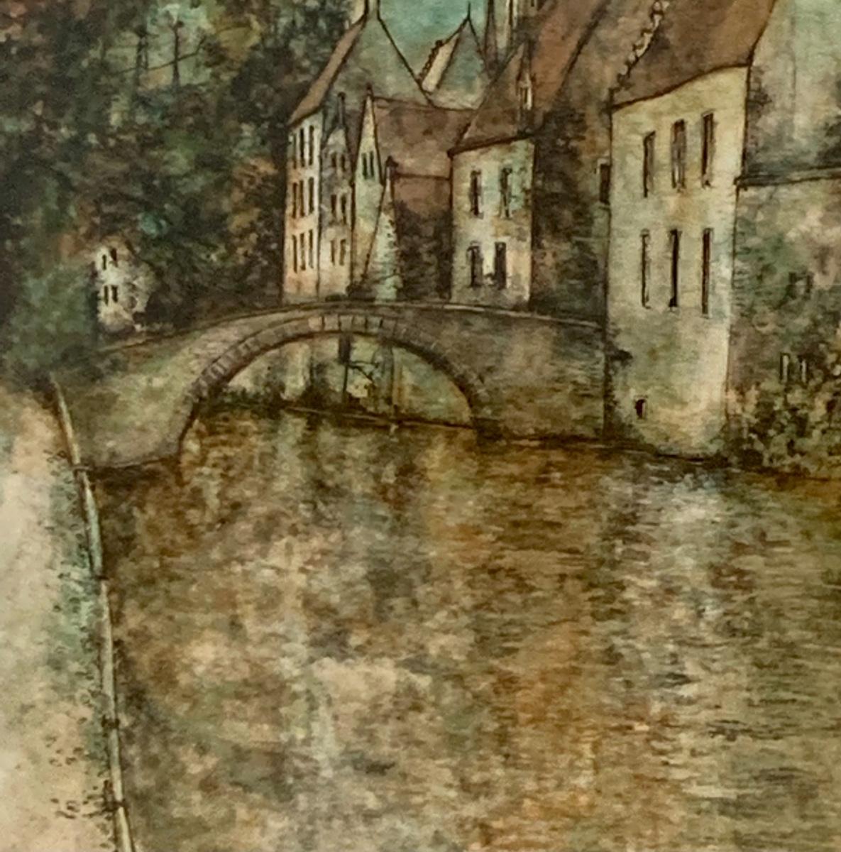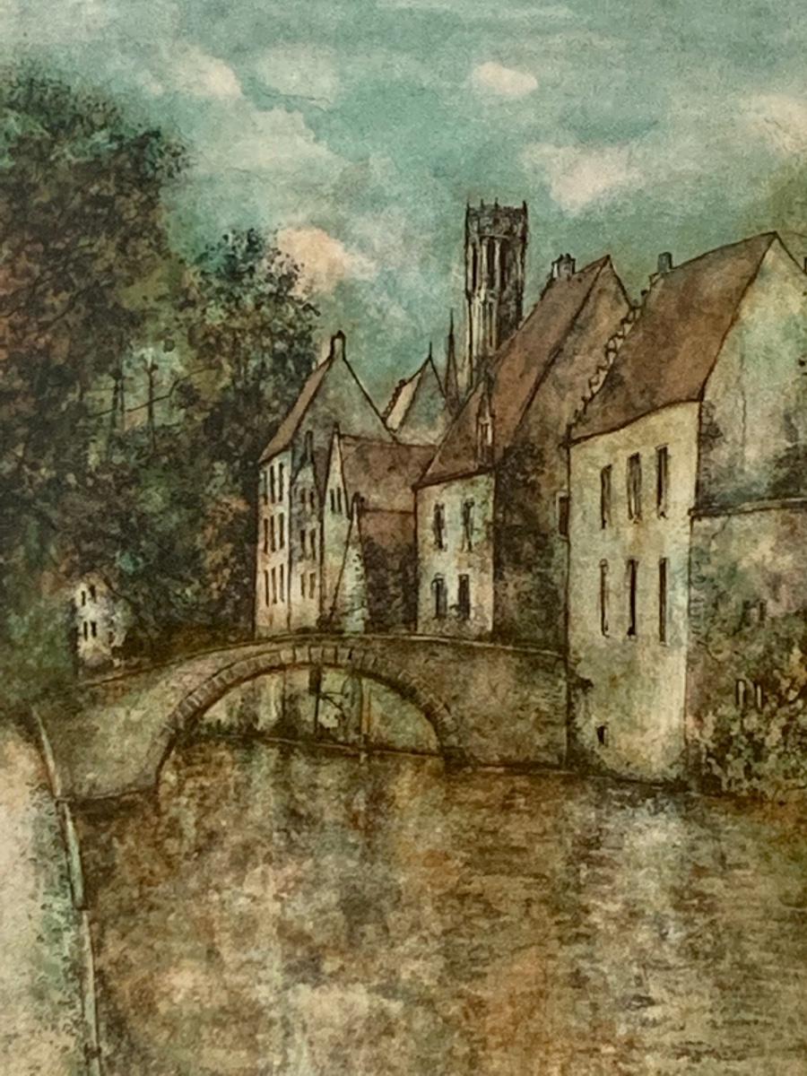 Serene artwork of a canal and bridge in view in this 26 x 31 framed and matted art piece .