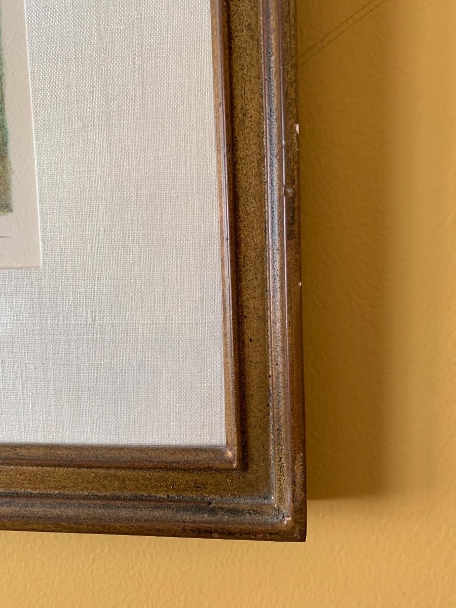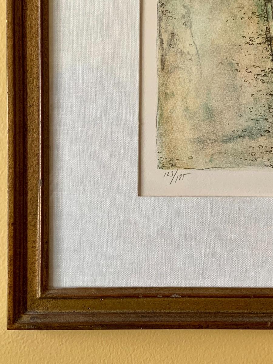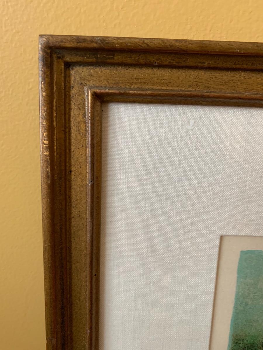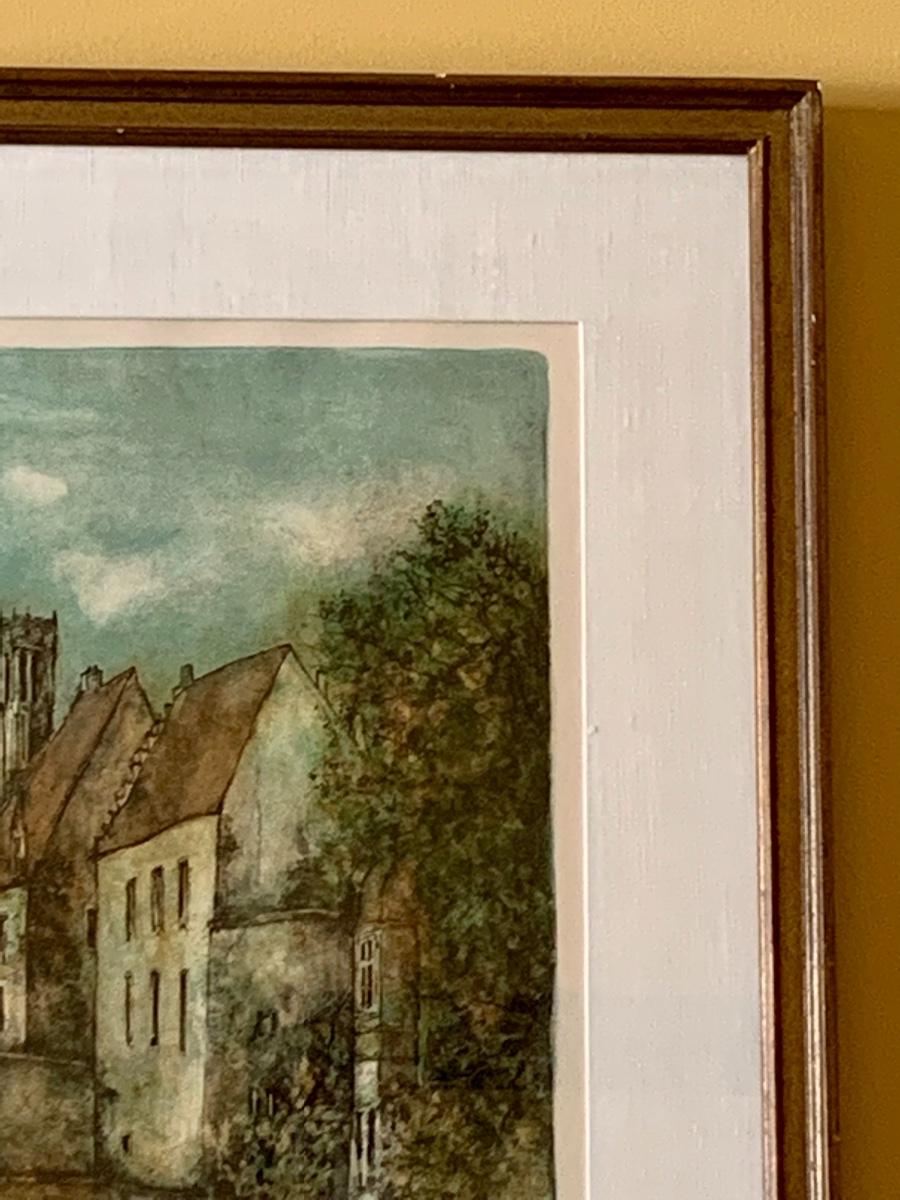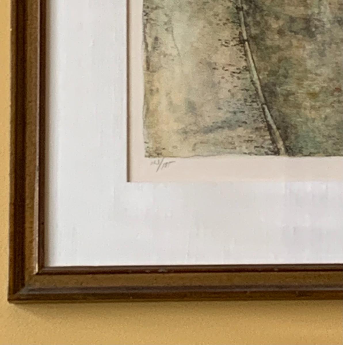 Serene artwork of a canal and bridge in view in this 26 x 31 framed and matted art piece .