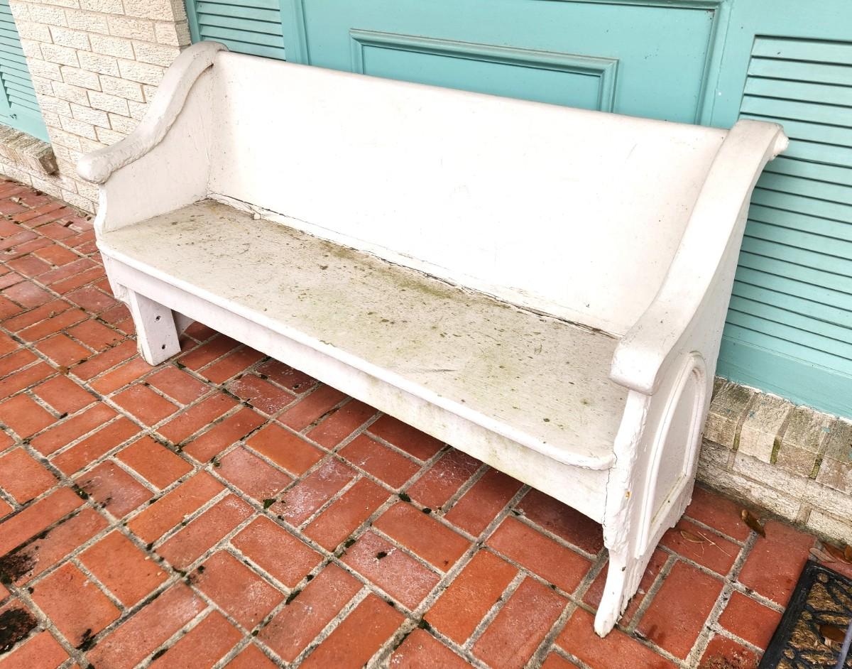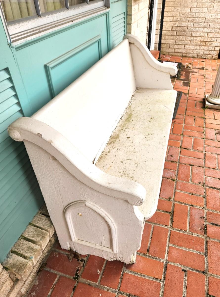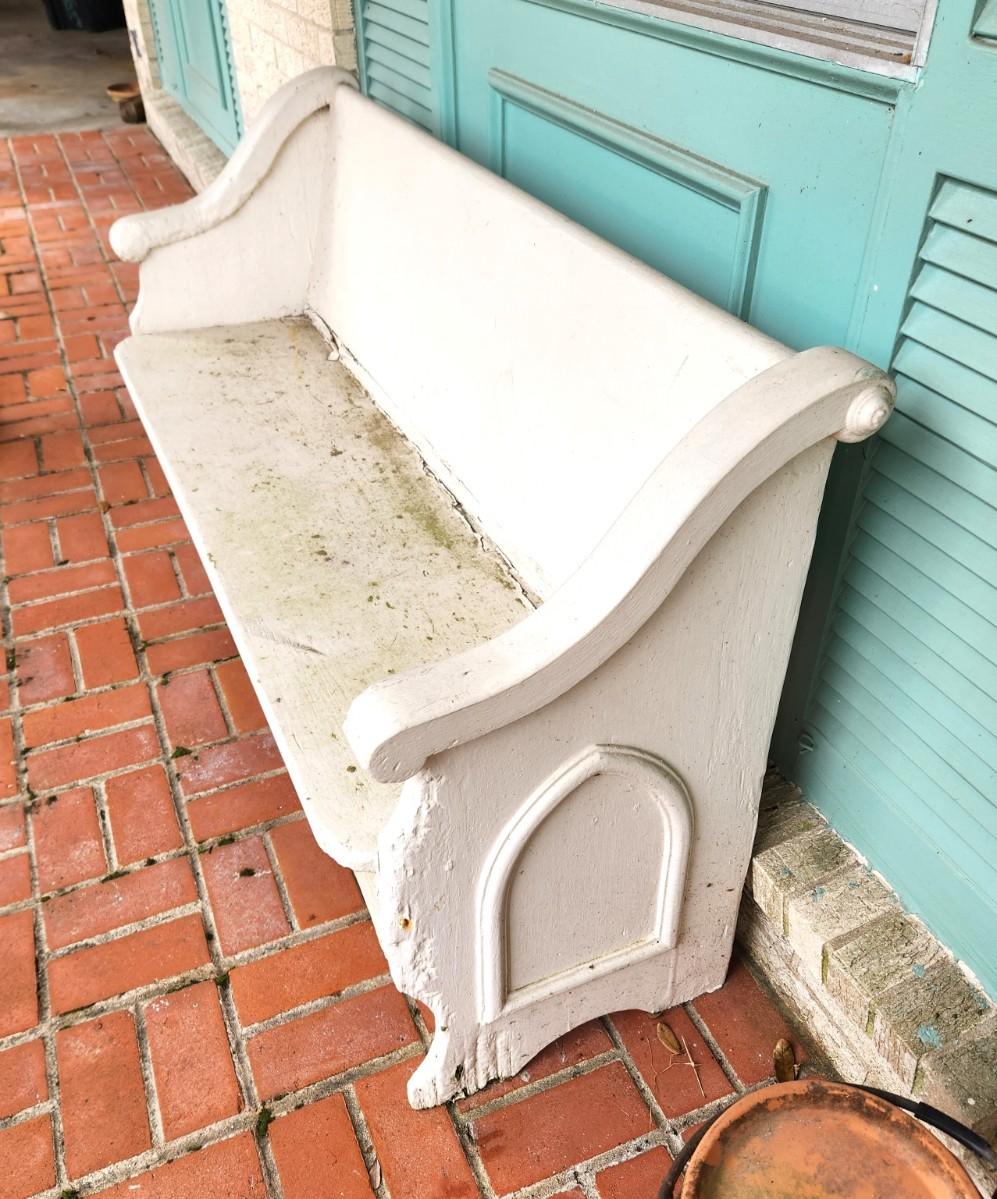 Antique wooden church pew/bench, painted white. Used as a porch bench. 58" long, 38" tall, 17" deep. Antique condition (see photos). Sturdy. This one matches the earlier one posted in style - pretty sure it's Cypress under the paint.