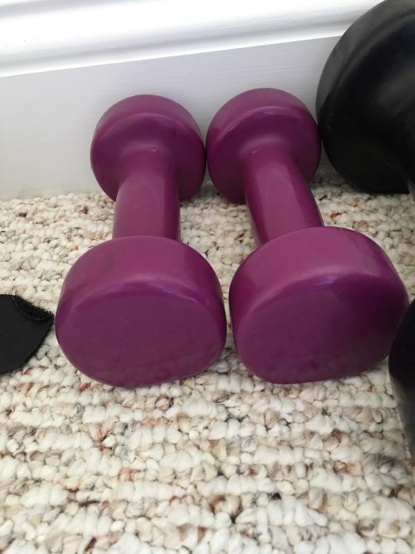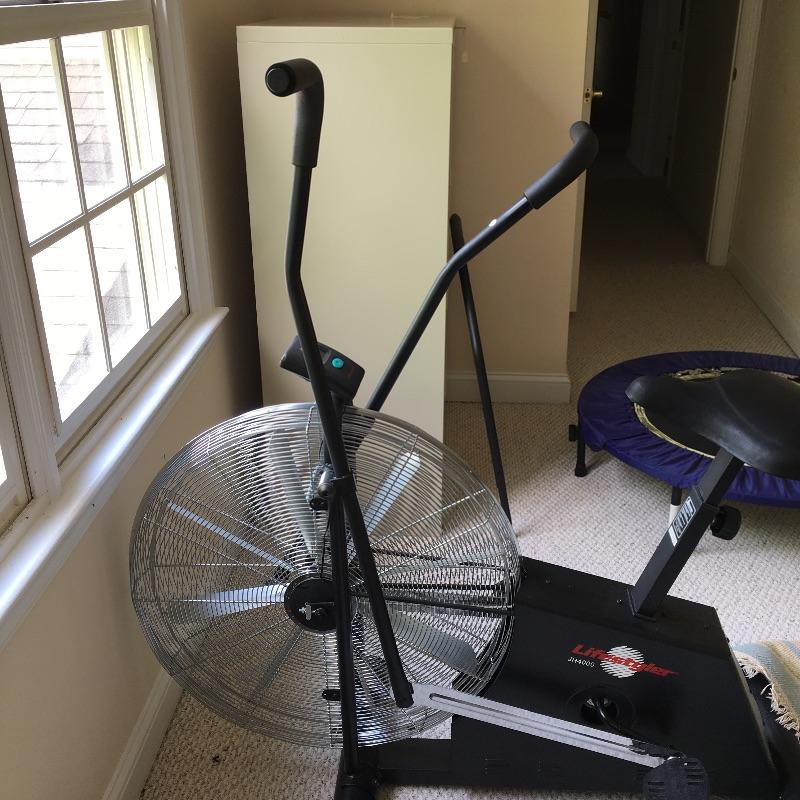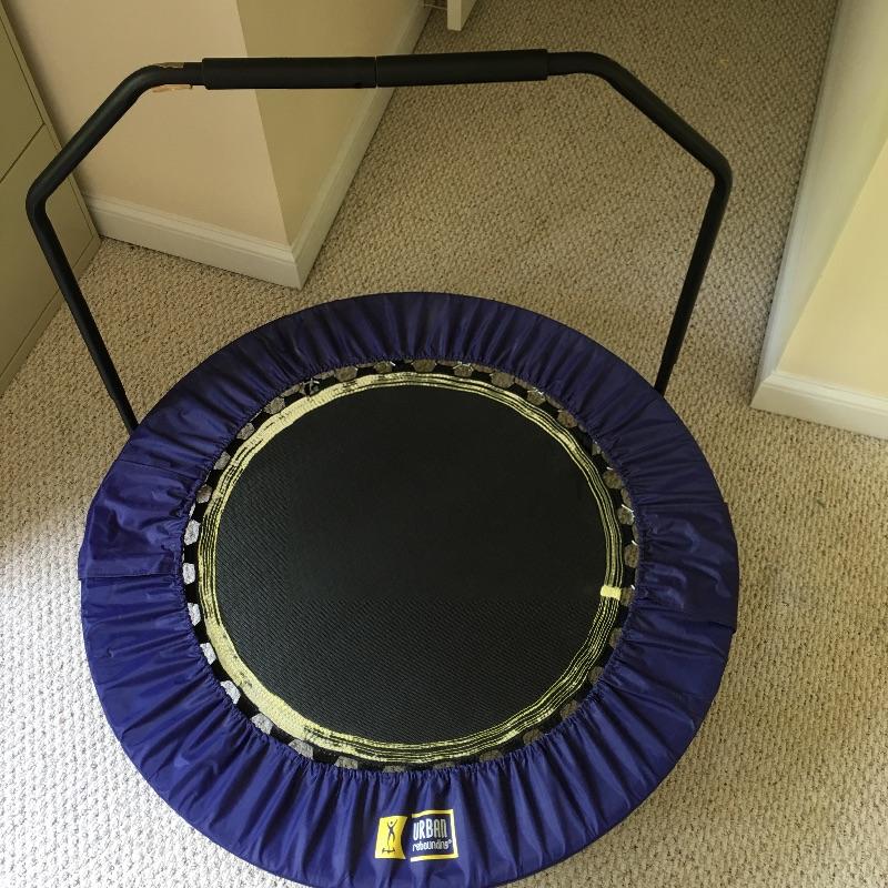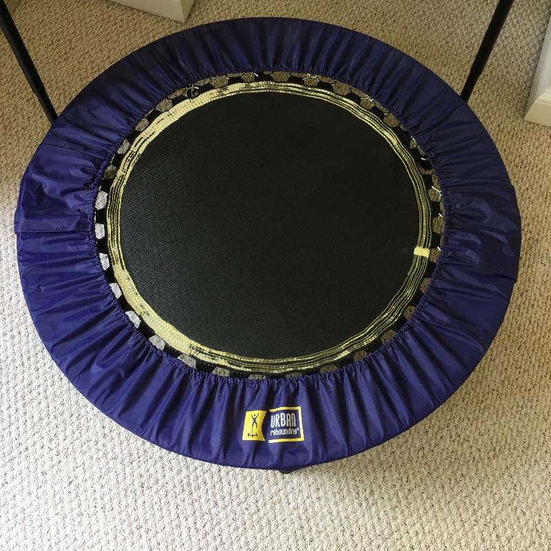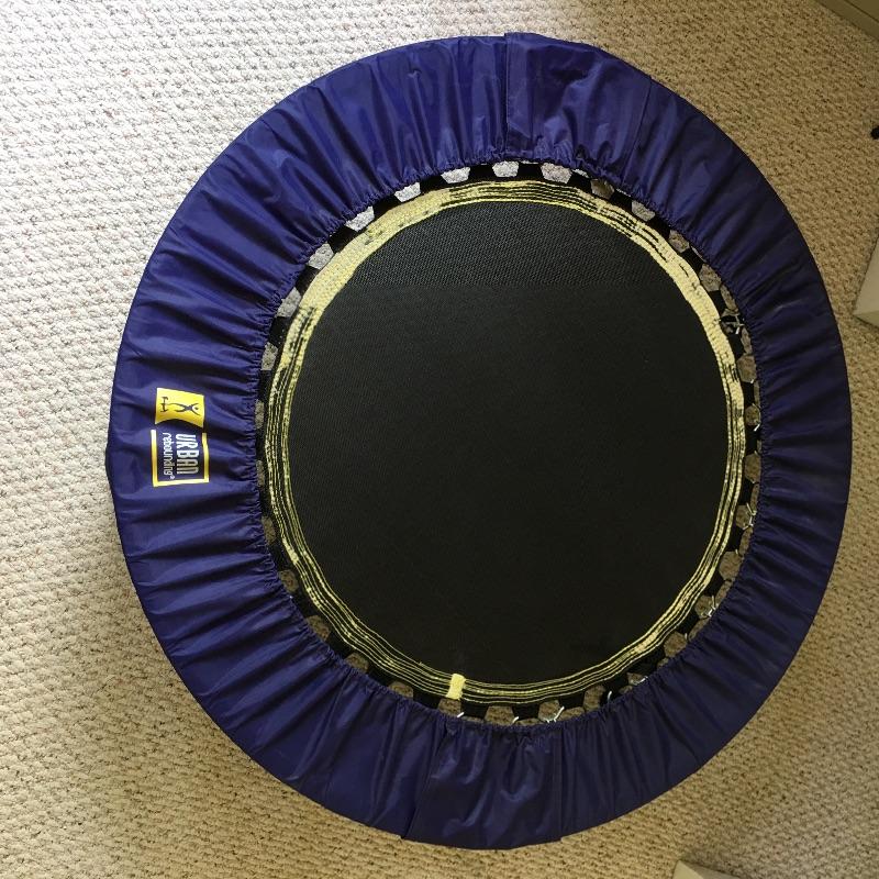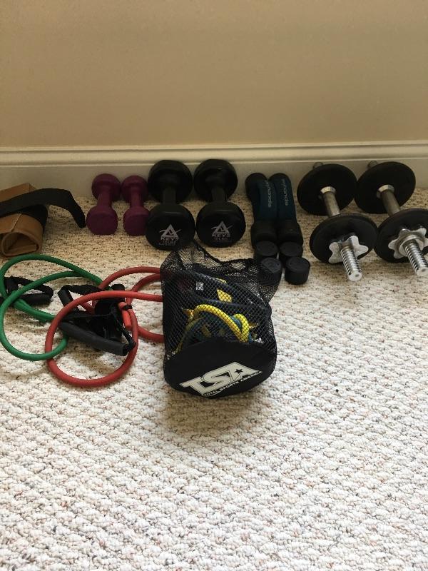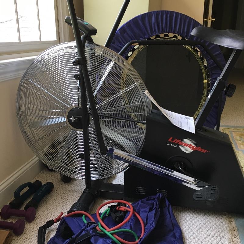 Melange of exercise equipment including lifestyles JH 4000 exercise bike, Urban rebounding folding mini trampoline, assortment of dumbbells and bands. Mini trampoline measures 40” D.