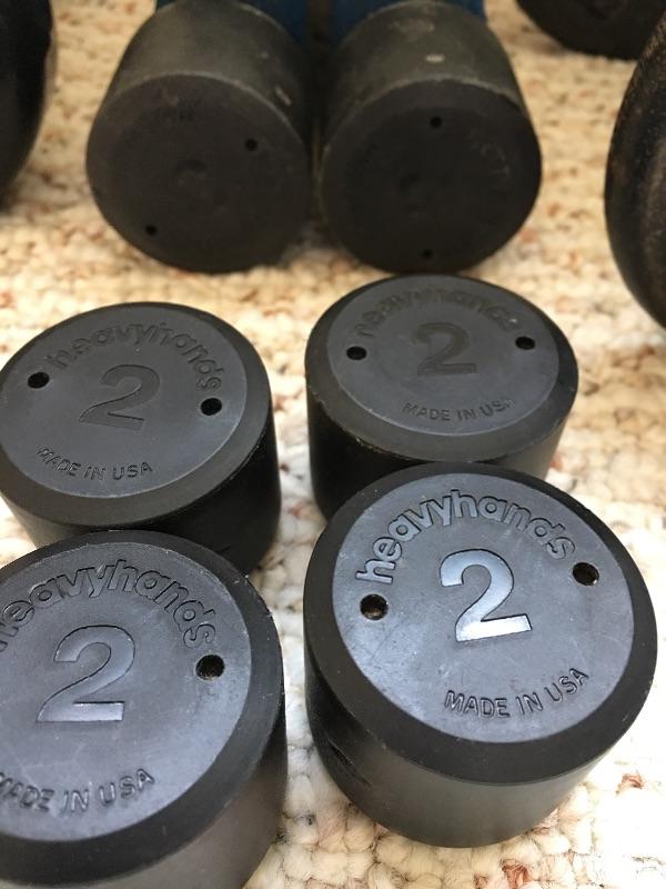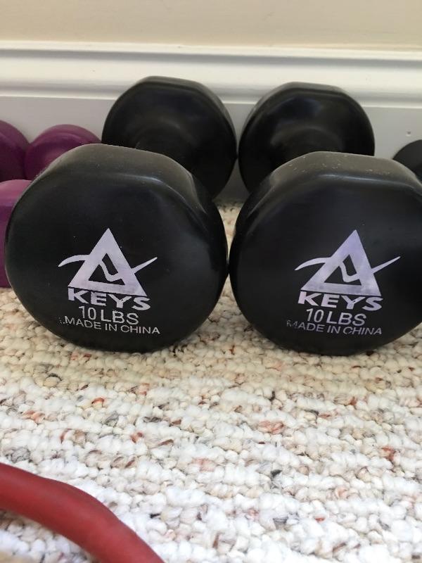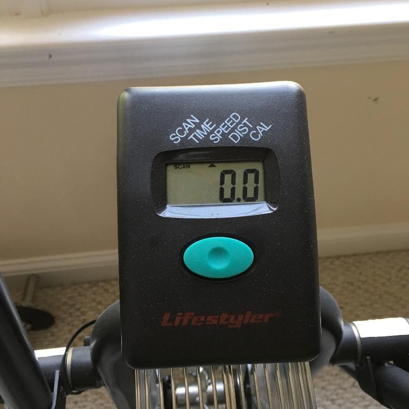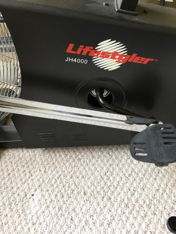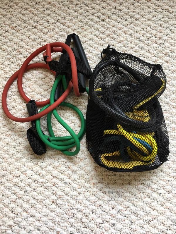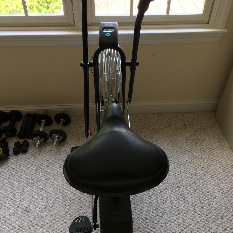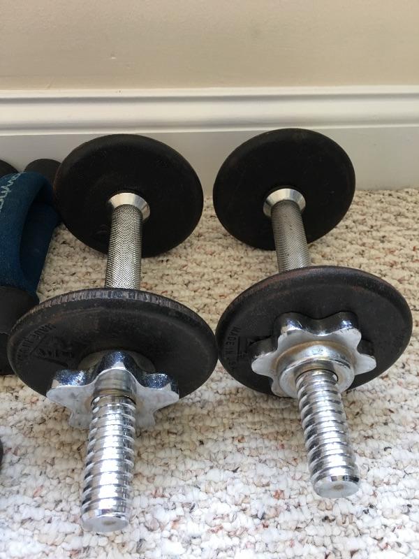 Melange of exercise equipment including lifestyles JH 4000 exercise bike, Urban rebounding folding mini trampoline, assortment of dumbbells and bands. Mini trampoline measures 40” D.