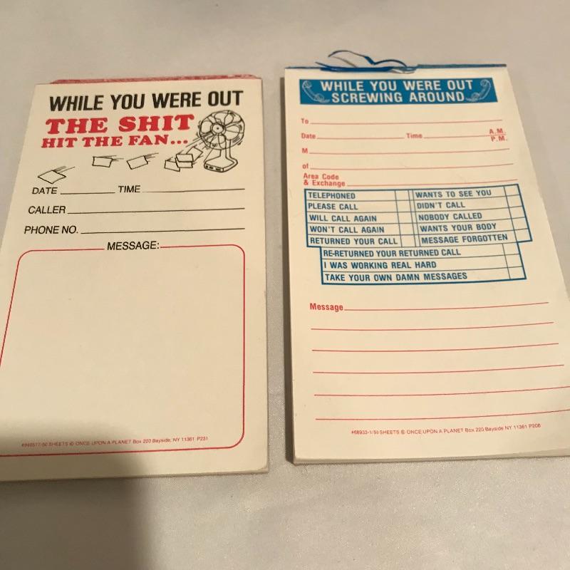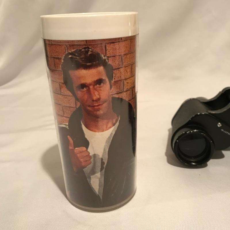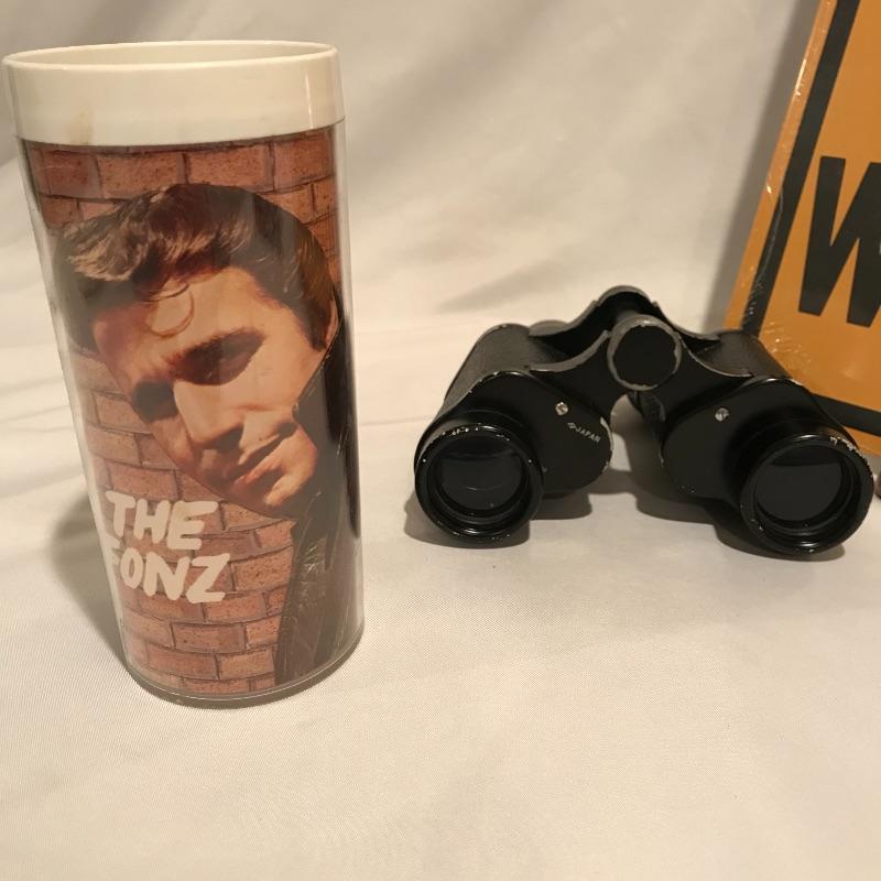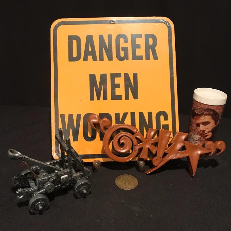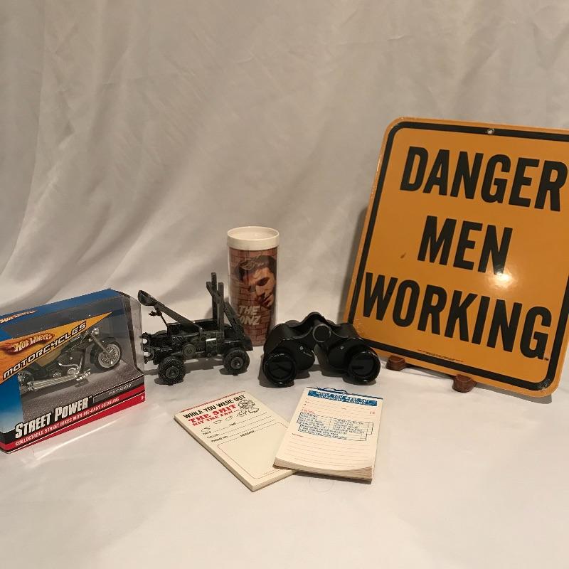 We’ll begin with this collection with the ultimate! Plastic insulated The Fonz tumbler! Although there are many to choose from, some highlights of the lot are a 1.75” Goldfield Nevada coin and a wall hanging of an expletive in quotations. Collection also includes other essentials like double bladed pocket knife, a mini heavy metal working sling shot, and a Fat Ride Hot Wheels motorcycle. Collection also includes an Ande Rooney high quality metal “Caution Men Working” sign, a 6 x 30 pair of binoculars and funny, slightly used “While you were out” message pads. Sign measures 10.75” x 12.25”. Shipping available.