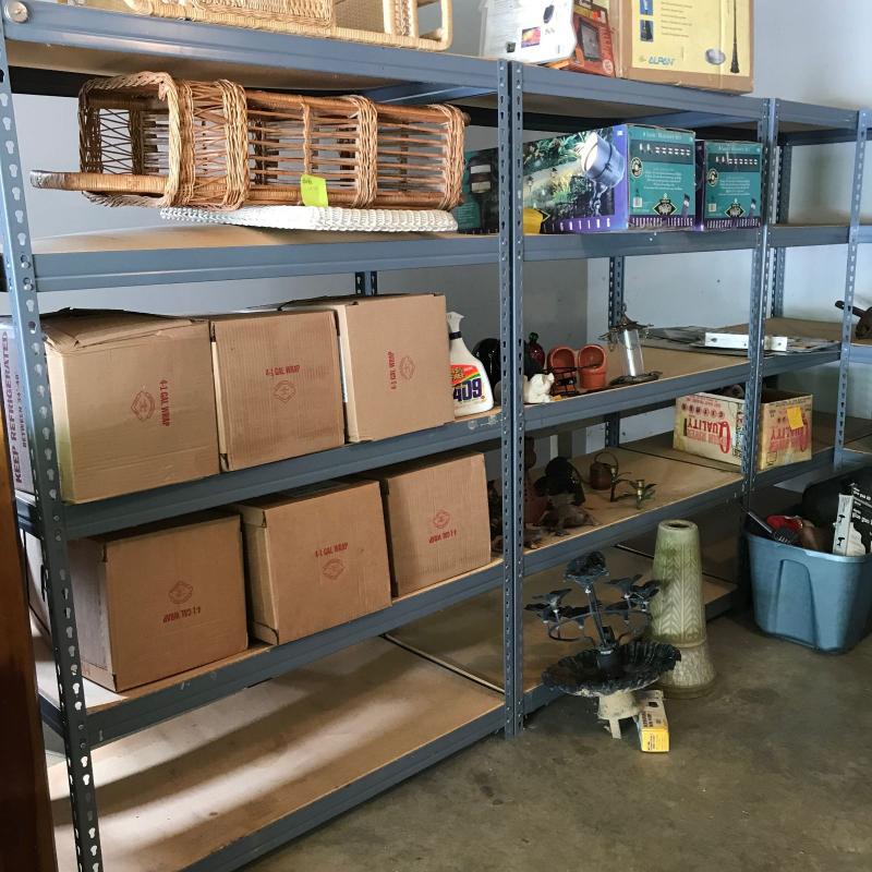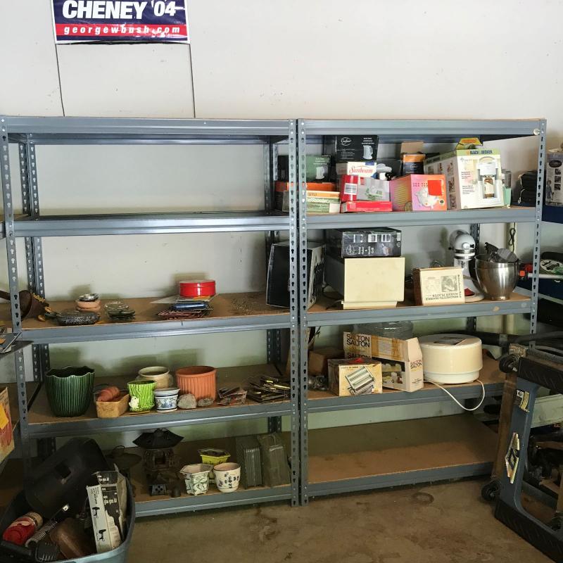 Lot includes six utility shelves. All need replacement particle board shelves as they are missing or warped. Otherwise, metal parts are fine. No shipping. Local pick up only. Contents on shelves are NOT included in this lot.