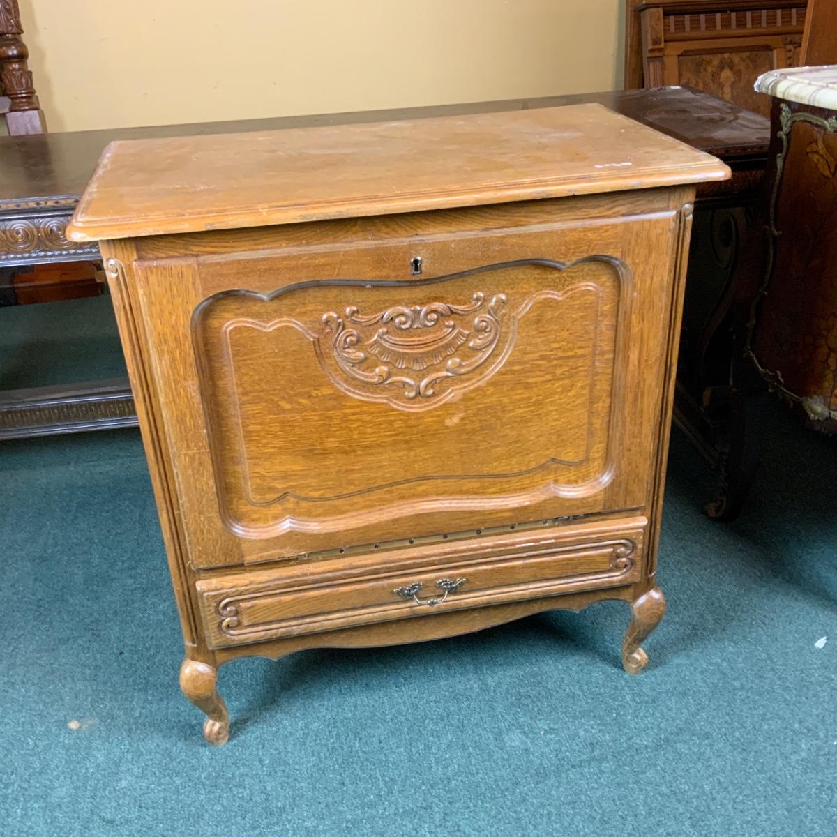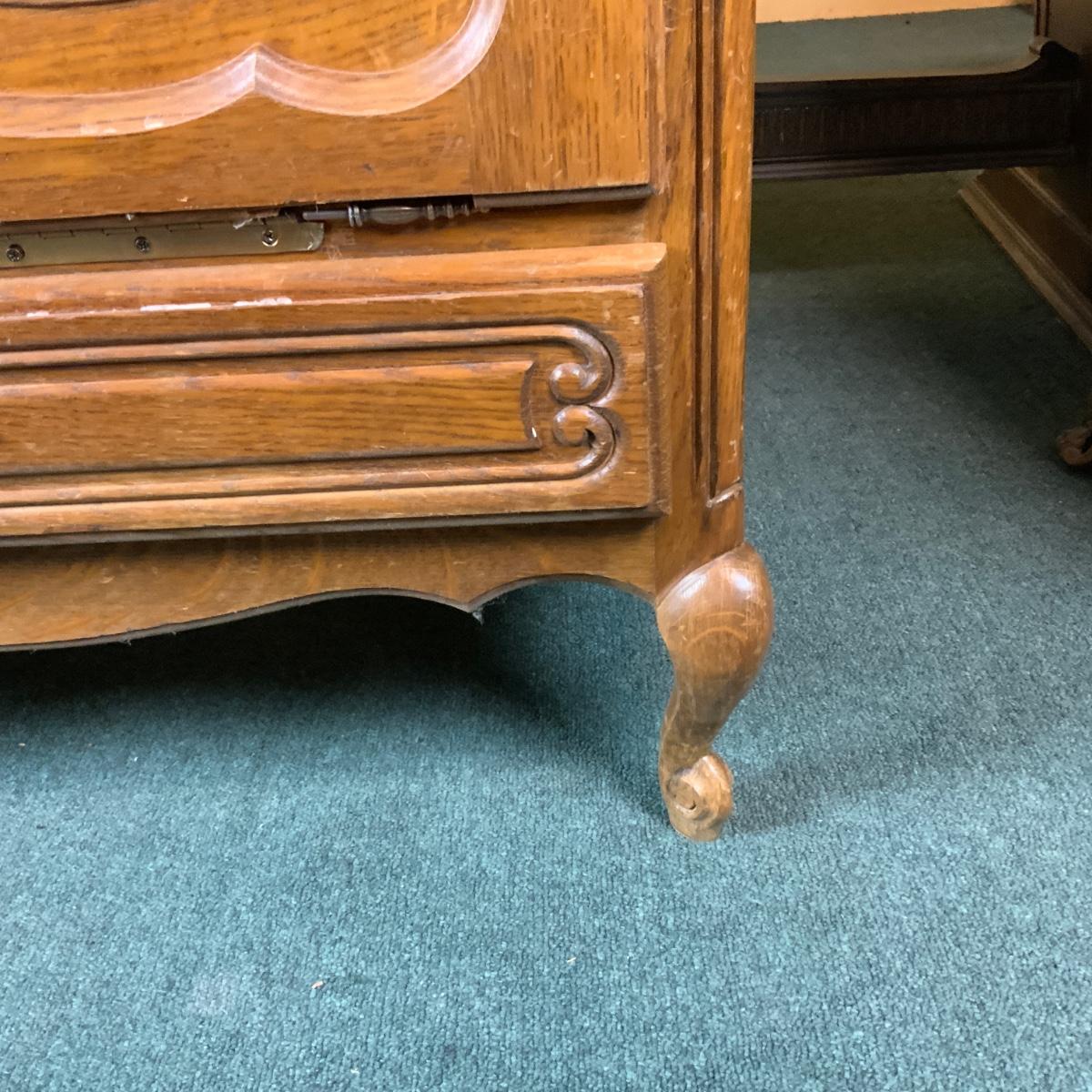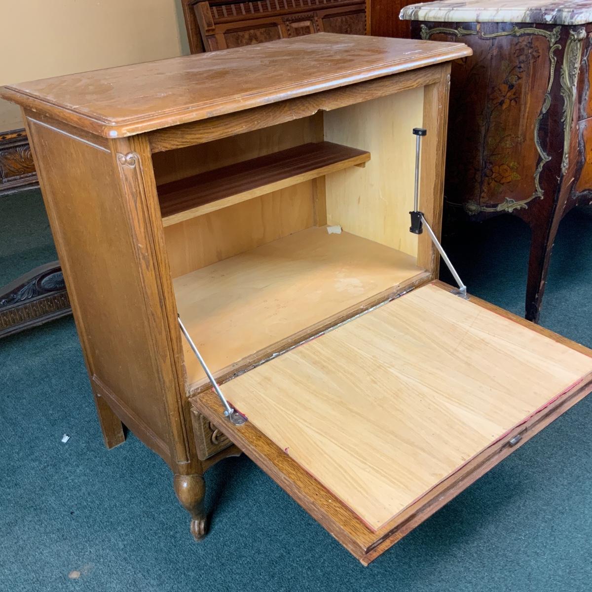Oak Bar. Nice construction lots of storage. //::\\ Please see photos for details and condition. No attempt has been made to hide any imperfections. All items listed in this auction are warehouse items, and need to be cleaned. A majority of the items need restoration as well. All items are sold AS IS and WITHOUT GUARANTEE. If you are uncertain about an item, DO NOT BID. Due to the nature of this online auction in-person inspection is HIGHLY recommended. All Sales are FINAL. Pick Up Times are FIRM. Please confirm with your own schedule that you can pick up in the scheduled times listed in the Terms and Conditions. Any questions please message the auctioneer. DO NOT Contact The Harp Gallery.